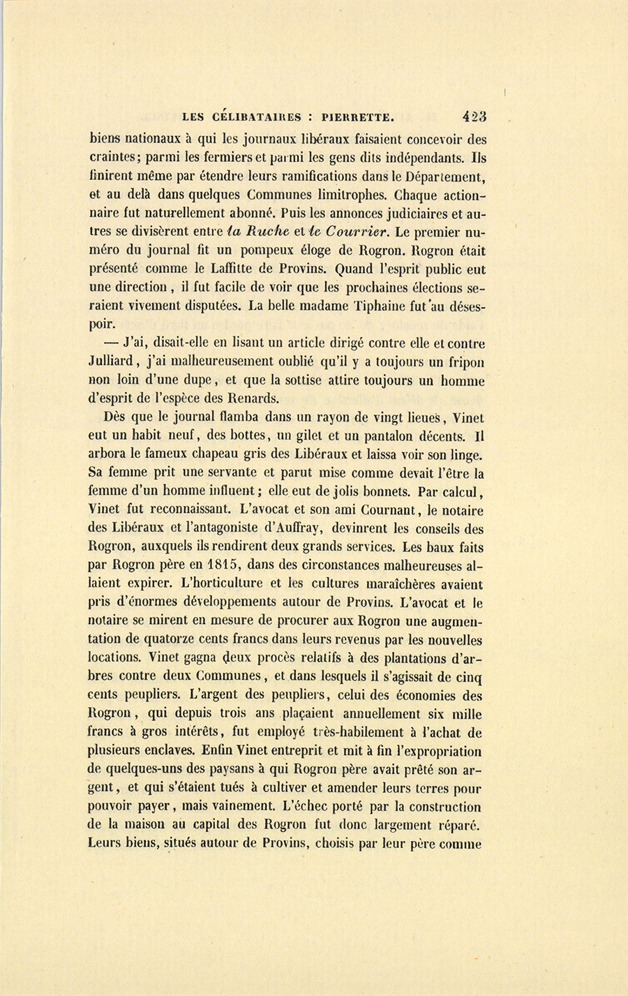 Vinet quitta le Palais et alla chez les principaux organes de son parti expliquer la situation de Rogron qui n’avait jamais donné une chiquenaude à sa cousine, et dans qui le Tribunal voyait, dit-il, moins le tuteur de Pierrette que le grand électeur de Provins.