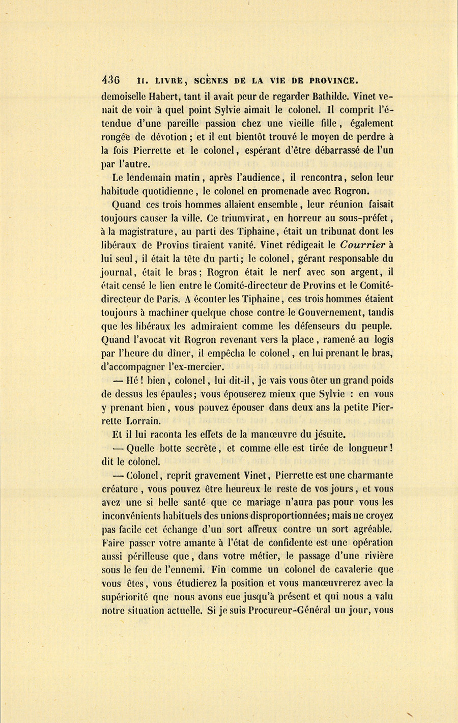 Ce mot n’est évidemment pas de lui. Sa santé chancelante fait espérer à madame Rogron de pouvoir épouser dans peu de temps le général marquis de Montriveau, pair de France, qui commande le Département et qui lui rend des soins. Vinet demande très-proprement des têtes, il ne croit jamais à l’innocence d’un accusé. Ce Procureur-Général pur-sang passe pour un des hommes les plus aimables du ressort, et il n’a pas moins de succès à Paris et à la Chambre ; à la Cour, il est un délicieux courtisan.