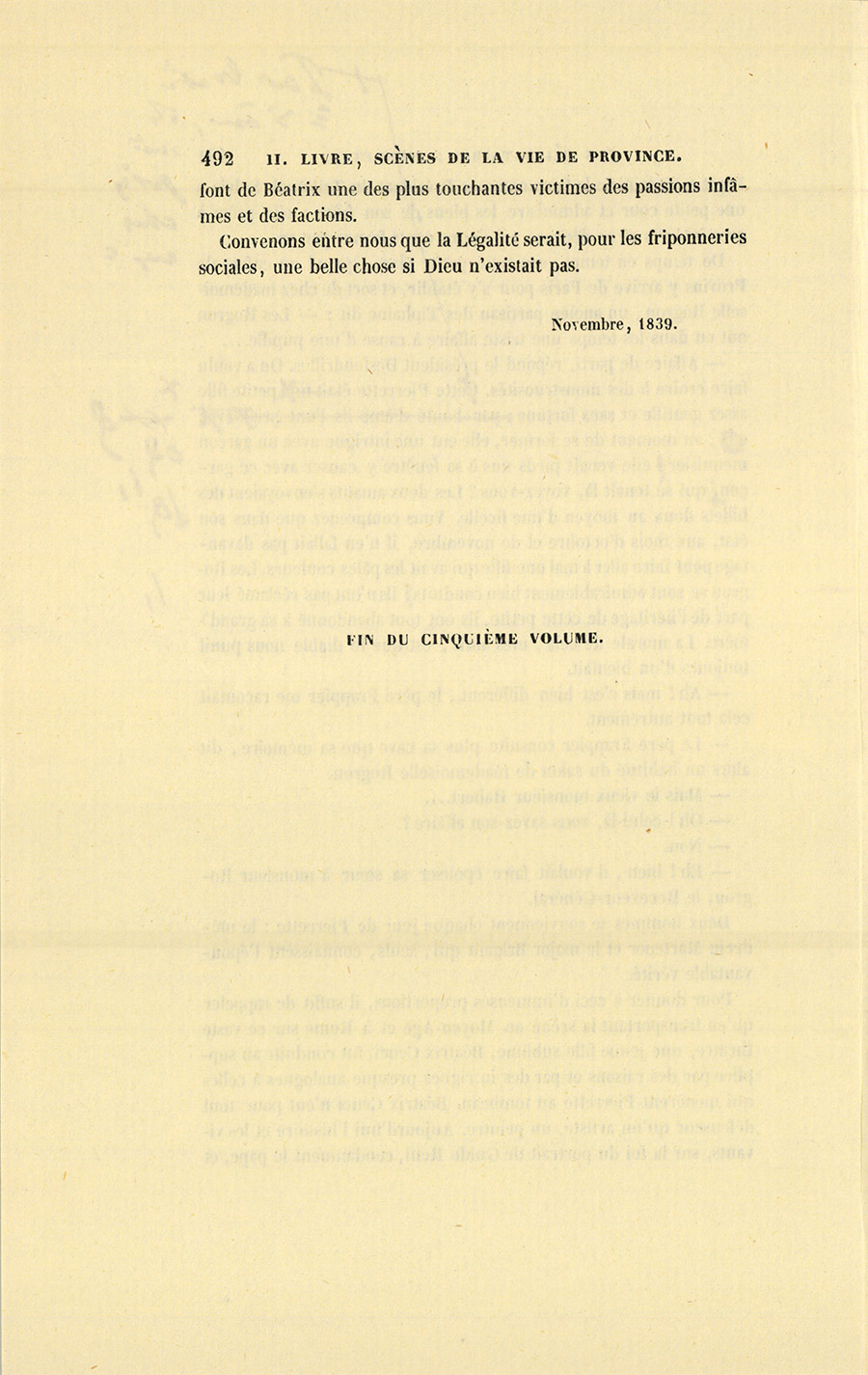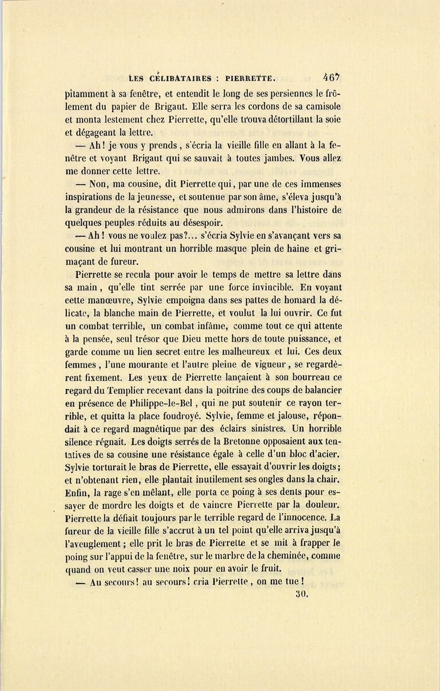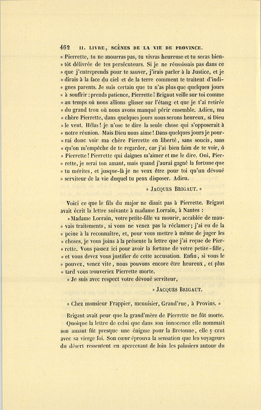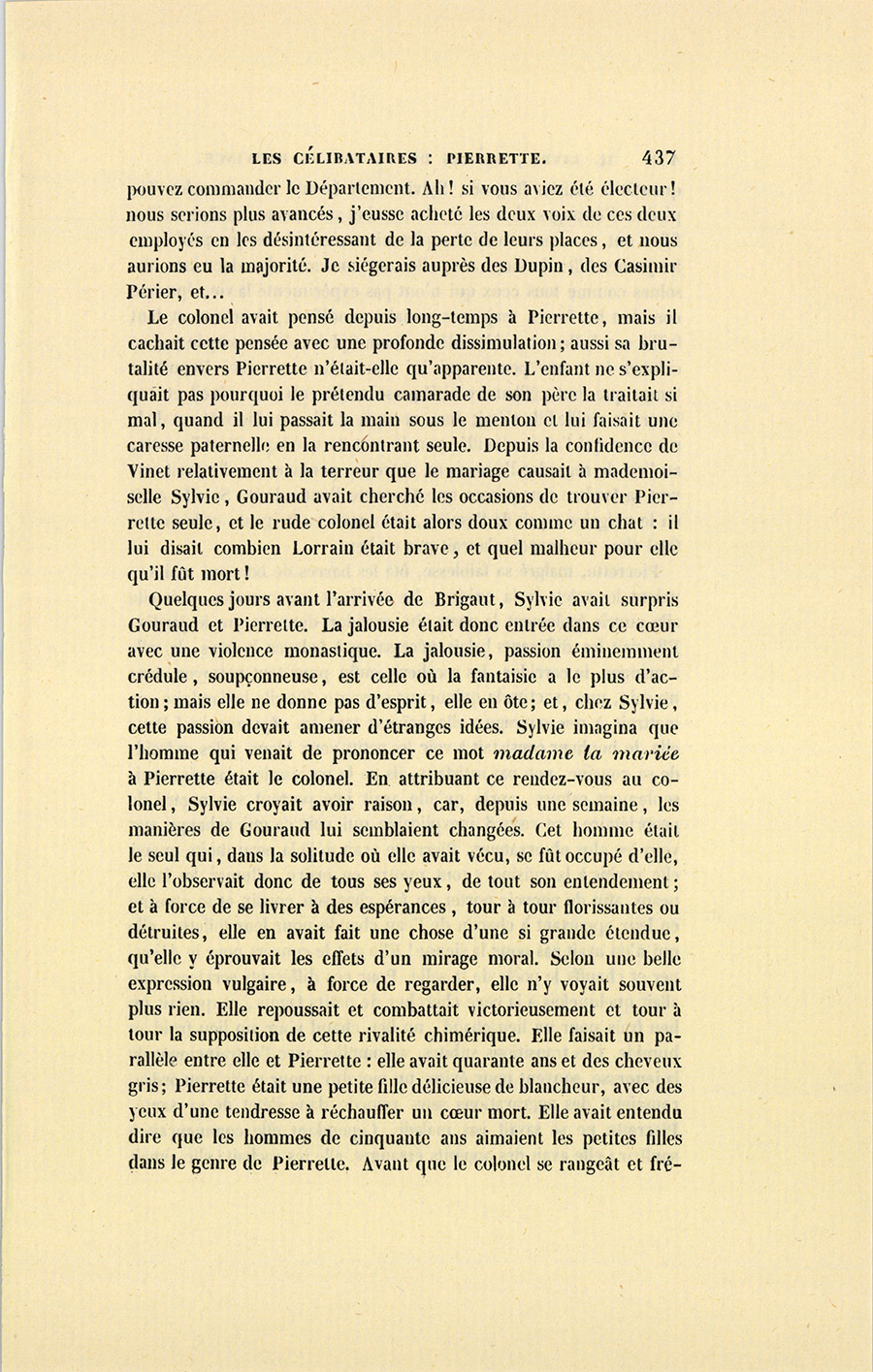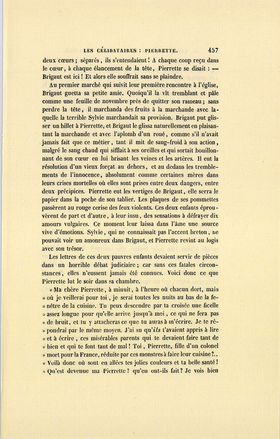 Brigaut quitta Provins après avoir vu combler la fosse où Pierrette fut enterrée, et alla de son pied à Paris. Il écrivit une pétition à la Dauphine pour, en considération du nom de son père, entrer dans la Garde Royale où il fut aussitôt admis. Quand se fit l’expédition d’Alger, il écrivit encore à la Dauphine pour obtenir d’être employé. Il était sergent, le Maréchal Bourmont le nomma sous-lieutenant dans la Ligne. Le fils du major se conduisit en homme qui voulait mourir. La mort a jusqu’à présent respecté Jacques Brigaut, qui s’est distingué dans toutes les expéditions5 récentes sans y trouver une blessure. Il est aujourd’hui chef de bataillon dans la {p. 490} Ligne. Aucun officier n’est plus taciturne ni meilleur. Hors le service, il reste presque muet, se promène seul et vit mécaniquement. Chacun devine et respecte une douleur inconnue. Il possède quarante-six mille francs qui lui ont été légués par la vieille madame Lorrain, morte à Paris en 1829.
