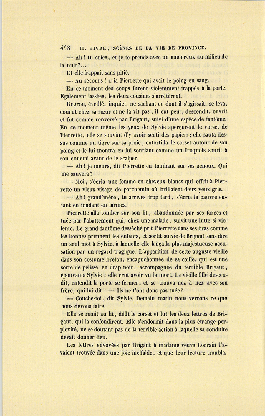 Brigaut et le plombier arrivèrent assez à temps chez monsieur Auffray pour décider par leur force brutale une infâme et horrible question judiciaire. La chambre mortuaire, pleine de monde, offrit aux deux ouvriers un singulier spectacle. Les Rogron s’étaient dressés hideux auprès du cadavre de leur victime pour la torturer encore après sa mort. Le corps sublime de beauté de la {p. 488} pauvre enfant gisait sur le lit de sangle de sa grand’mère. Pierrette avait les yeux fermés, les cheveux en bandeau, le corps cousu dans un gros drap de coton.