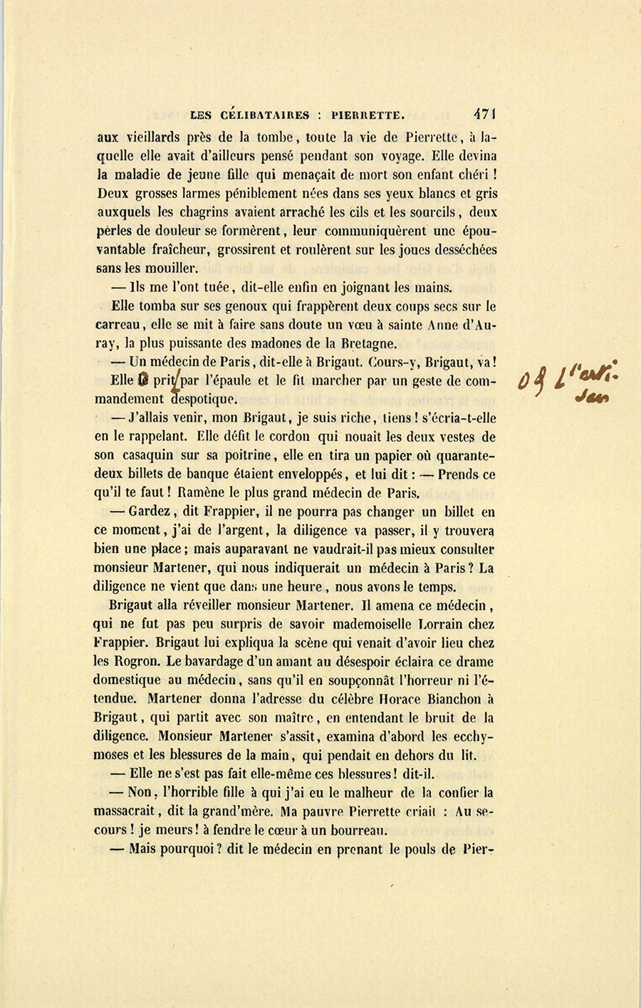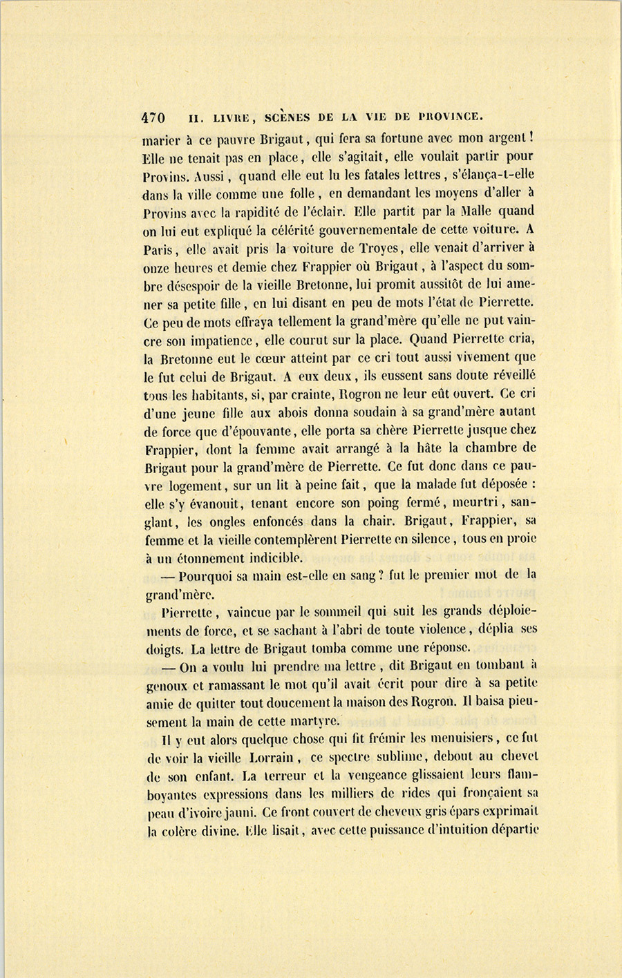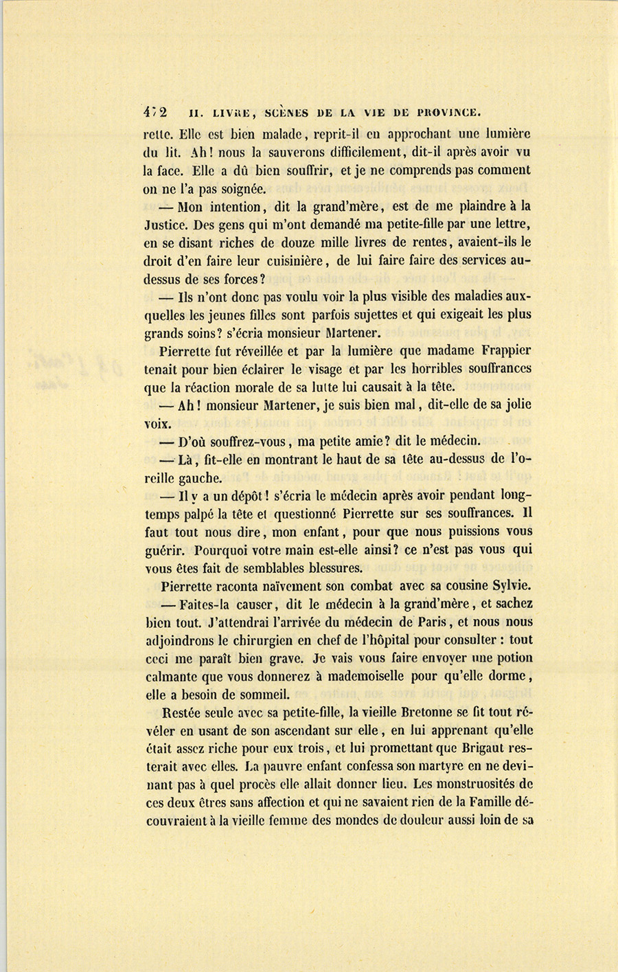 Restée seule avec sa petite-fille, la vieille Bretonne se fit tout révéler en usant de son ascendant sur elle, en lui apprenant qu’elle était assez riche pour eux trois, et lui promettant que Brigaut resterait avec elles. La pauvre enfant confessa son martyre en ne devinant pas à quel procès elle allait donner lieu. Les monstruosités de ces deux êtres sans affection et qui ne savaient rien de la Famille découvraient à la vieille femme des mondes de douleur aussi loin de sa {p. 473} pensée qu’ont pu l’être les mœurs des races sauvages de celle des premiers voyageurs qui pénétrèrent dans les savanes de l’Amérique. L’arrivée de sa grand’mère, la certitude d’être à l’avenir avec elle et riche, endormirent la pensée de Pierrette comme la potion lui endormit le corps. La vieille Bretonne veilla sa petite-fille en lui baisant le front, les cheveux et les mains, comme les saintes femmes durent baiser Jésus en le mettant au tombeau.