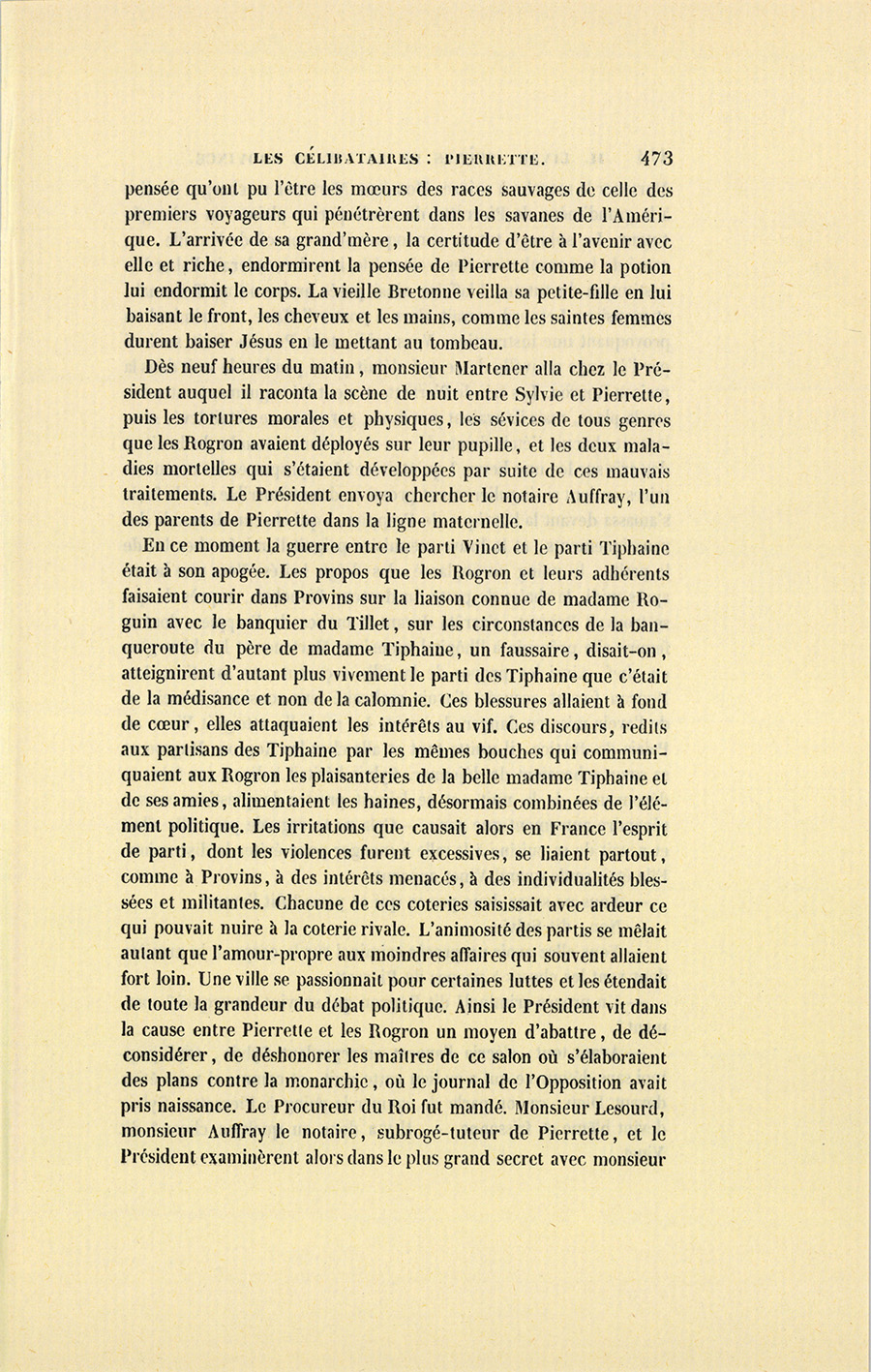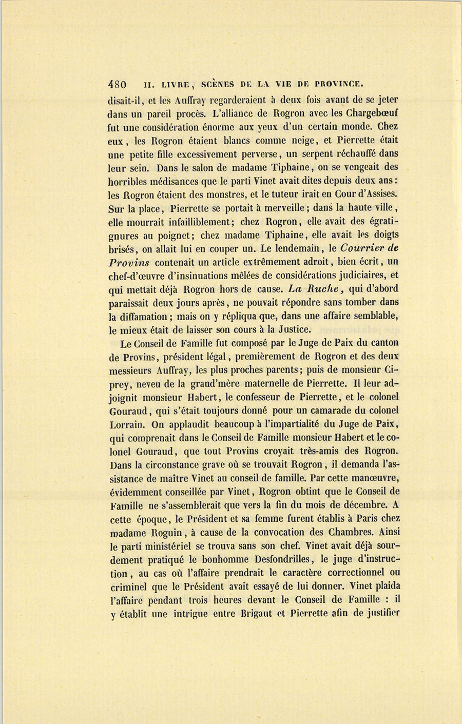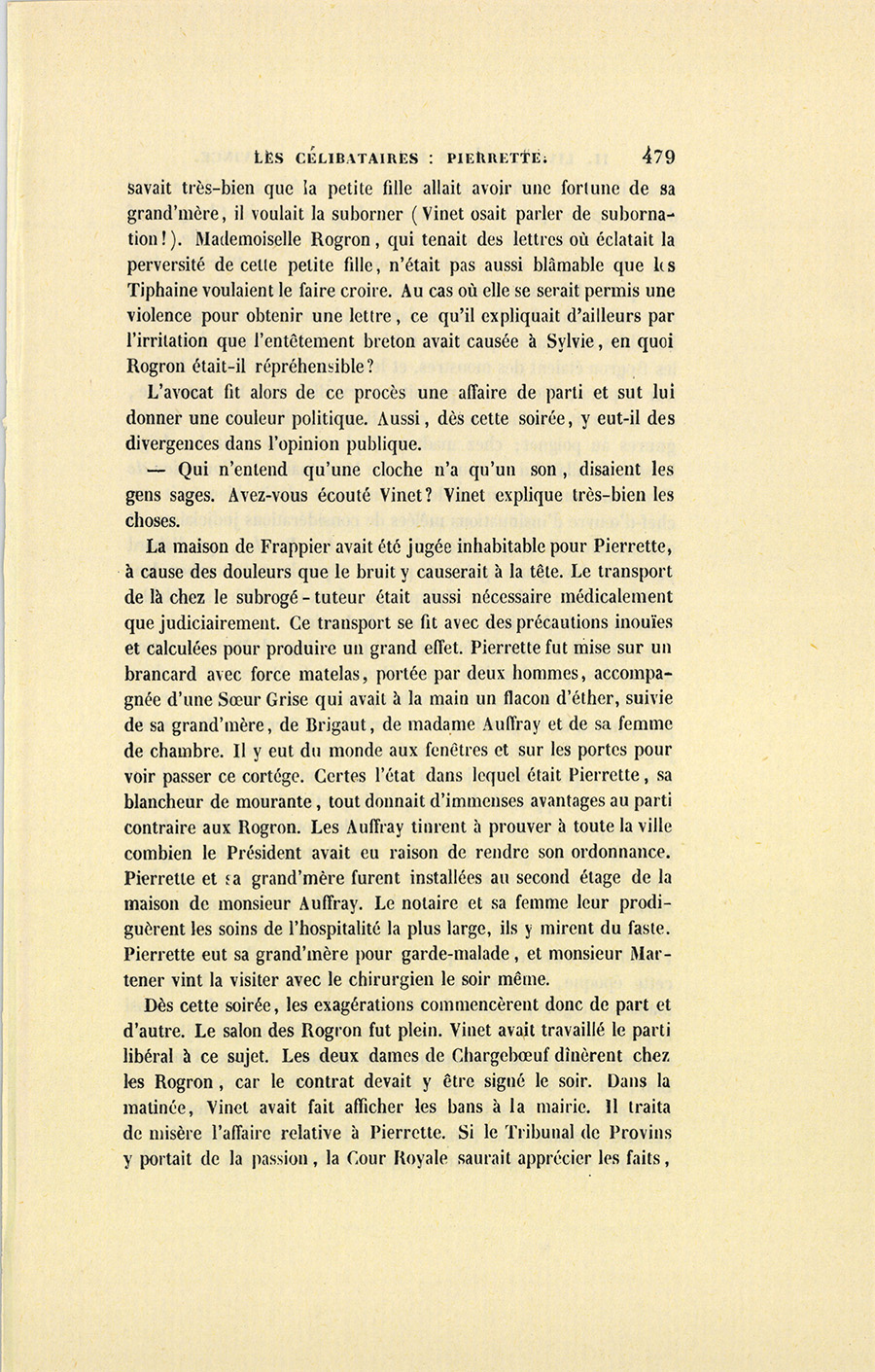 Dès cette soirée, les exagérations commencèrent donc de part et d’autre. Le salon des Rogron fut plein. Vinet avait travaillé le parti libéral à ce sujet. Les deux dames de Chargebœuf dînèrent chez les Rogron, car le contrat devait y être signé le soir. Dans la matinée, Vinet avait fait afficher les bans à la mairie. Il traita de misère l’affaire relative à Pierrette. Si le Tribunal de Provins y portait de la passion, la Cour Royale saurait apprécier les faits, {p. 480} disait-il, et les Auffray regarderaient à deux fois avant de se jeter dans un pareil procès. L’alliance de Rogron avec les Chargebœuf fut une considération énorme aux yeux d’un certain monde. Chez eux, les Rogron étaient blancs comme neige, et Pierrette était une petite fille excessivement perverse, un serpent réchauffé dans leur sein. Dans le salon de madame Tiphaine, on se vengeait des horribles médisances que le parti Vinet avait dites depuis deux ans : les Rogron étaient des monstres, et le tuteur irait en Cour d’Assises. Sur la place, Pierrette se portait à merveille ; dans la haute ville, elle mourrait infailliblement ; chez Rogron, elle avait des égratignures au poignet ; chez madame Tiphaine, elle avait les doigts brisés, on allait lui en couper un. Le lendemain, le Courrier de Provins contenait un article extrêmement adroit, bien écrit, un chef-d’œuvre d’insinuations mêlées de considérations judiciaires, et qui mettait déjà Rogron hors de cause. La Ruche, qui d’abord paraissait deux jours après, ne pouvait répondre sans tomber dans la diffamation ; mais on y répliqua que, dans une affaire semblable, le mieux était de laisser son cours à la Justice.