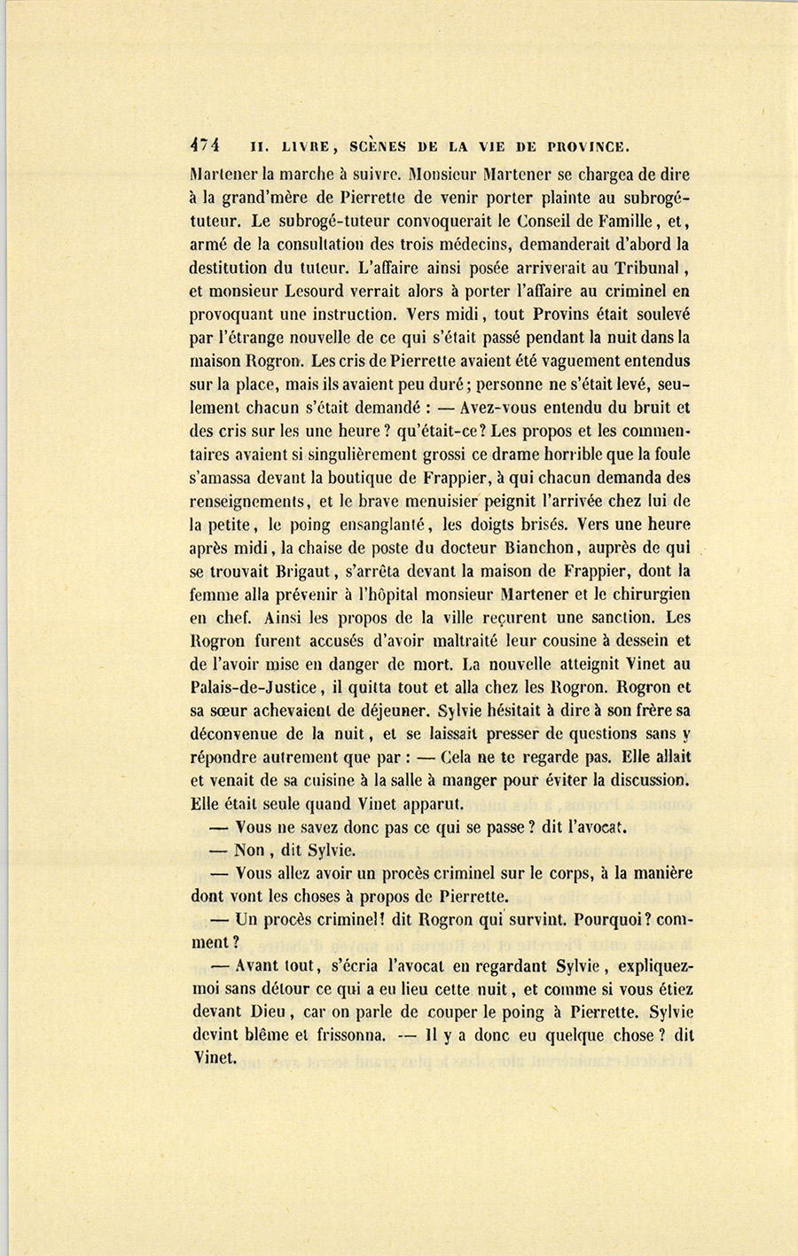 {p. 475} Mademoiselle Rogron raconta la scène en voulant s’excuser ; mais, pressée de questions, elle avoua les faits graves de cette horrible lutte.