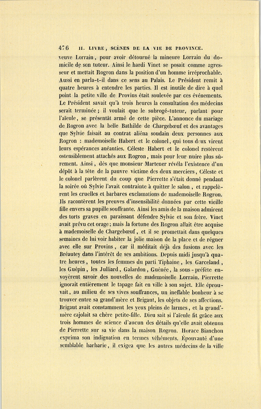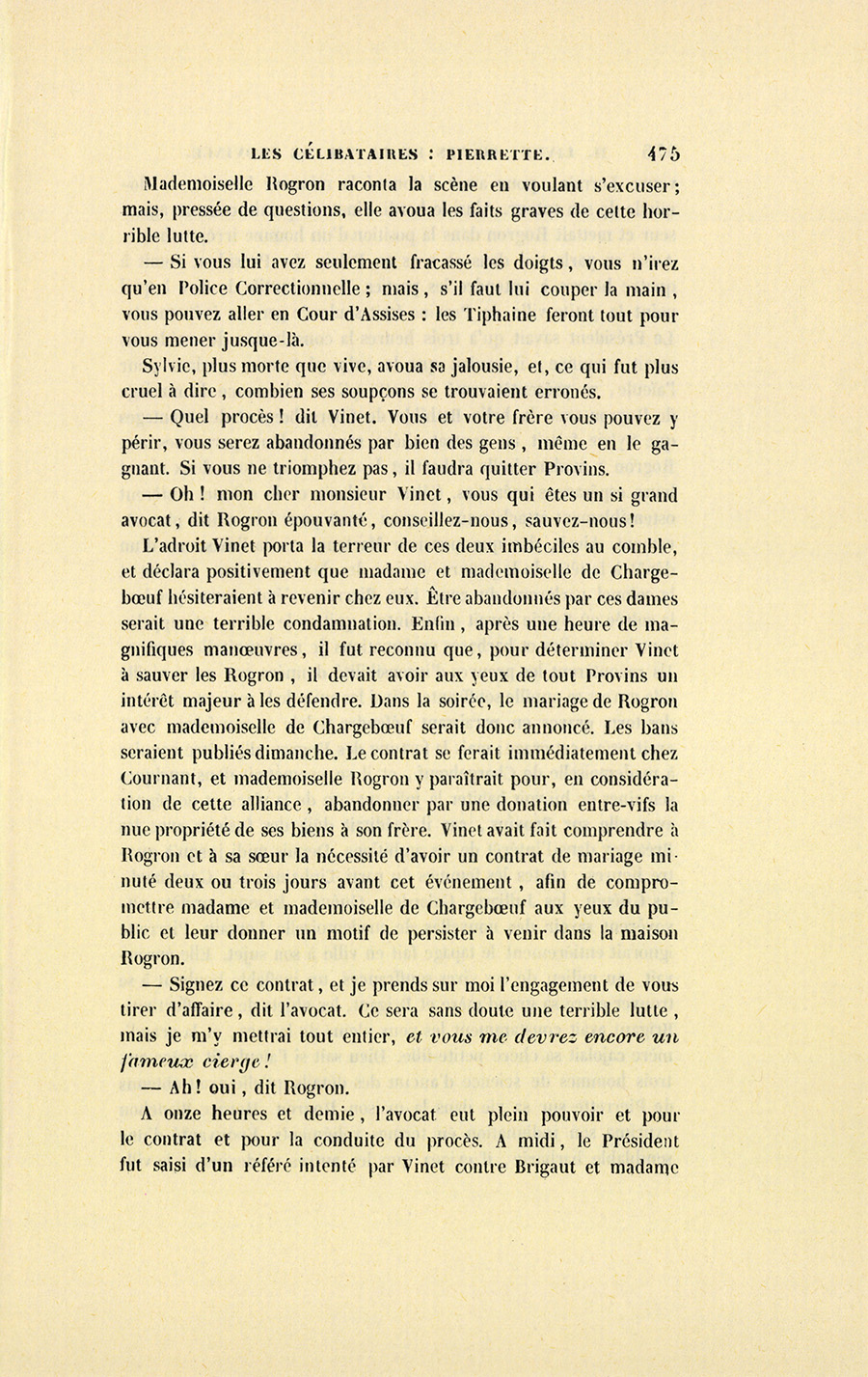À onze heures et demie, l’avocat eut plein pouvoir et pour le contrat et pour la conduite du procès. À midi, le Président fut saisi d’un référé intenté par Vinet contre Brigaut et madame {p. 476} veuve Lorrain, pour avoir détourné la mineure Lorrain du domicile de son tuteur. Ainsi le hardi Vinet se posait comme agresseur et mettait Rogron dans la position d’un homme irréprochable. Aussi en parla-t-il dans ce sens au Palais. Le Président remit à quatre heures à entendre les parties. Il est inutile de dire à quel point la petite ville de Provins était soulevée par ces événements. Le Président savait qu’à trois heures la consultation des médecins serait terminée ; il voulait que le subrogé-tuteur, parlant pour l’aïeule, se présentât armé de cette pièce. L’annonce du mariage de Rogron avec la belle Bathilde de Chargebœuf et des avantages que Sylvie faisait au contrat aliéna soudain deux personnes aux Rogron : mademoiselle Habert et le colonel, qui tous deux virent leurs espérances anéanties. Céleste Habert et le colonel restèrent ostensiblement attachés aux Rogron, mais pour leur nuire plus sûrement. Ainsi, dès que monsieur Martener révéla l’existence d’un dépôt à la tête de la pauvre victime des deux merciers, Céleste et le colonel parlèrent du coup que Pierrette s’était donné pendant la soirée où Sylvie l’avait contrainte à quitter le salon, et rappelèrent les cruelles et barbares exclamations de mademoiselle Rogron. Ils racontèrent les preuves d’insensibilité données par cette vieille fille envers sa pupille souffrante. Ainsi les amis de la maison admirent des torts graves en paraissant défendre Sylvie et son frère. Vinet avait prévu cet orage ; mais la fortune des Rogron allait être acquise à mademoiselle de Chargebœuf, et il se promettait dans quelques semaines de lui voir habiter la jolie maison de la place et de régner avec elle sur Provins, car il méditait déjà des fusions avec les Bréautey dans l’intérêt de ses ambitions. Depuis midi jusqu’à quatre heures, toutes les femmes du parti Tiphaine, les Garceland, les Guépin, les Julliard, Galardon, Guénée, la sous-préfète envoyèrent savoir des nouvelles de mademoiselle Lorrain. Pierrette ignorait entièrement le tapage fait en ville à son sujet. Elle éprouvait, au milieu de ses vives souffrances, un ineffable bonheur à se trouver entre sa grand’mère et Brigaut, les objets de ses affections. Brigaut avait constamment les yeux pleins de larmes, et la grand’mère cajolait sa chère petite-fille. Dieu sait si l’aïeule fit grâce aux trois hommes de science d’aucun des détails qu’elle avait obtenus de Pierrette sur sa vie dans la maison Rogron. Horace Bianchon exprima son indignation en termes véhéments. Épouvanté d’une semblable barbarie, il exigea que les autres médecins de la ville {p. 477} fussent mandés, en sorte que monsieur Néraud fût présent et invité, comme ami de Rogron, à contredire, s’il y avait lieu, les terribles conclusions de la consultation, qui, malheureusement pour les Rogron, fut rédigée à l’unanimité. Néraud, qui déjà passait pour avoir fait mourir de chagrin la grand’mère de Pierrette, était dans une fausse position de laquelle profita l’adroit Martener, enchanté d’accabler les Rogron et de compromettre en ceci monsieur Néraud, son antagoniste. Il est inutile de donner le texte de cette consultation, qui fut encore une des pièces du procès. Si les termes de la médecine de Molière étaient barbares, ceux de la médecine moderne ont l’avantage d’être si clairs que l’explication de la maladie de Pierrette, quoique naturelle et malheureusement commune, effraierait les oreilles. Cette consultation était d’ailleurs péremptoire, appuyée par un nom aussi célèbre que celui d’Horace Bianchon. Après l’audience, le Président resta sur son siége en voyant la grand’mère de Pierrette accompagnée de monsieur Auffray, de Brigaut et d’une foule nombreuse. Vinet était seul. Ce contraste frappa l’audience, qui fut grossie d’un grand nombre de curieux. Vinet, qui avait gardé sa robe, leva vers le Président sa face froide en assurant ses besicles sur ses yeux verts, puis, de sa voix grêle et persistante, il exposa que des étrangers s’étaient introduits nuitamment chez monsieur et mademoiselle Rogron, et y avaient enlevé la mineure Lorrain. Force devait rester au tuteur, qui réclamait sa pupille. Monsieur Auffray se leva, comme subrogé-tuteur, et demanda la parole.