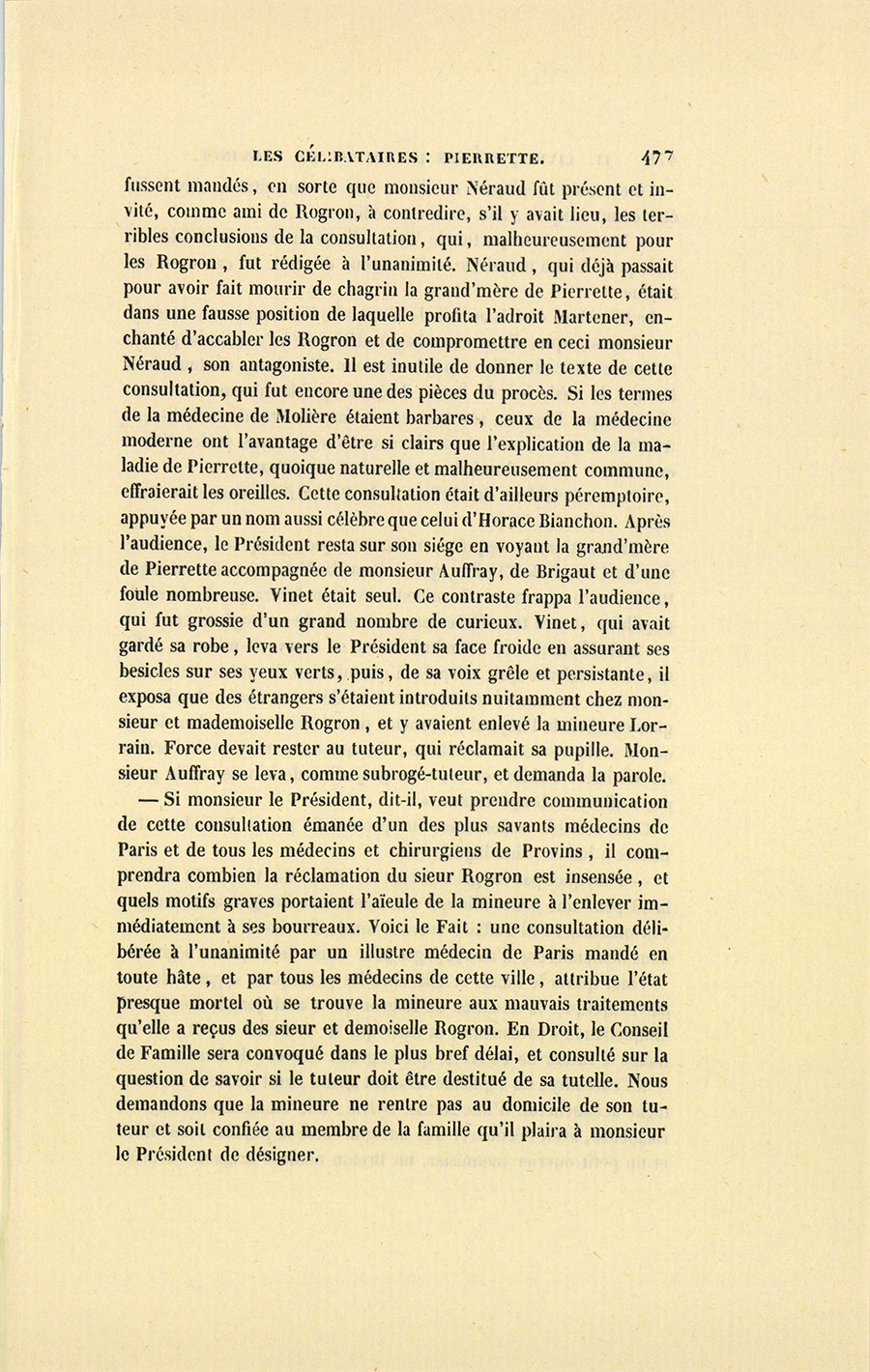 Conseillé par Vinet, Rogron se rendit opposant à l’homologation de la délibération du Conseil de Famille par le Tribunal. Le Ministère Public intervint, attendu la gravité croissante de l’état pathologique où se trouvait Pierrette Lorrain. Ce procès curieux, quoique promptement mis au rôle, ne vint en ordre utile que vers le mois de mars 1828.