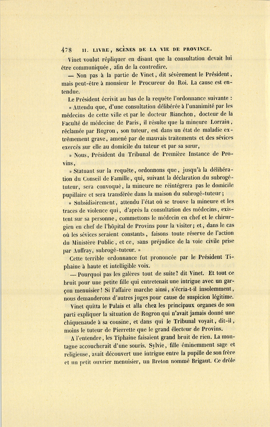 Attendu que, d’une consultation délibérée à l’unanimité par les médecins de cette ville et par le docteur Bianchon, docteur de la Faculté de médecine de Paris, il résulte que la mineure Lorrain, réclamée par Rogron, son tuteur, est dans un état de maladie extrêmement grave, amené par de mauvais traitements et des sévices exercés sur elle au domicile du tuteur et par sa sœur,