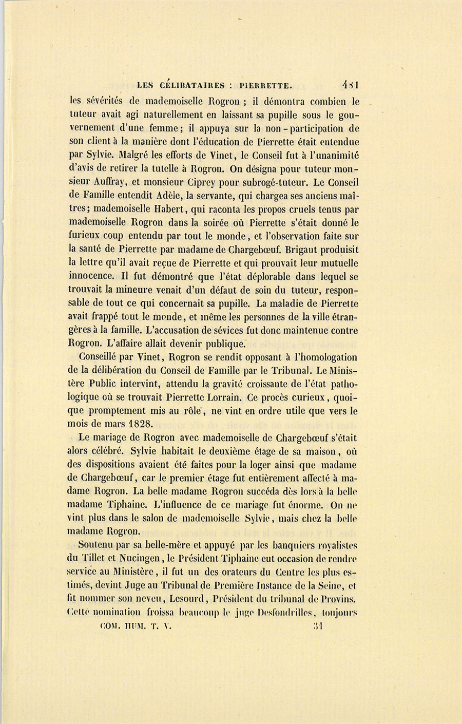 Soutenu par sa belle-mère et appuyé par les banquiers royalistes du Tillet et Nucingen, le Président Tiphaine eut occasion de rendre service au Ministère, il fut un des orateurs du Centre les plus estimés, devint Juge au Tribunal de Première Instance de la Seine, et fit nommer son neveu, Lesourd, Président du tribunal de Provins. Cette nomination froissa beaucoup le juge Desfondrilles, toujours {p. 482} archéologue et plus que jamais suppléant. Le Garde des Sceaux envoya l’un de ses protégés à la place de Lesourd. L’avancement de monsieur Tiphaine n’en produisit donc aucun dans le Tribunal de Provins. Vinet exploita très-habilement ces circonstances. Il avait toujours dit aux gens de Provins qu’ils servaient de marchepied aux grandeurs de la rusée madame Tiphaine. Le Président se jouait de ses amis. Madame Tiphaine méprisait in petto la ville de Provins, et n’y reviendrait jamais. Monsieur Tiphaine père mourut, son fils hérita de la terre du Fay, et vendit sa belle maison de la ville haute à monsieur Julliard. Cette vente prouva combien il comptait peu revenir à Provins. Vinet eut raison, Vinet avait été prophète. Ces faits eurent une grande influence sur le procès relatif à la tutelle de Rogron.