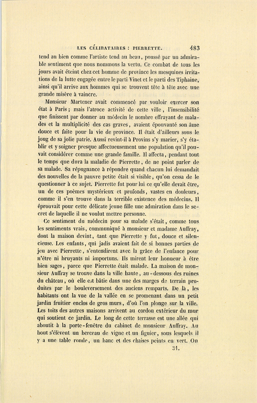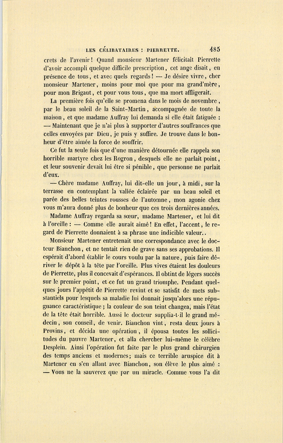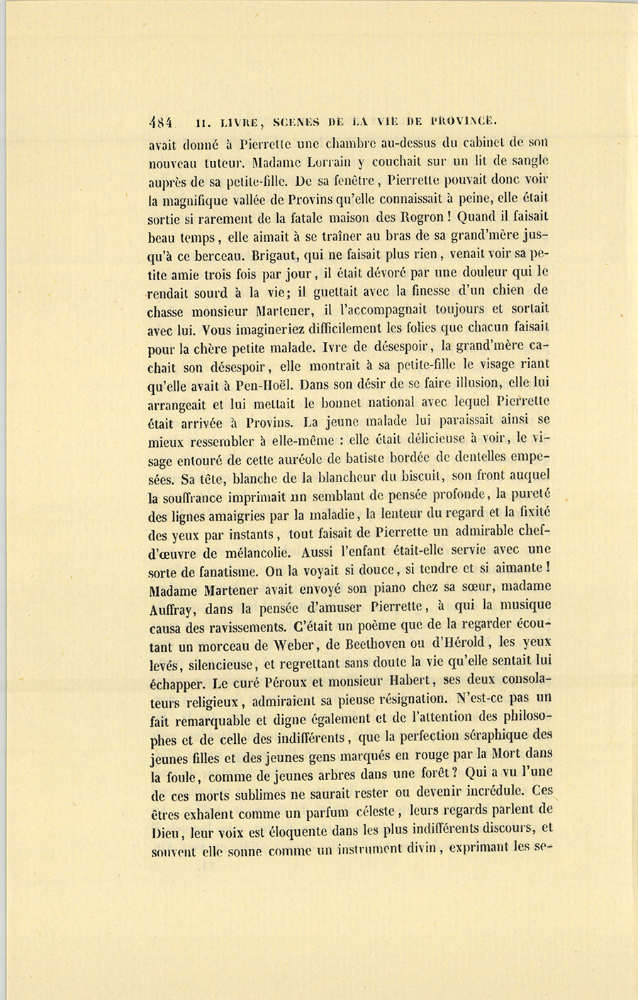 Monsieur Martener, de même que la famille Auffray, fut en peu de jours séduit par l’adorable caractère de Pierrette et par la vieille Bretonne dont les sentiments, les idées, les façons étaient empreintes d’une antique couleur romaine. Cette matrone du Marais ressemblait à une femme de Plutarque. Le médecin voulut disputer cette proie à la mort, car dès le premier jour le médecin de Paris et le médecin de province regardèrent Pierrette comme perdue. Il y eut entre le mal et le médecin, soutenu par la jeunesse de Pierrette, un de ces combats que les médecins seuls connaissent et dont la récompense, en cas de succès, n’est jamais ni dans le prix vénal des soins ni chez le malade ; elle se trouve dans la douce satisfaction de la conscience et dans je ne sais quelle palme idéale et invisible recueillie par les vrais artistes après le contentement que leur cause la certitude d’avoir fait une belle œuvre. Le médecin {p. 483} tend au bien comme l’artiste tend au beau, poussé par un admirable sentiment que nous nommons la vertu. Ce combat de tous les jours avait éteint chez cet homme de province les mesquines irritations de la lutte engagée entre le parti Vinet et le parti des Tiphaine, ainsi qu’il arrive aux hommes qui se trouvent tête à tête avec une grande misère à vaincre.