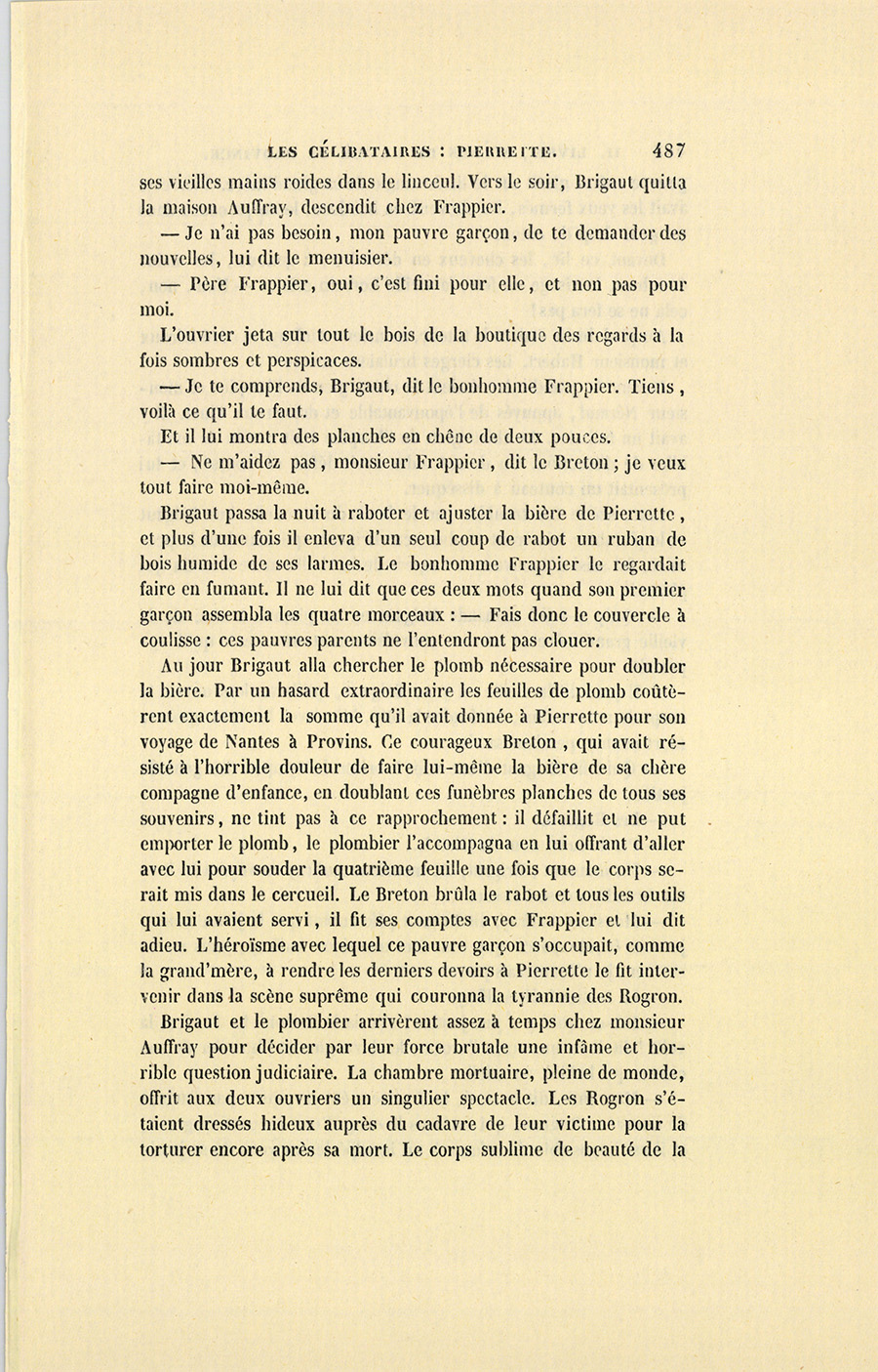 Ce fut à trois heures, le mardi de Pâques, par une belle journée, que ce petit ange cessa de souffrir. Son héroïque grand’mère voulut la garder pendant la nuit avec les prêtres, et la coudre de {p. 487} ses vieilles mains roides dans le linceul. Vers le soir, Brigaut quitta la maison Auffray, descendit chez Frappier.