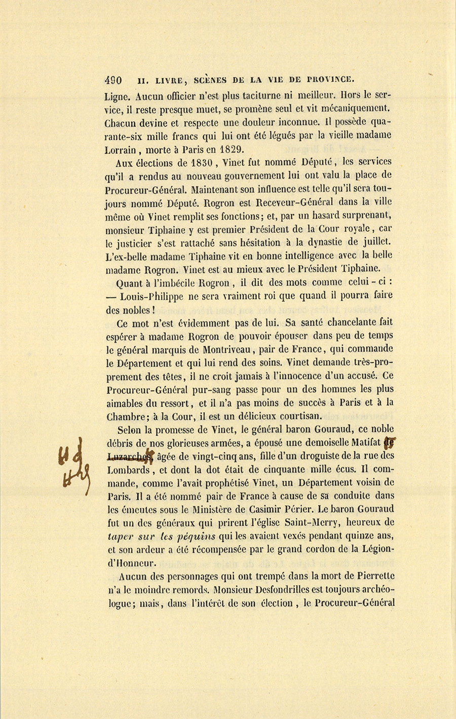 Selon la promesse de Vinet, le général baron Gouraud, ce noble débris de nos glorieuses armées, a épousé une demoiselle Matifat âgée de vingt-cinq ans, fille d’un droguiste de la rue des Lombards, et dont la dot était de cinquante mille écus. Il commande, comme l’avait prophétisé Vinet, un Département voisin de Paris. Il a été nommé pair de France à cause de sa conduite dans les émeutes sous le Ministère de Casimir Périer. Le baron Gouraud fut un des généraux qui prirent l’église Saint-Merry, heureux de taper sur les péquins qui les avaient vexés pendant quinze ans, et son ardeur a été récompensée par le grand cordon de la Légion-d’Honneur.