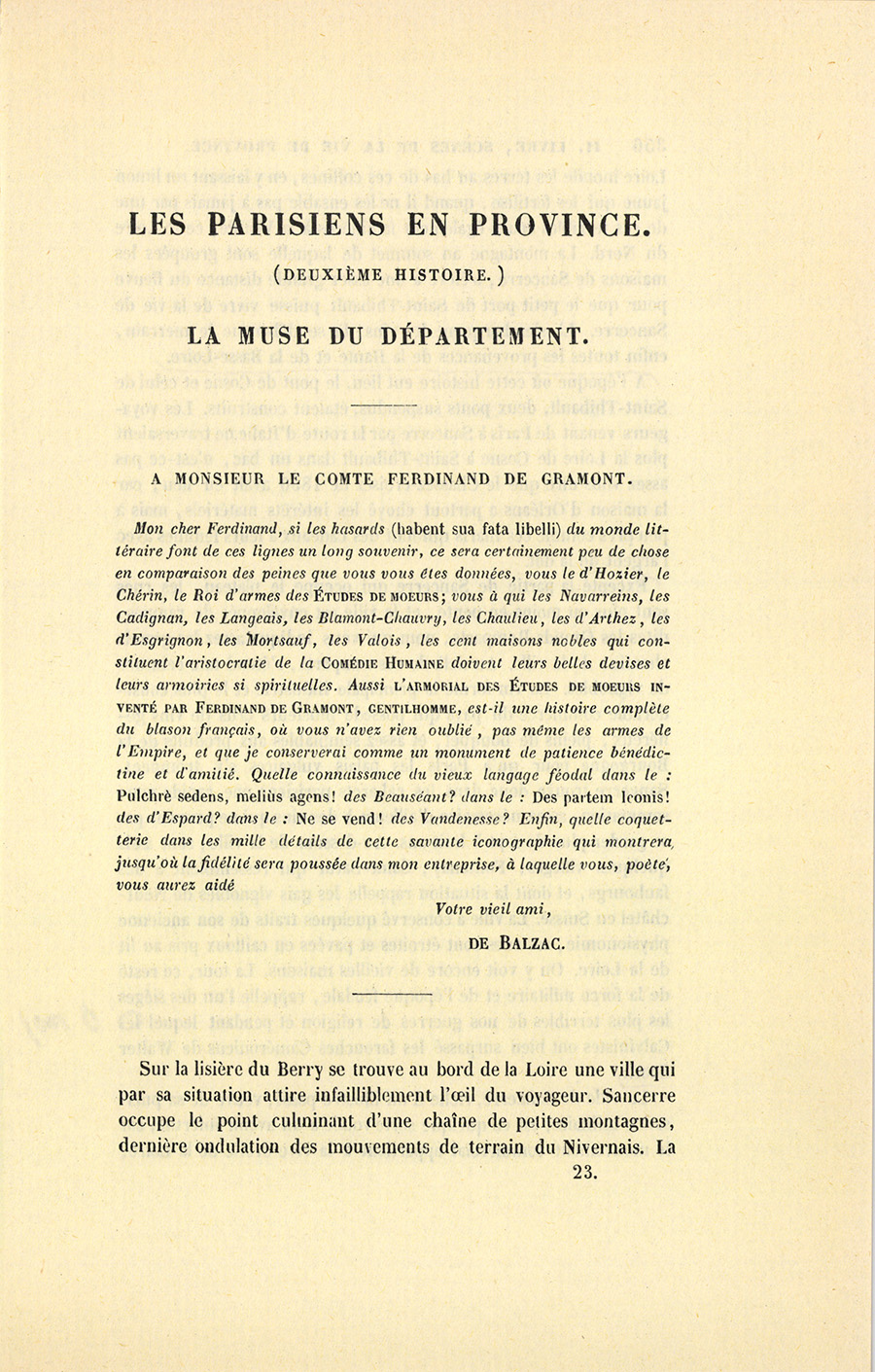Mon cher Ferdinand, si les hasards (habent sua fata libelli) du monde littéraire font de ces lignes un long souvenir, ce sera certainement peu de chose en comparaison des peines que vous vous êtes données, vous le d’Hozier, le Chérin, le Roi d’armes des Études de mœurs ; vous à qui les Navarreins, les Cadignan, les Langeais, les Blamont-Chauvry, les Chaulieu, les d’Arthez, les d’Esgrignon, les Mortsauf, les Valois, les cent maisons nobles qui constituent l’aristocratie de la Comédie Humaine doivent leurs belles devises et leurs armoiries si spirituelles. Aussi l’armorial des Études de mœurs inventé par Ferdinand de Gramont, gentilhomme, est-il une histoire complète du blason français, où vous n’avez rien oublié, pas même les armes de l’Empire, et que je conserverai comme un monument de patience bénédictine et d’amitié. Quelle connaissance du vieux langage féodal dans le : Pulchrè sedens, meliùs agens ! des Beauséant ? dans le : Des partem leonis ! des d’Espard ? dans le : Ne se vend ! des Vandenesse ? Enfin, quelle coquetterie dans les mille détails de cette savante iconographie qui montrera jusqu’où la fidélité sera poussée dans mon entreprise, à laquelle vous, poète, vous aurez aidé