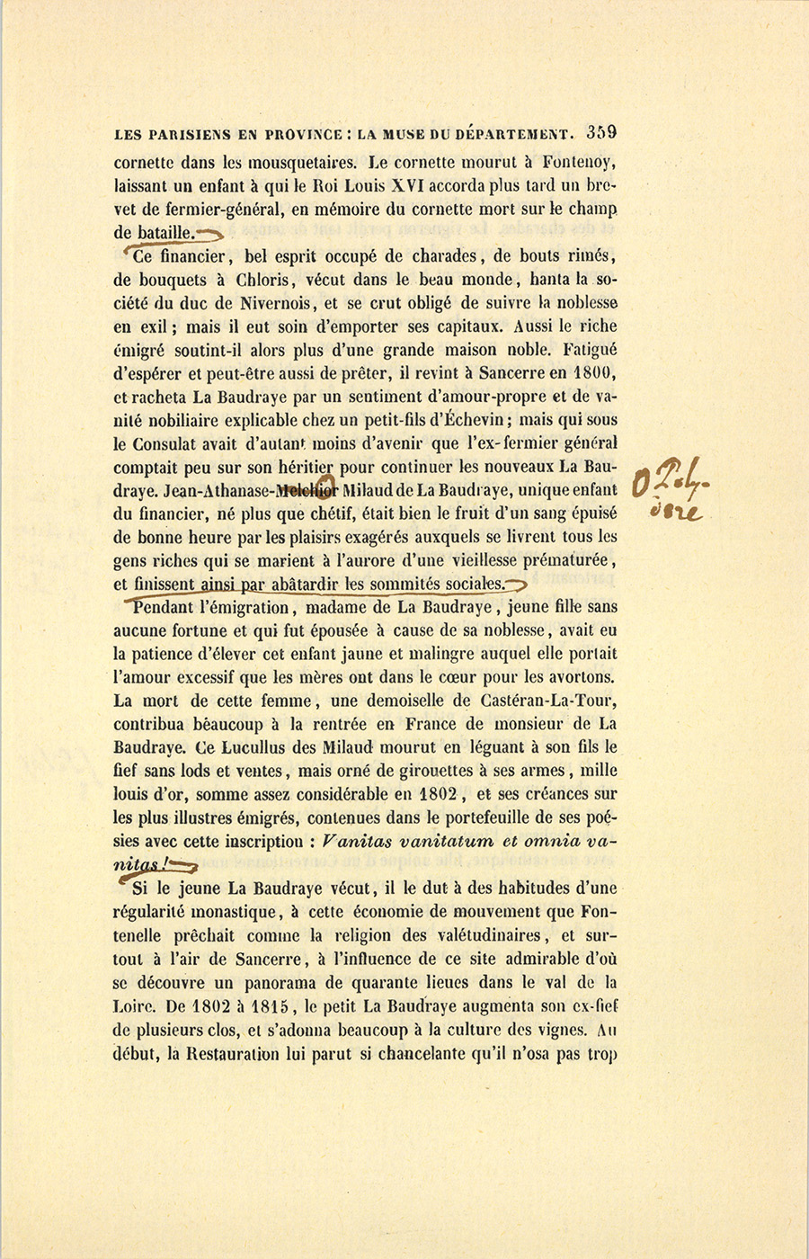 Sous Louis XIV, un certain échevin nommé Milaud, dont les ancêtres furent d’enragés Calvinistes, se convertit lors de la révocation de l’Édit de Nantes. Pour encourager ce mouvement dans l’un des sanctuaires du calvinisme, le Roi nomma cettui Milaud à un poste élevé dans les Eaux et Forêts, lui donna des armes et le titre de Sire de La Baudraye1 en lui faisant présent du fief des vrais et vieux La Baudraye. Les héritiers du fameux capitaine La Baudraye tombèrent, hélas ! dans l’un des piéges tendus aux hérétiques par les Ordonnances, et furent pendus, traitement indigne du Grand Roi. Sous Louis XV, Milaud de La Baudraye de simple Écuyer, devint Chevalier, et eut assez de crédit pour placer son fils {p. 359} cornette dans les mousquetaires. Le cornette mourut à Fontenoy, laissant un enfant à qui le Roi Louis XVI accorda plus tard un brevet de fermier-général, en mémoire du cornette mort sur le champ de bataille. Ce financier, bel esprit occupé de charades, de bouts rimés, de bouquets à Chloris, vécut dans le beau monde, hanta la société du duc de Nivernois, et se crut obligé de suivre la noblesse en exil ; mais il eut soin d’emporter ses capitaux. Aussi le riche émigré soutint-il alors plus d’une grande maison noble. Fatigué d’espérer et peut-être aussi de prêter, il revint à Sancerre en 1800, et racheta La Baudraye par un sentiment d’amour-propre et de vanité nobiliaire explicable chez un petit-fils d’Échevin ; mais qui sous le Consulat avait d’autant moins d’avenir que l’ex-fermier général comptait peu sur son héritier pour continuer les nouveaux La Baudraye. Jean-Athanase-Polydore Milaud de La Baudraye, unique enfant du financier, né plus que chétif, était bien le fruit d’un sang épuisé de bonne heure par les plaisirs exagérés auxquels se livrent tous les gens riches qui se marient à l’aurore d’une vieillesse prématurée, et finissent ainsi par abâtardir les sommités sociales. Pendant l’émigration, madame de La Baudraye, jeune fille sans aucune fortune et qui fut épousée à cause de sa noblesse, avait eu la patience d’élever cet enfant jaune et malingre auquel elle portait l’amour excessif que les mères ont dans le cœur pour les avortons. La mort de cette femme, une demoiselle de Castéran-La-Tour, contribua beaucoup à la rentrée en France de monsieur de La Baudraye. Ce Lucullus des Milaud mourut en léguant à son fils le fief sans lods et ventes, mais orné de girouettes à ses armes, mille louis d’or, somme assez considérable en 1802, et ses créances sur les plus illustres émigrés, contenues dans le portefeuille de ses poésies avec cette inscription : Vanitas vanitatum et omnia vanitas ! Si le jeune La Baudraye vécut, il le dut à des habitudes d’une régularité monastique, à cette économie de mouvement que Fontenelle prêchait comme la religion des valétudinaires, et surtout à l’air de Sancerre, à l’influence de ce site admirable d’où se découvre un panorama de quarante lieues dans le val de la Loire. De 1802 à 1815, le petit La Baudraye augmenta son ex-fief de plusieurs clos, et s’adonna beaucoup à la culture des vignes. Au début, la Restauration lui parut si chancelante qu’il n’osa pas trop {p. 360} aller à Paris y faire ses réclamations ; mais après la mort de Napoléon il essaya de monnayer la poésie de son père, car il ne comprit pas la profonde philosophie accusée par ce mélange des créances et des charades. Le vigneron perdit tant de temps à se faire reconnaître de messieurs les ducs de Navarreins et autres (telle était son expression), qu’il revint à Sancerre, appelé par ses chères vendanges, sans avoir rien obtenu que des offres de services. La Restauration rendit assez de lustre à la noblesse pour que La Baudraye désirât donner un sens à son ambition en se donnant un héritier. Ce bénéfice conjugal lui paraissait assez problématique ; autrement, il n’eût2 pas tant tardé ; mais, vers la fin de 1823, en se voyant encore sur ses jambes à quarante-trois ans, âge qu’aucun médecin, astrologue ou sage-femme n’eût osé lui prédire, il espéra trouver la récompense de sa vertu forcée. Néanmoins, son choix indiqua, relativement à sa chétive constitution, un si grand défaut de prudence qu’il fut impossible à la malice provinciale de n’y pas voir un profond calcul.