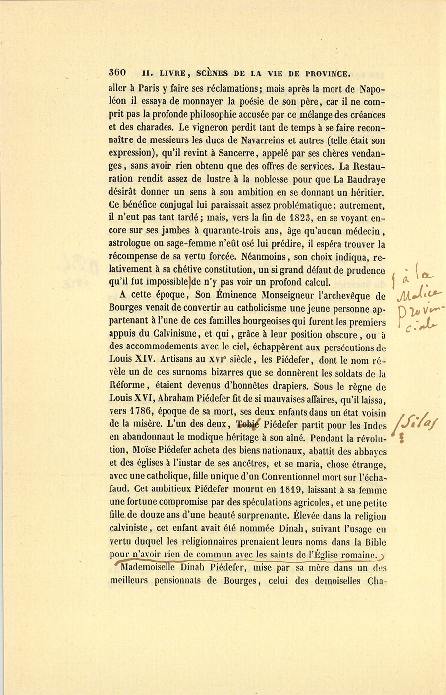 À cette époque, Son Éminence Monseigneur l’archevêque de Bourges venait de convertir au catholicisme une jeune personne appartenant à l’une de ces familles bourgeoises qui furent les premiers appuis du Calvinisme, et qui, grâce à leur position obscure, ou à des accommodements avec le ciel, échappèrent aux persécutions de Louis XIV. Artisans au xvie siècle, les Piédefer, dont le nom révèle un de ces surnoms bizarres que se donnèrent les soldats de la Réforme, étaient devenus d’honnêtes drapiers. Sous le règne de Louis XVI, Abraham Piédefer fit de si mauvaises affaires, qu’il laissa, vers 1786, époque de sa mort, ses deux enfants dans un état voisin de la misère. L’un des deux, Silas Piédefer partit pour les Indes en abandonnant le modique héritage à son aîné. Pendant la révolution, Moïse Piédefer acheta des biens nationaux, abattit des abbayes et des églises à l’instar de ses ancêtres, et se maria, chose étrange, avec une catholique, fille unique d’un Conventionnel mort sur l’échafaud. Cet ambitieux Piédefer mourut en 1819, laissant à sa femme une fortune compromise par des spéculations agricoles, et une petite fille de douze ans d’une beauté surprenante. Élevée dans la religion calviniste, cet enfant avait été nommée Dinah, suivant l’usage en vertu duquel les religionnaires prenaient leurs noms dans la Bible pour n’avoir rien de commun avec les saints de l’Église romaine. Mademoiselle Dinah Piédefer, mise par sa mère dans un des meilleurs pensionnats de Bourges, celui des demoiselles {p. 361} Chamarolles, y devint aussi célèbre par les qualités de son esprit que par sa beauté ; mais elle s’y trouva primée par des jeunes filles nobles, riches et qui devaient plus tard jouer dans le monde un rôle beaucoup plus beau que celui d’une roturière dont la mère attendait les résultats de la liquidation Piédefer. Après avoir su s’élever momentanément au-dessus de ses compagnes, Dinah voulut aussi se trouver de plain-pied avec elles dans la vie. Elle inventa donc d’abjurer le calvinisme, en espérant que le Cardinal protégerait sa conquête spirituelle et s’occuperait de son avenir. Vous pouvez juger déjà de la supériorité de mademoiselle Dinah qui, dès l’âge de dix-sept ans, se convertissait uniquement par ambition. L’archevêque imbu de l’idée que Dinah Piédefer devait faire l’ornement du monde, essaya de la marier. Toutes les familles auxquelles s’adressa le Prélat s’effrayèrent d’une fille douée d’une prestance de princesse, qui passait pour la plus spirituelle des jeunes personnes élevées chez les demoiselles de Chamarolles, et qui dans les solennités un peu théâtrales des distributions de prix, jouait toujours les premiers rôles. Assurément mille écus de rentes, que pouvait rapporter le domaine de La Hautoy indivis entre la fille et la mère, étaient peu de chose en comparaison des dépenses auxquelles les avantages personnels d’une créature si spirituelle entraînerait un mari.