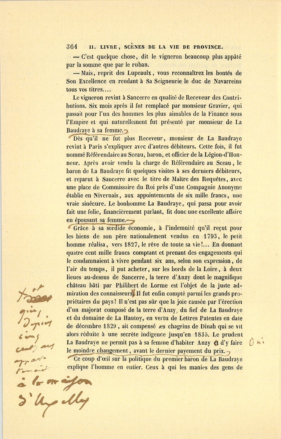 Le vigneron revint à Sancerre en qualité de Receveur des Contributions. Six mois après il fut remplacé par monsieur Gravier, qui passait pour l’un des hommes les plus aimables de la Finance sous l’Empire et qui naturellement fut présenté par monsieur de La Baudraye à sa femme. Dès qu’il ne fut plus Receveur, monsieur de La Baudraye revint à Paris s’expliquer avec d’autres débiteurs. Cette fois, il fut nommé Référendaire au Sceau, baron, et officier de la Légion-d’Honneur. Après avoir vendu la charge de Référendaire au Sceau, le baron de La Baudraye fit quelques visites à ses derniers débiteurs, et reparut à Sancerre avec le titre de Maître des Requêtes, avec une place de Commissaire du Roi près d’une Compagnie Anonyme établie en Nivernais, aux appointements de six mille francs, une vraie sinécure. Le bonhomme La Baudraye, qui passa pour avoir fait une folie, financièrement parlant, fit donc une excellente affaire en épousant sa femme. Grâce à sa sordide économie, à l’indemnité qu’il reçut pour les biens de son père nationalement vendus en 1793, le petit homme réalisa, vers 1827, le rêve de toute sa vie !… En donnant quatre cent mille francs comptant et prenant des engagements qui le condamnaient à vivre pendant six ans, selon son expression, de l’air du temps, il put acheter, sur les bords de la Loire, à deux lieues au-dessus de Sancerre, la terre d’Anzy dont le magnifique château bâti par Philibert de Lorme est l’objet de la juste admiration des connaisseurs et qui, depuis cinq cents ans, appartenait à la maison d’Uxelles. Il fut enfin compté parmi les grands propriétaires du pays ! Il n’est pas sûr que la joie causée par l’érection d’un majorat composé de la terre d’Anzy, du fief de La Baudraye et du domaine de La Hautoy, en vertu de Lettres Patentes en date de décembre 1829, ait compensé les chagrins de Dinah qui se vit alors réduite à une secrète indigence jusqu’en 1835. Le prudent La Baudraye ne permit pas à sa femme d’habiter Anzy ni d’y faire le moindre changement, avant le dernier payement du prix. Ce coup d’œil sur la politique du premier baron de La Baudraye explique l’homme en entier. Ceux à qui les manies des gens de {p. 365} province sont familières reconnaîtront en lui la passion de la terre, passion dévorante, passion exclusive, espèce d’avarice étalée au soleil, et qui souvent mène à la ruine par un défaut d’équilibre entre les intérêts hypothécaires et les produits territoriaux. Les gens qui, de 1802 à 1827, se moquaient du petit La Baudraye en le voyant trottant à Saint-Thibault et s’y occupant de ses affaires avec l’âpreté d’un bourgeois vivant de sa vigne, ceux qui ne comprenaient pas son dédain de la faveur à laquelle il avait dû ses places aussitôt quittées qu’obtenues, eurent enfin le mot de l’énigme quand ce formicaléo sauta sur sa proie, après avoir attendu le moment où les prodigalités de la duchesse de Maufrigneuse amenèrent la vente de cette terre magnifique.