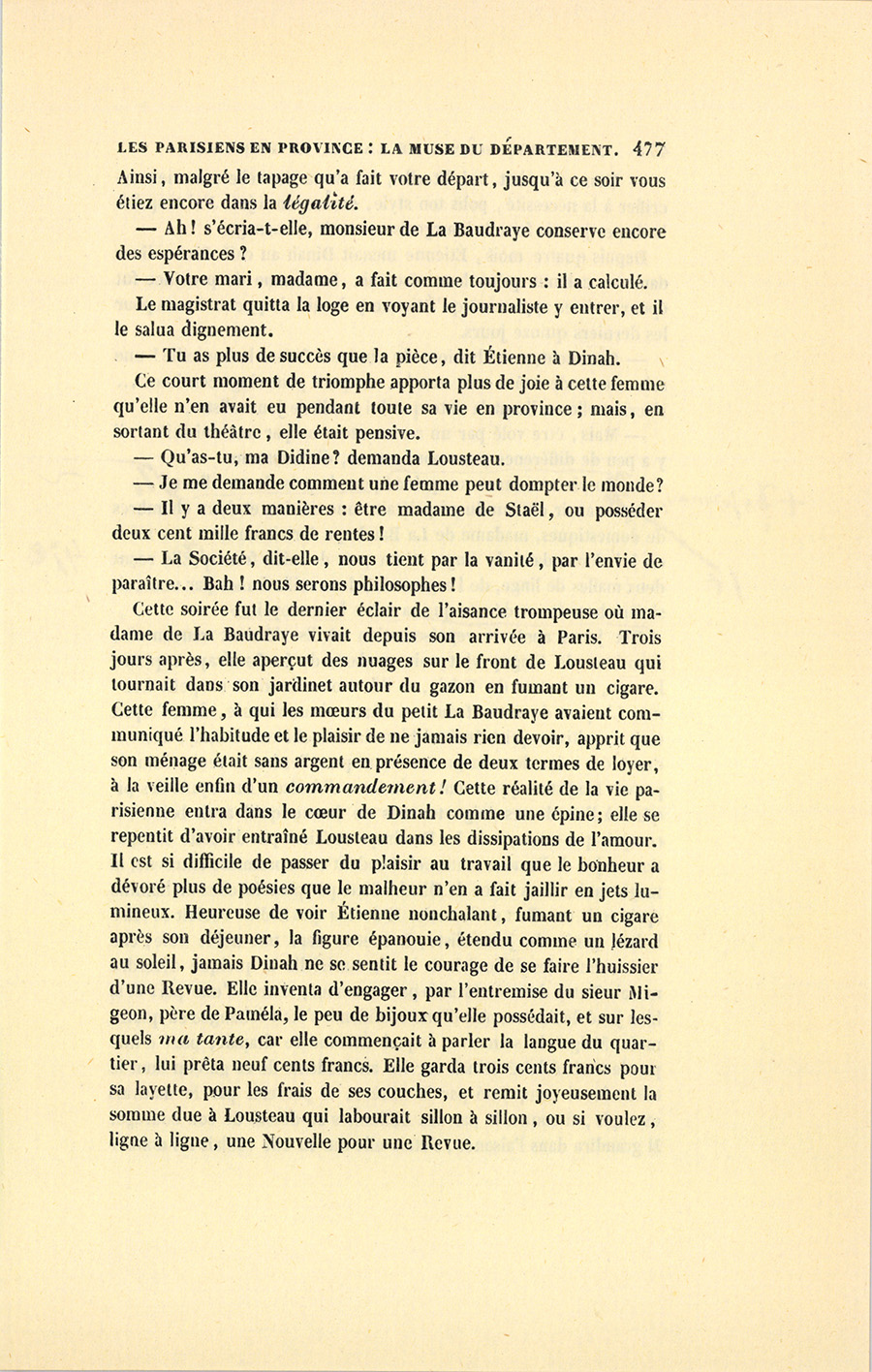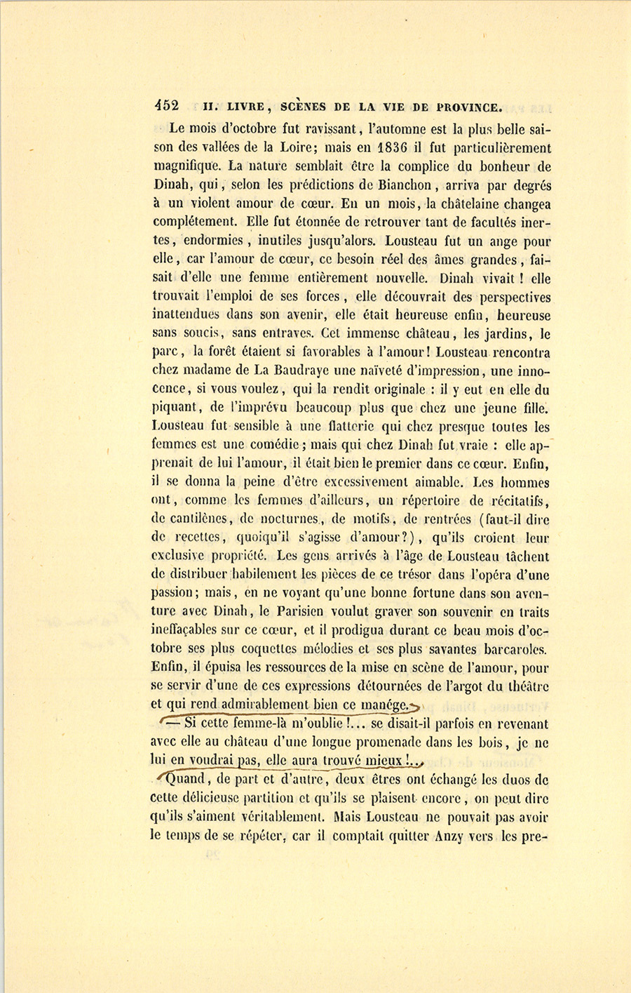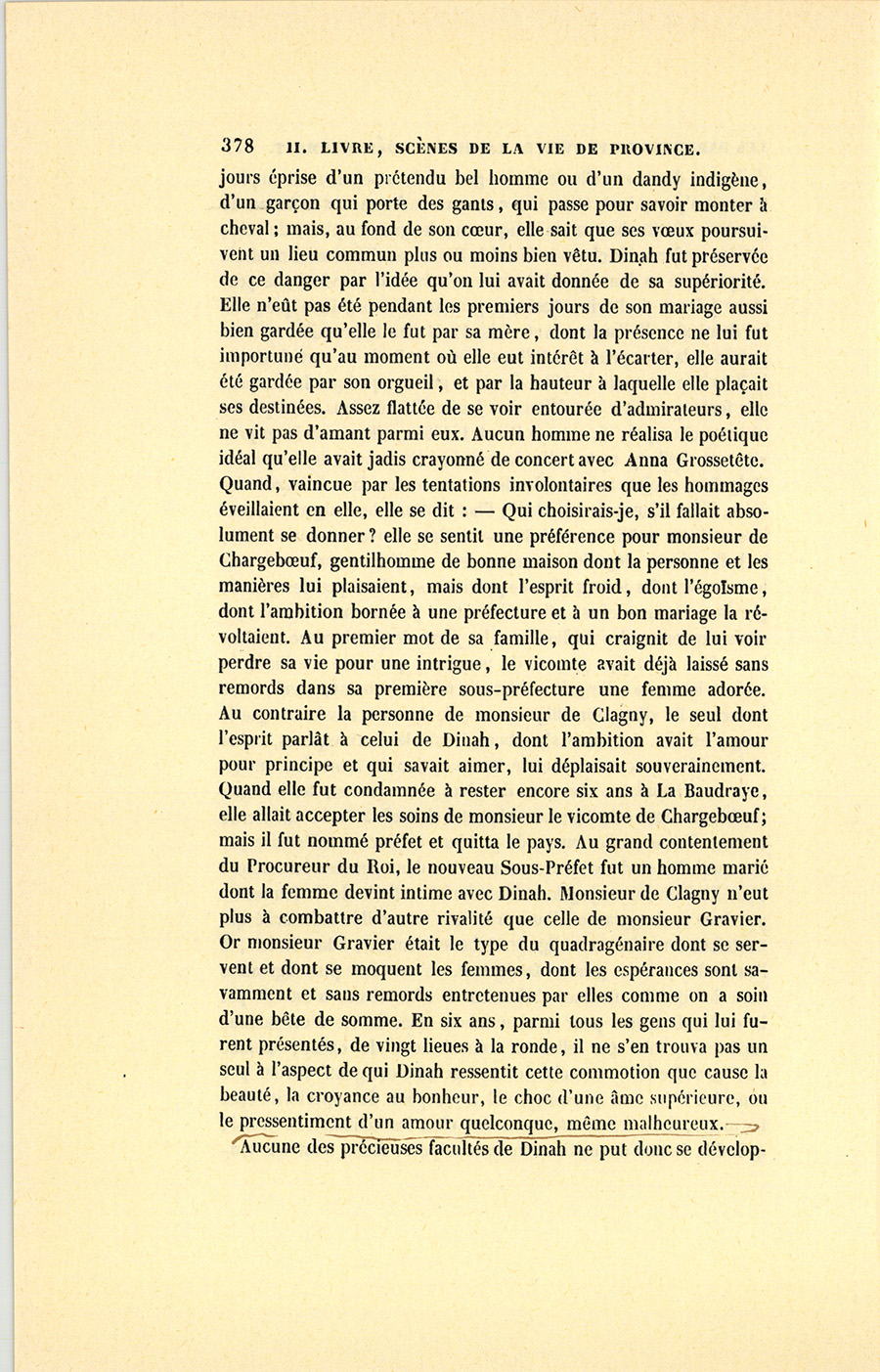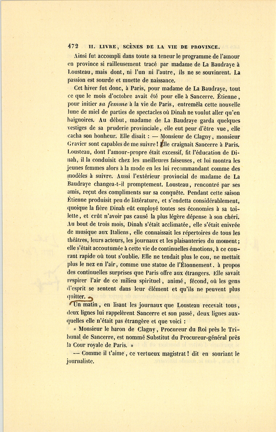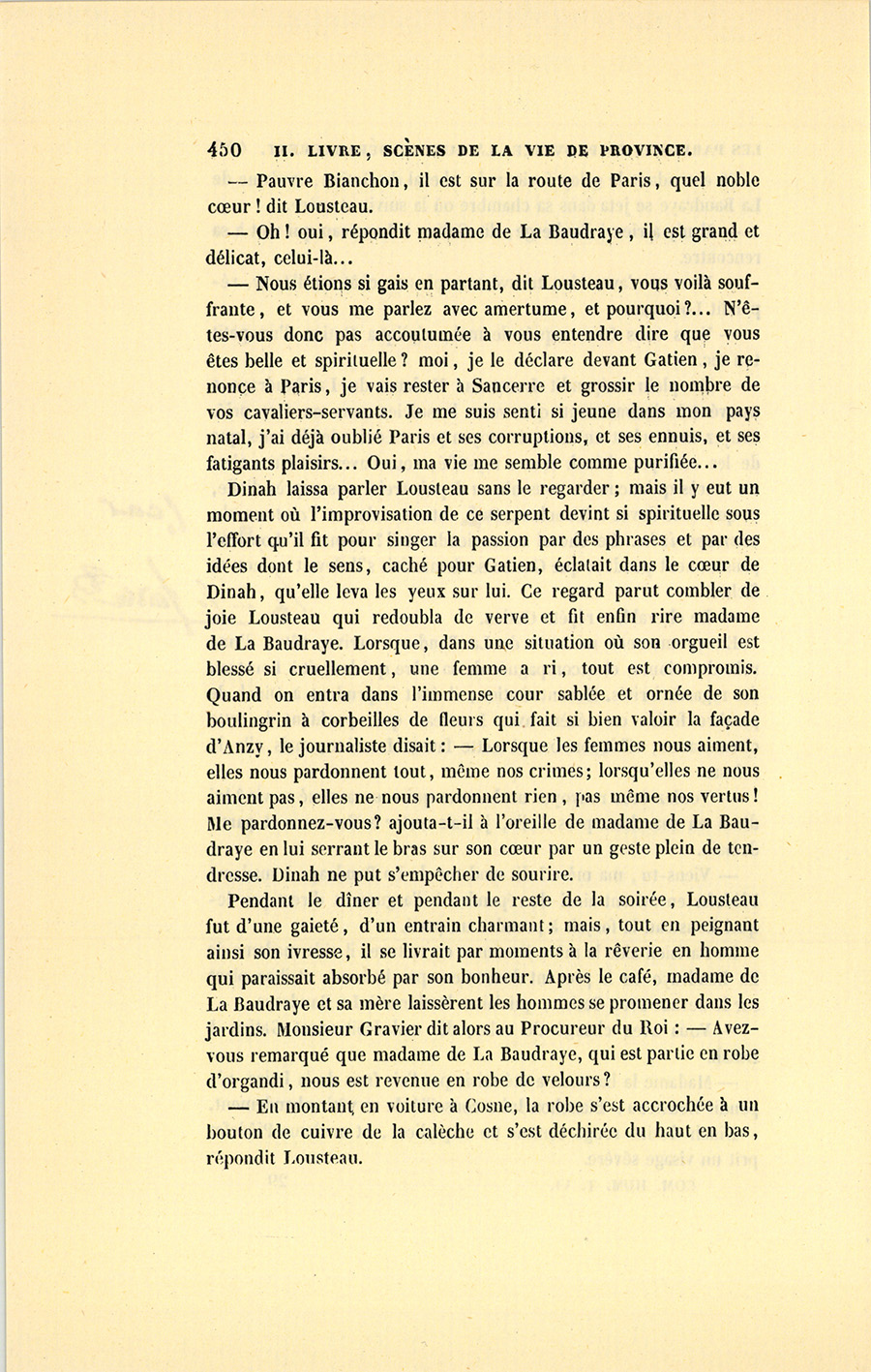 Il se jouait, en effet, dans le ménage de madame de La Baudraye une tragi-comédie en harmonie avec ses luttes relativement à la fortune, avec ses transformations successives, et dont, après l’abbé {p. 382} Duret, monsieur de Clagny seul eut connaissance, lorsque Dinah, par désœuvrement, par vanité peut être, lui livra le secret de sa gloire anonyme.