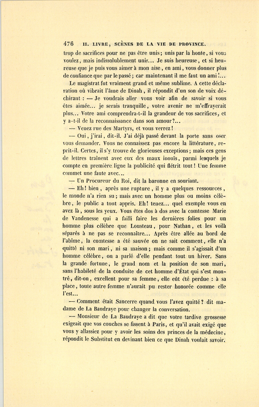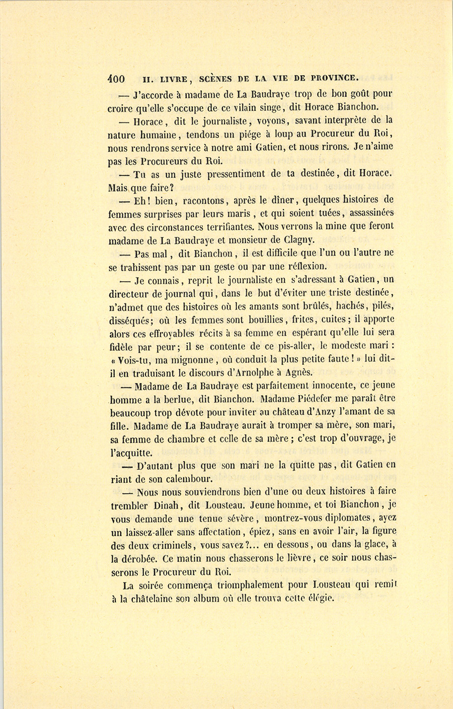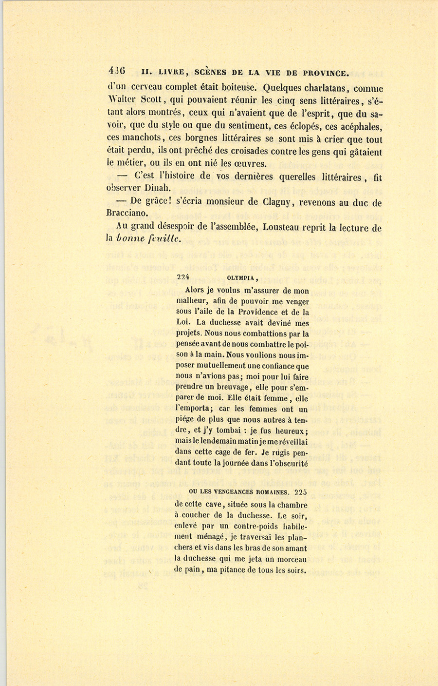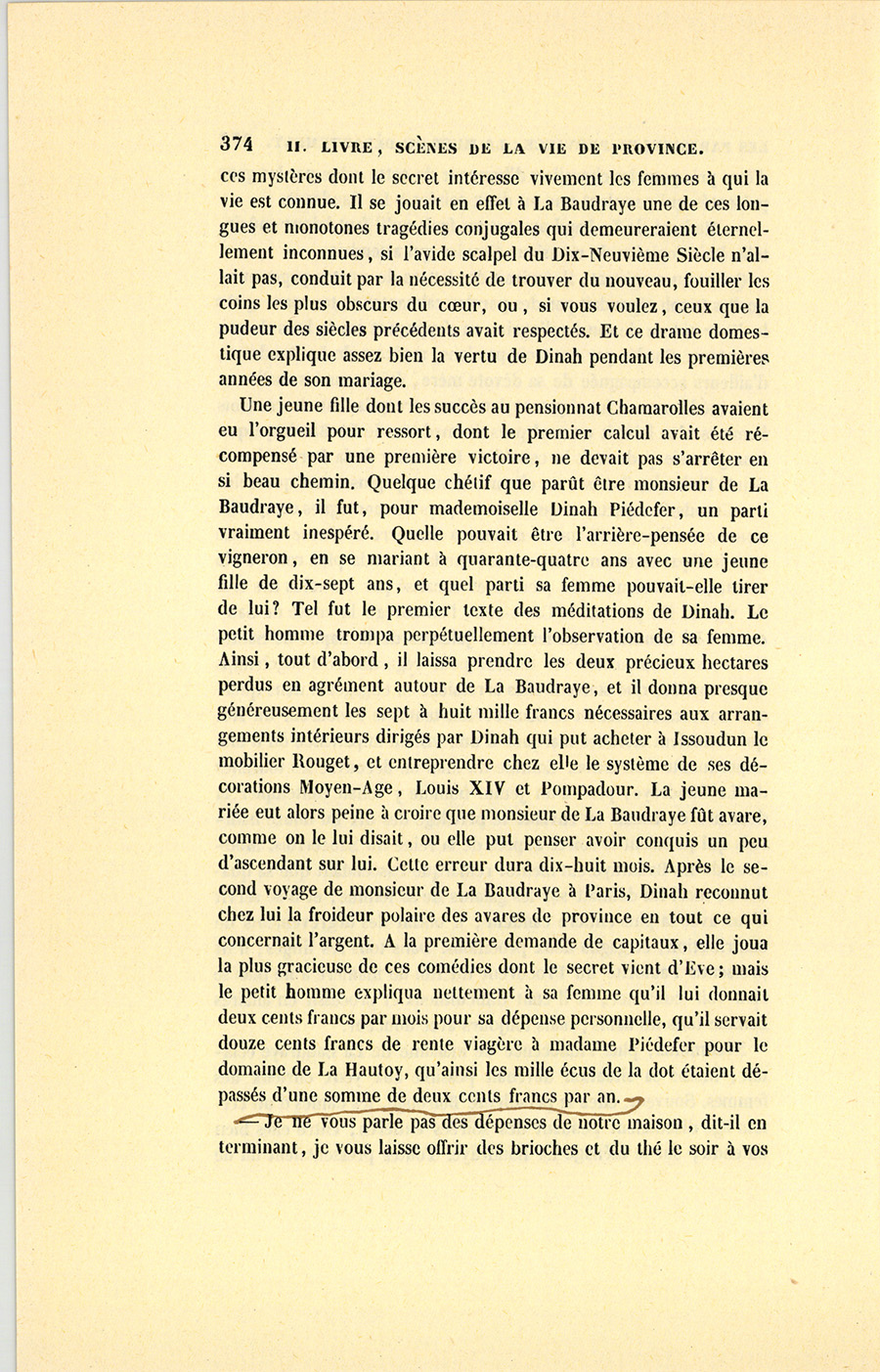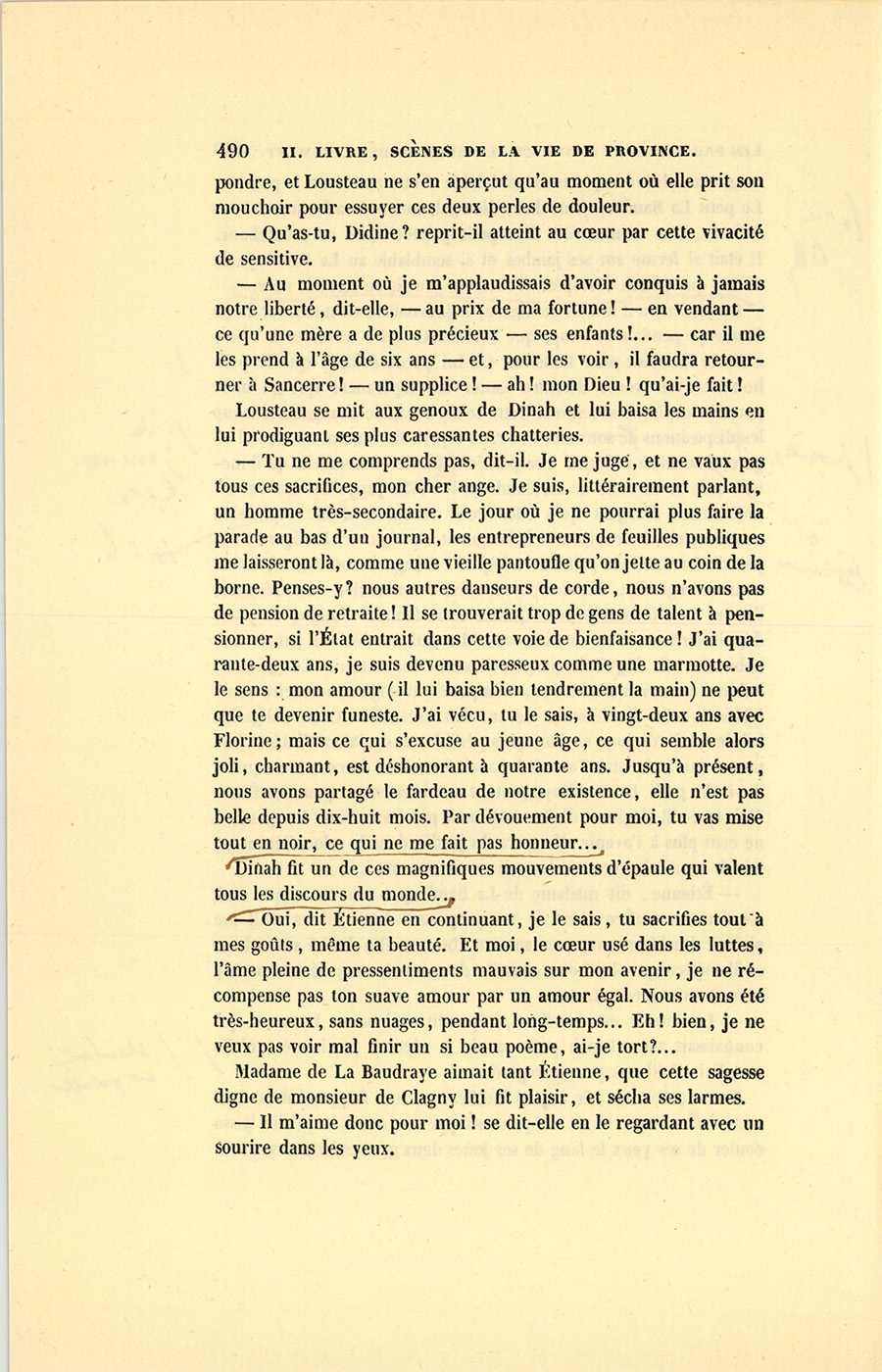 Il se jouait, en effet, dans le ménage de madame de La Baudraye une tragi-comédie en harmonie avec ses luttes relativement à la fortune, avec ses transformations successives, et dont, après l’abbé {p. 382} Duret, monsieur de Clagny seul eut connaissance, lorsque Dinah, par désœuvrement, par vanité peut être, lui livra le secret de sa gloire anonyme.