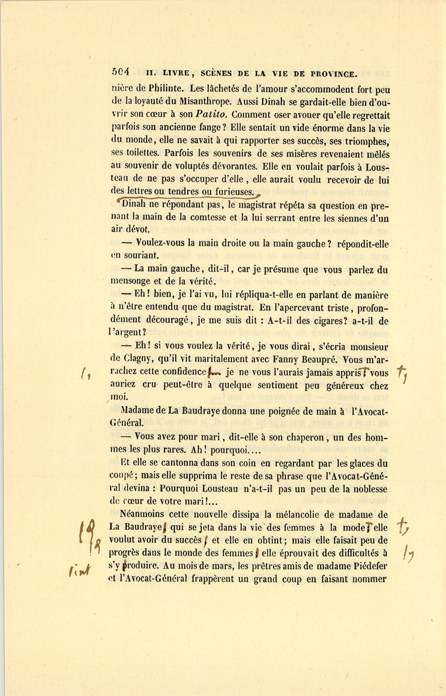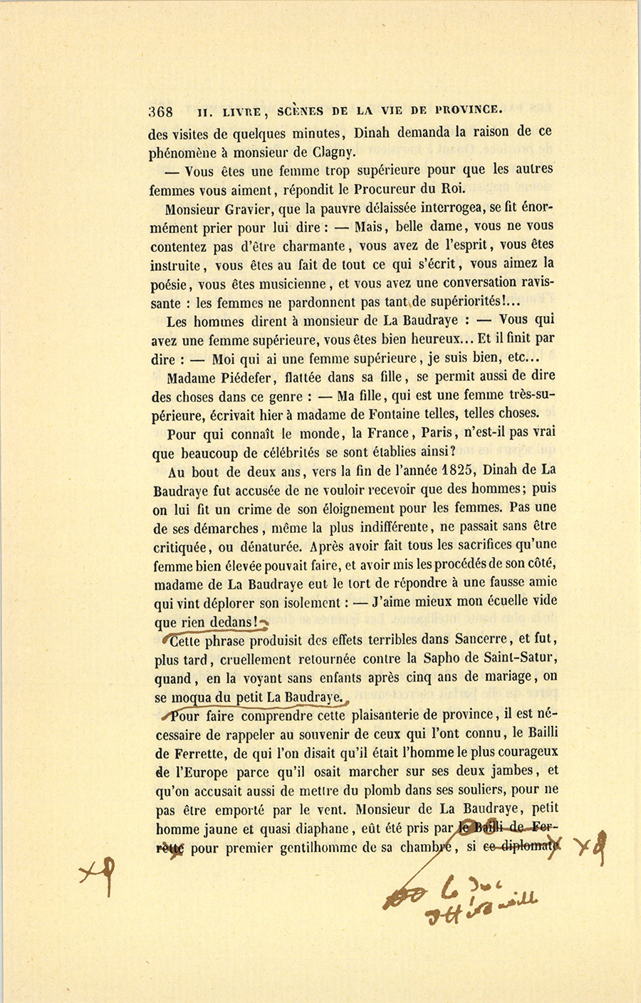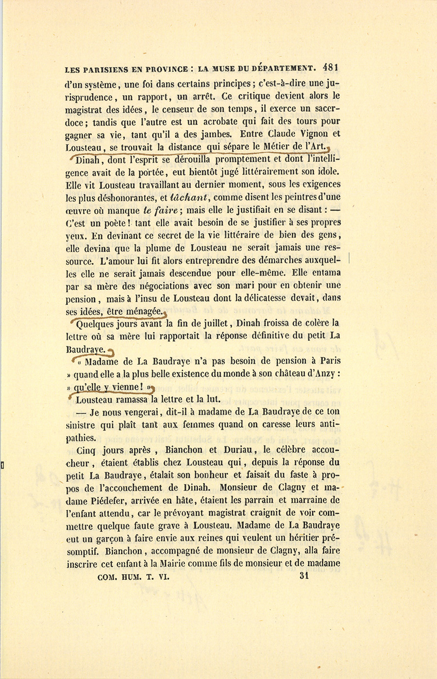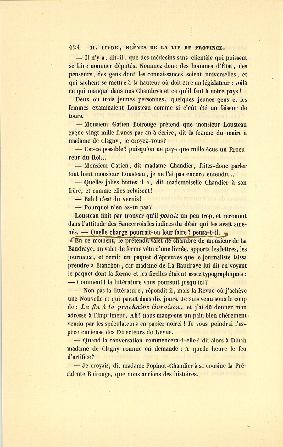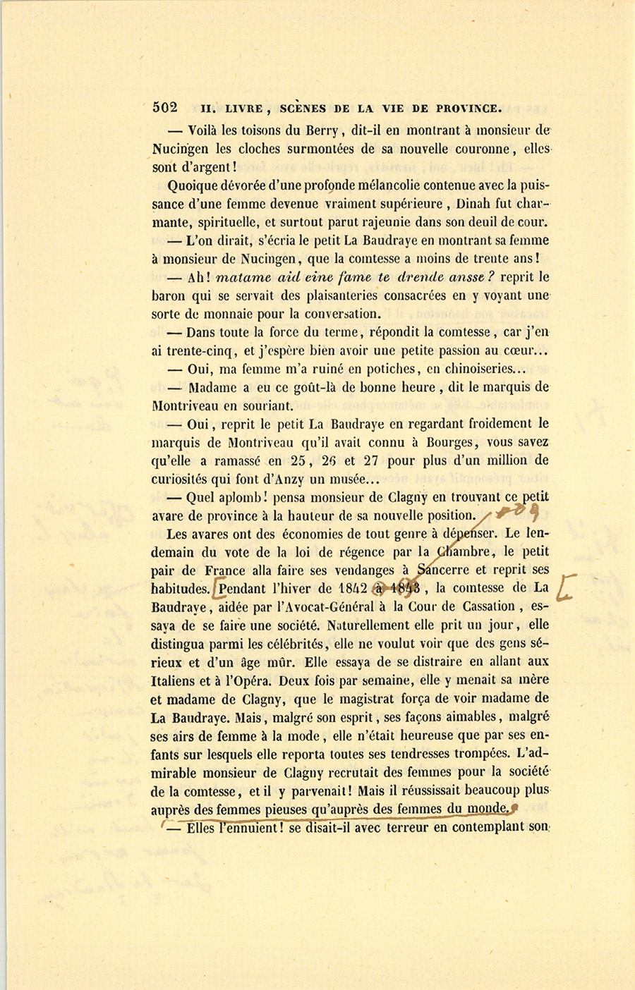 Il se jouait, en effet, dans le ménage de madame de La Baudraye une tragi-comédie en harmonie avec ses luttes relativement à la fortune, avec ses transformations successives, et dont, après l’abbé {p. 382} Duret, monsieur de Clagny seul eut connaissance, lorsque Dinah, par désœuvrement, par vanité peut être, lui livra le secret de sa gloire anonyme.