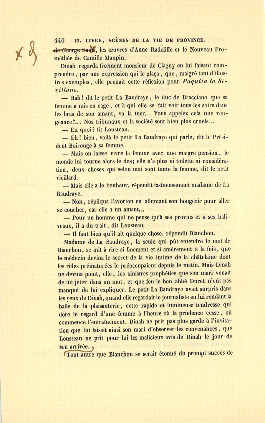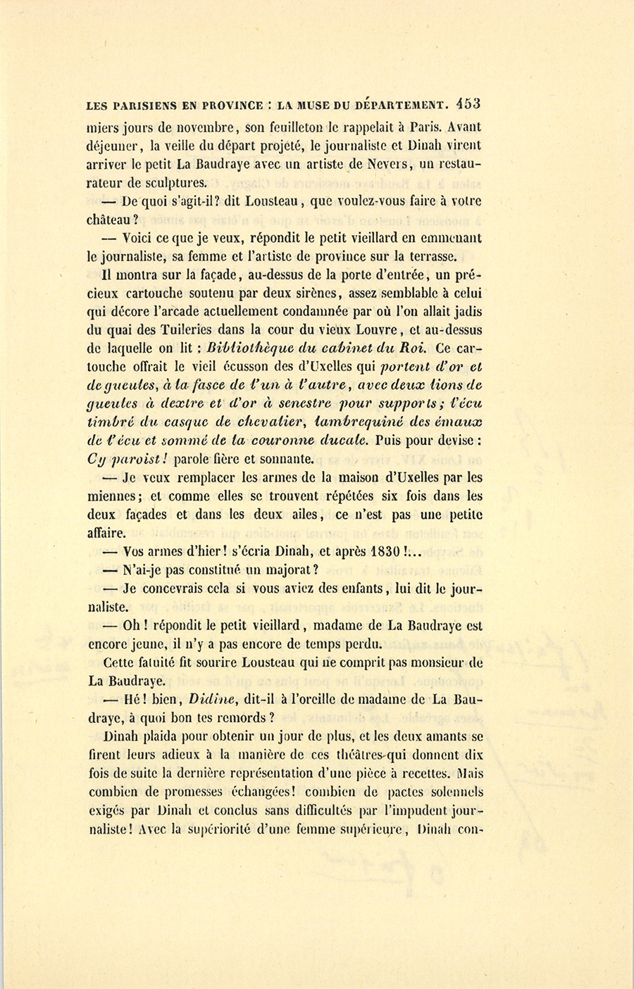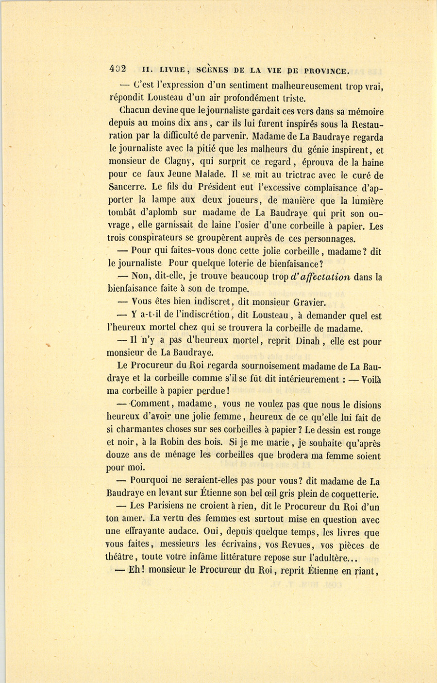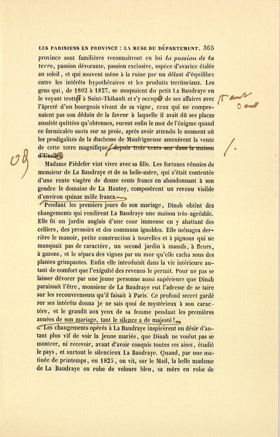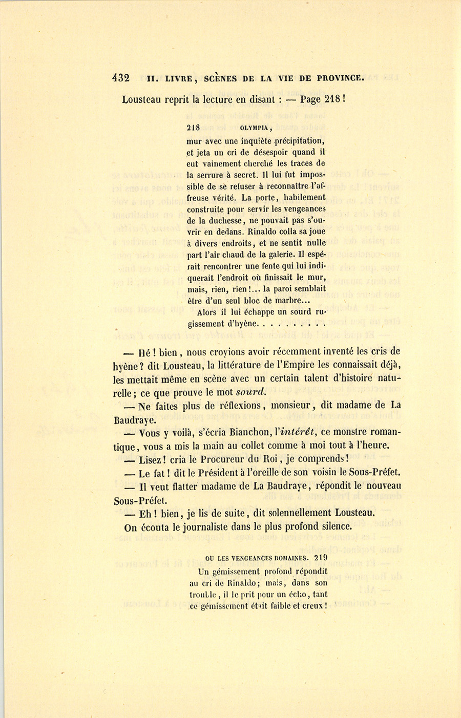 Il se jouait, en effet, dans le ménage de madame de La Baudraye une tragi-comédie en harmonie avec ses luttes relativement à la fortune, avec ses transformations successives, et dont, après l’abbé {p. 382} Duret, monsieur de Clagny seul eut connaissance, lorsque Dinah, par désœuvrement, par vanité peut être, lui livra le secret de sa gloire anonyme.