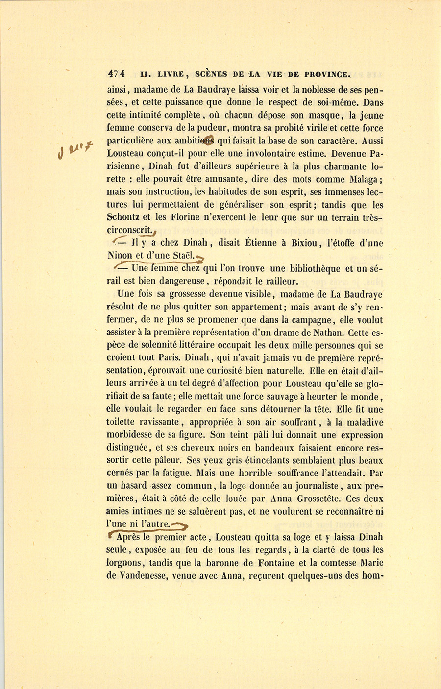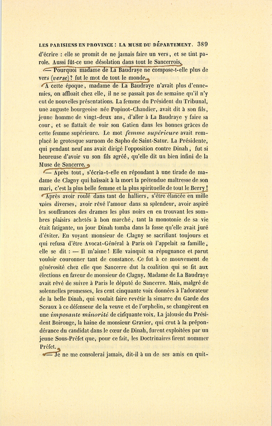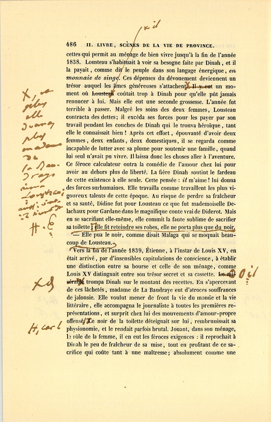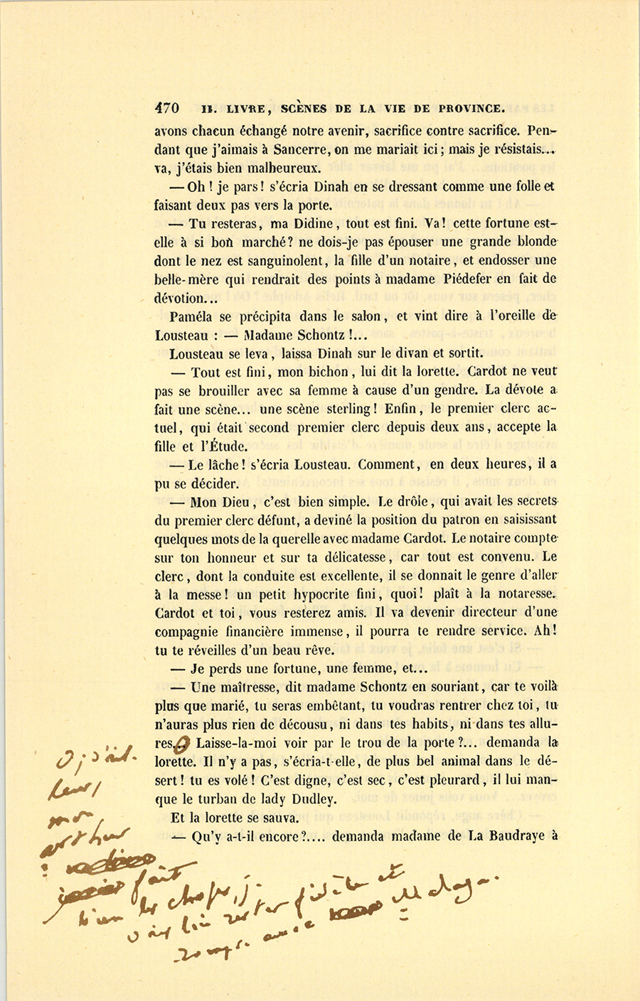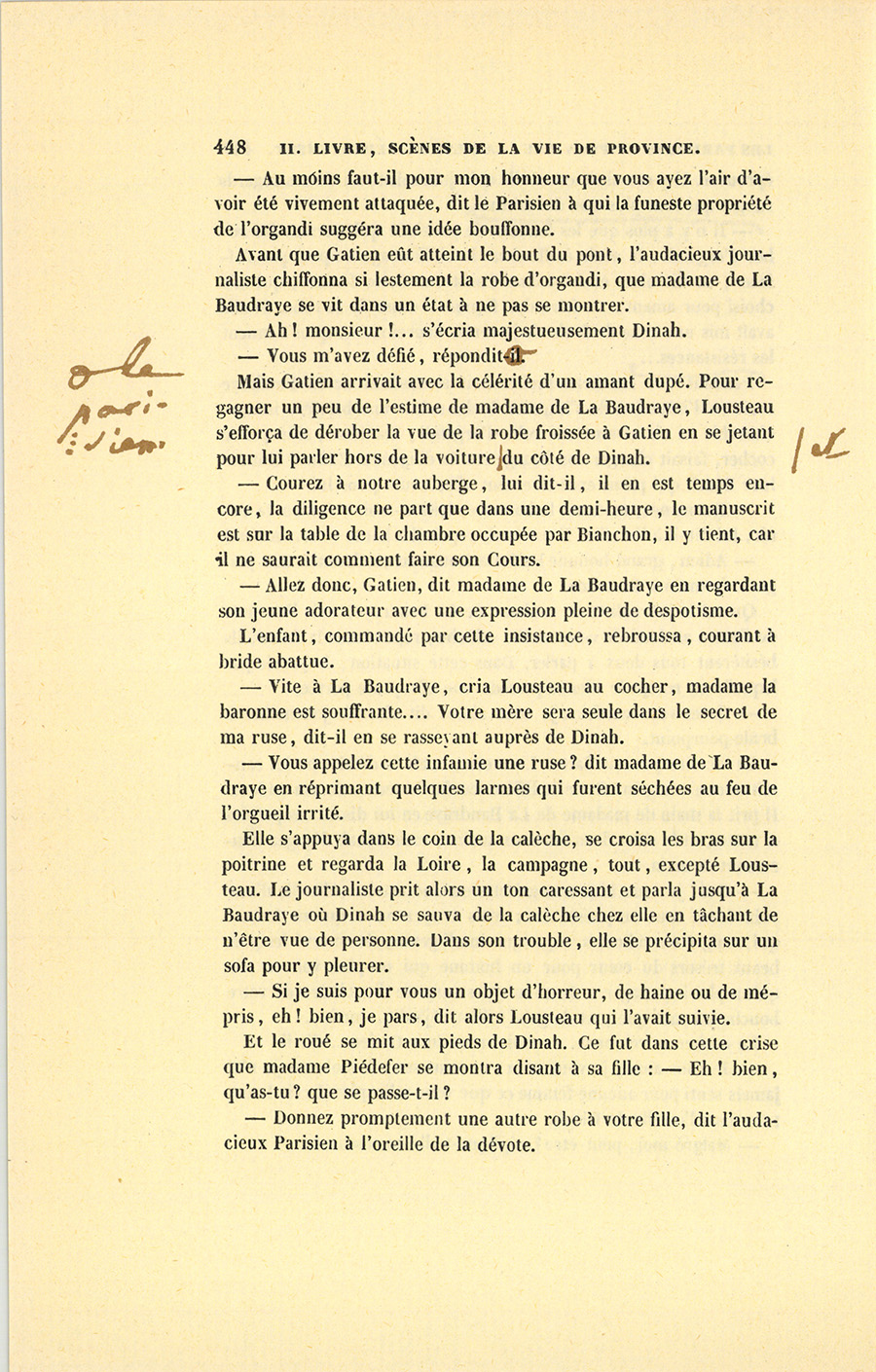 Il se jouait, en effet, dans le ménage de madame de La Baudraye une tragi-comédie en harmonie avec ses luttes relativement à la fortune, avec ses transformations successives, et dont, après l’abbé {p. 382} Duret, monsieur de Clagny seul eut connaissance, lorsque Dinah, par désœuvrement, par vanité peut être, lui livra le secret de sa gloire anonyme.
