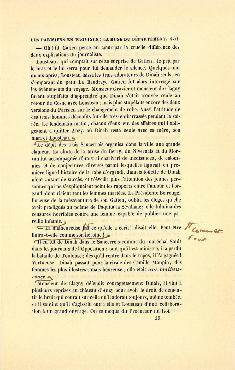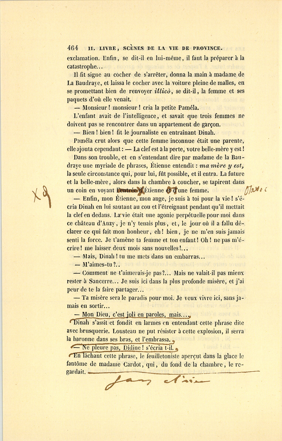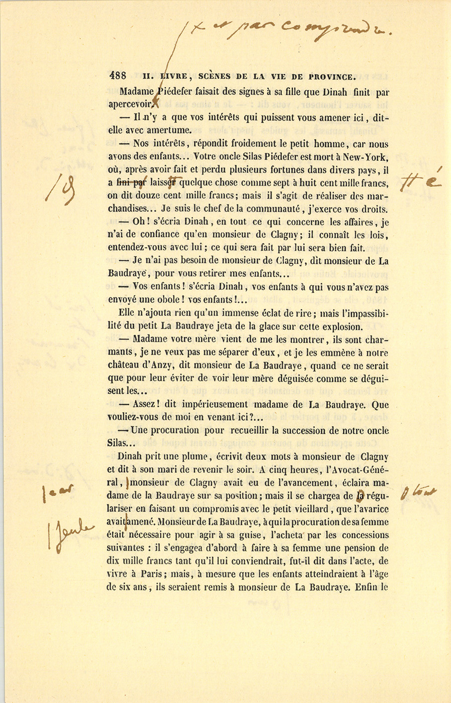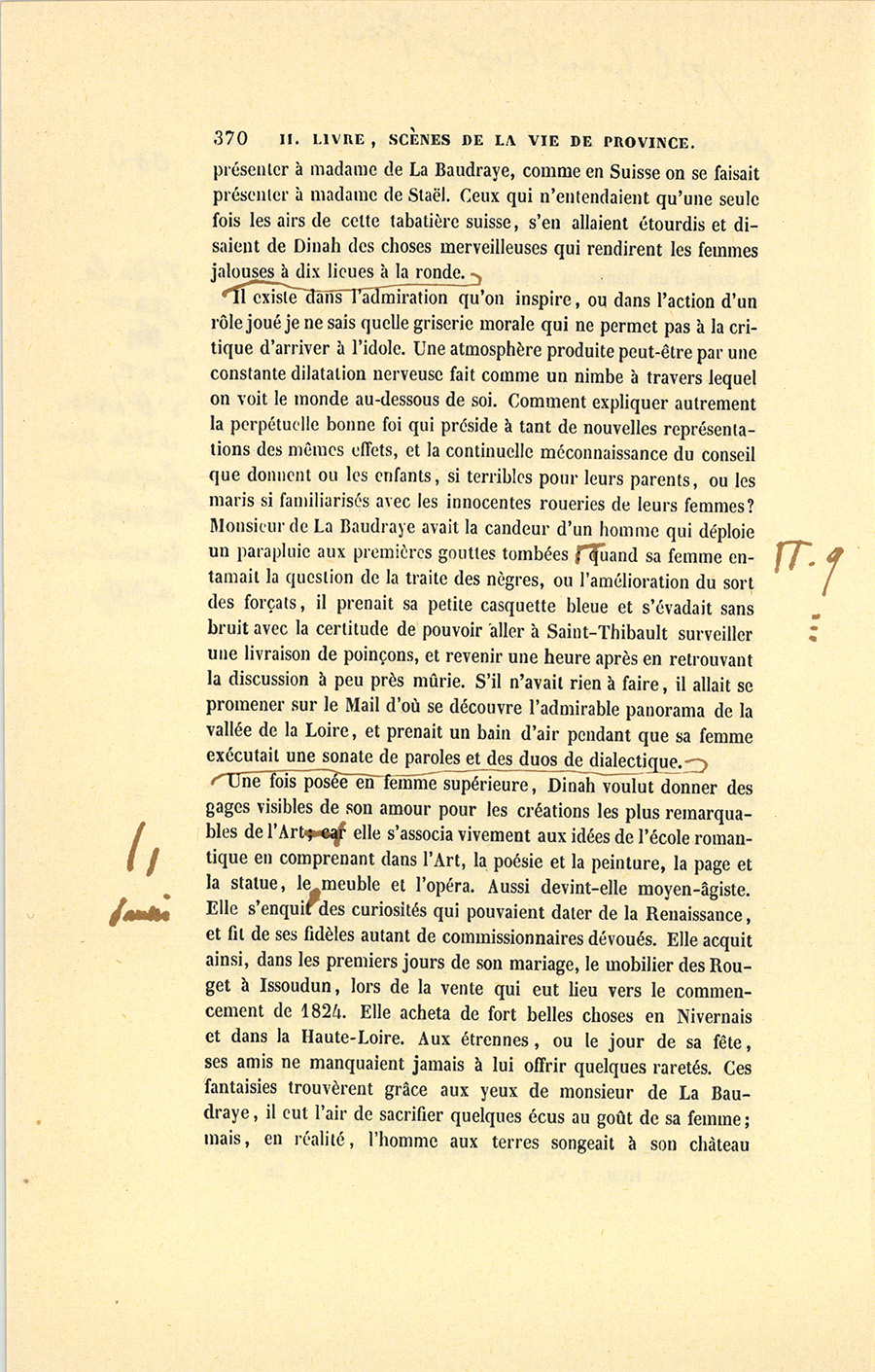 Il se jouait, en effet, dans le ménage de madame de La Baudraye une tragi-comédie en harmonie avec ses luttes relativement à la fortune, avec ses transformations successives, et dont, après l’abbé {p. 382} Duret, monsieur de Clagny seul eut connaissance, lorsque Dinah, par désœuvrement, par vanité peut être, lui livra le secret de sa gloire anonyme.