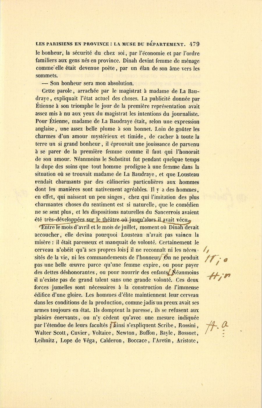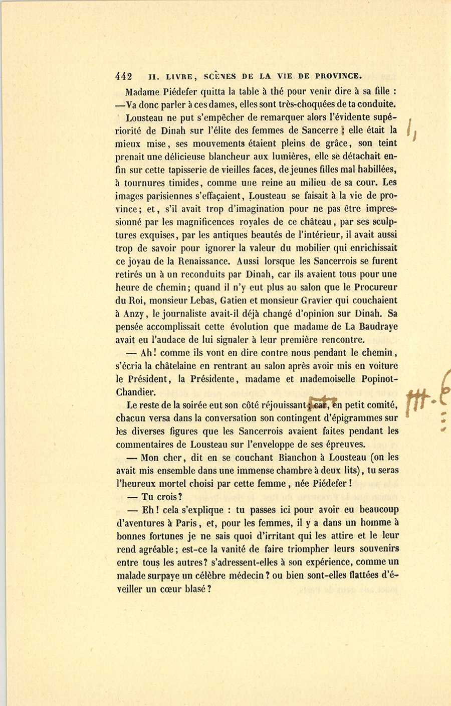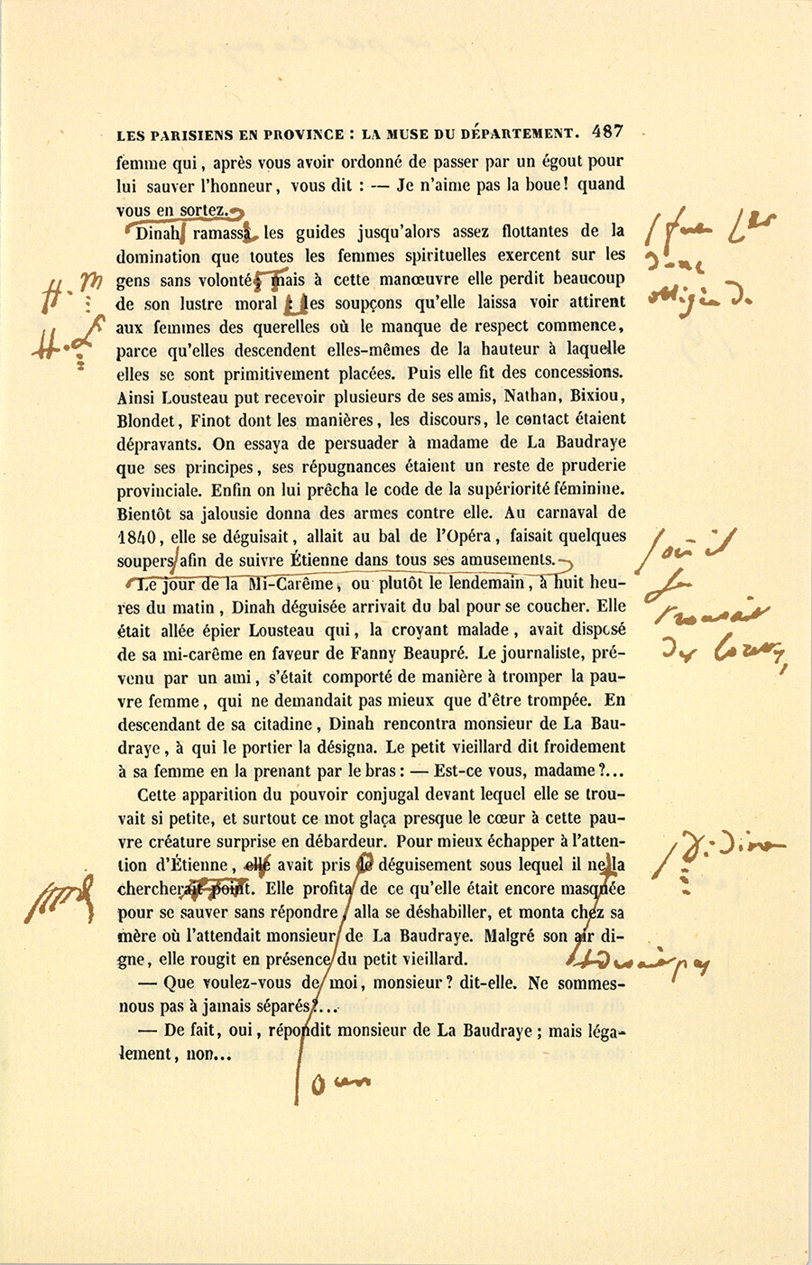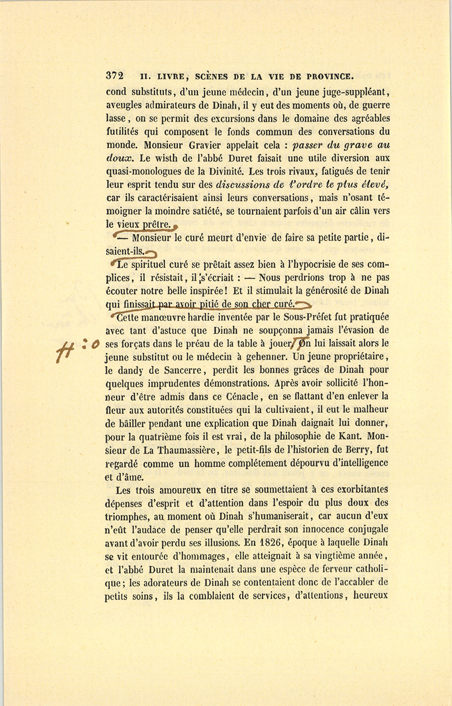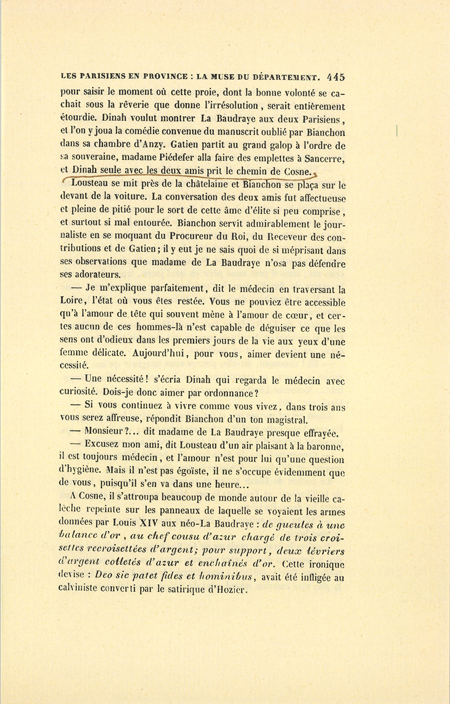 Il se jouait, en effet, dans le ménage de madame de La Baudraye une tragi-comédie en harmonie avec ses luttes relativement à la fortune, avec ses transformations successives, et dont, après l’abbé {p. 382} Duret, monsieur de Clagny seul eut connaissance, lorsque Dinah, par désœuvrement, par vanité peut être, lui livra le secret de sa gloire anonyme.