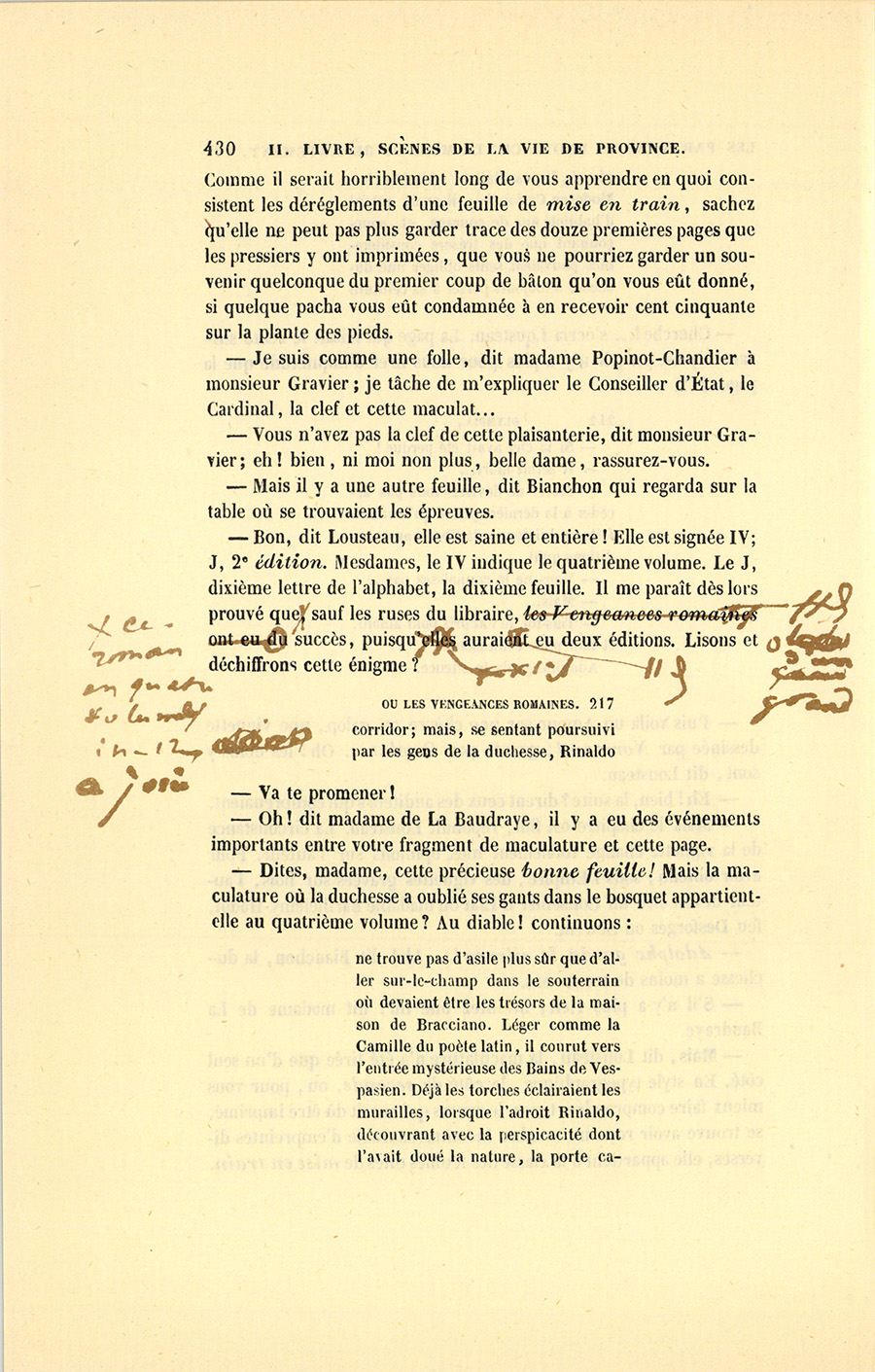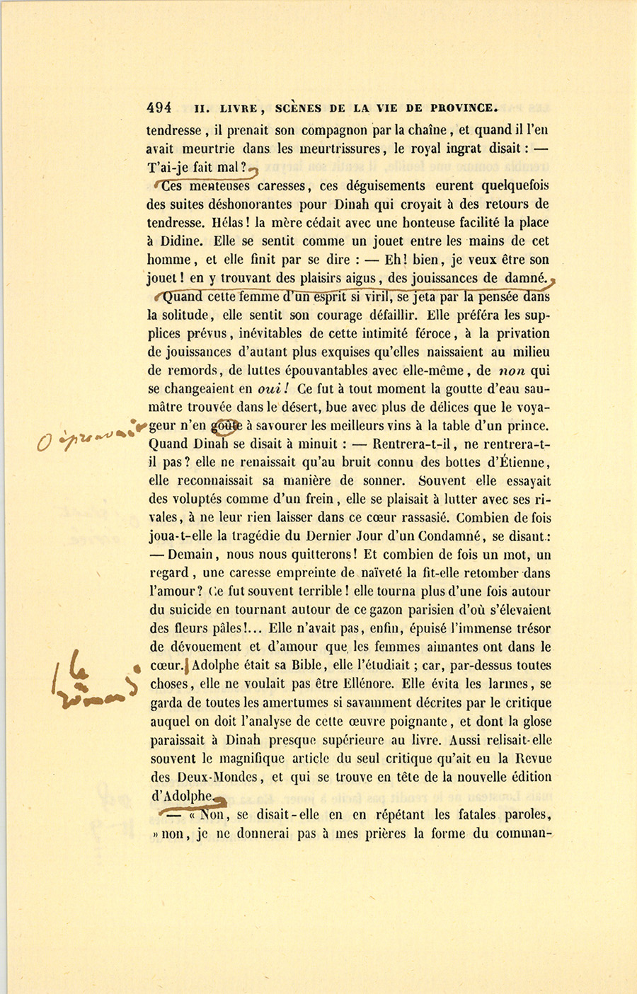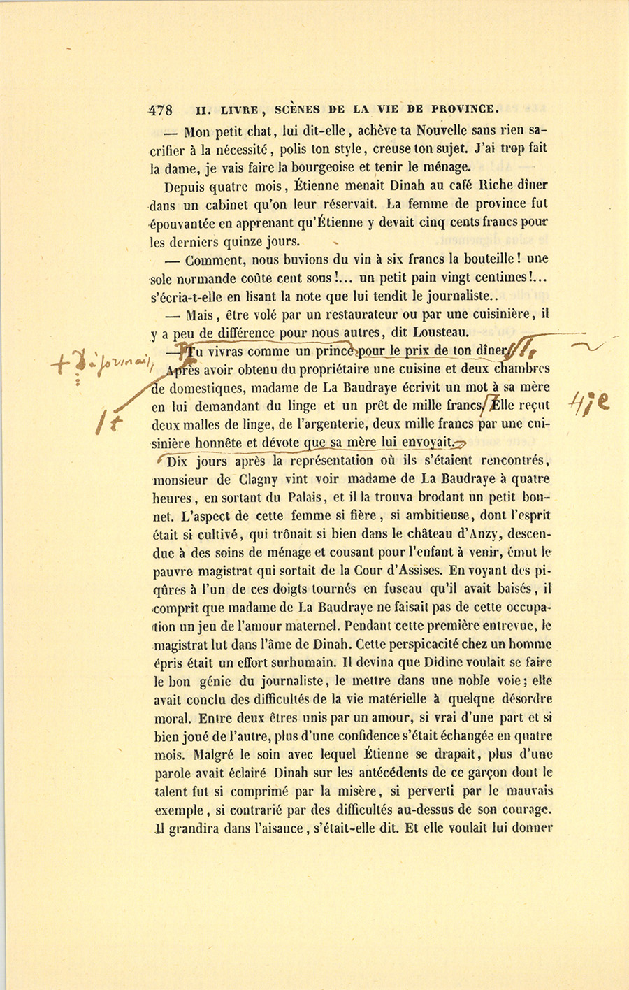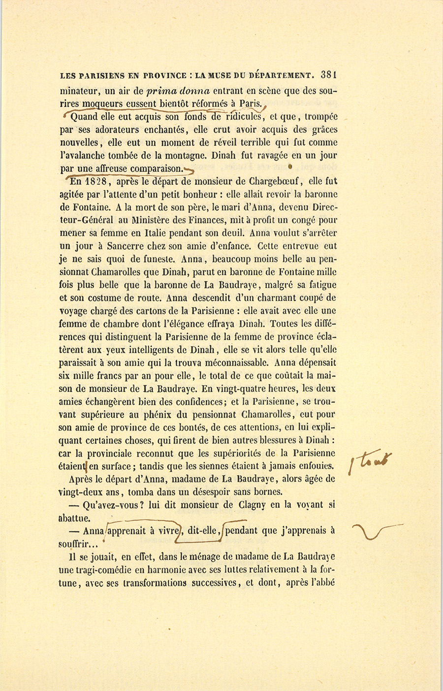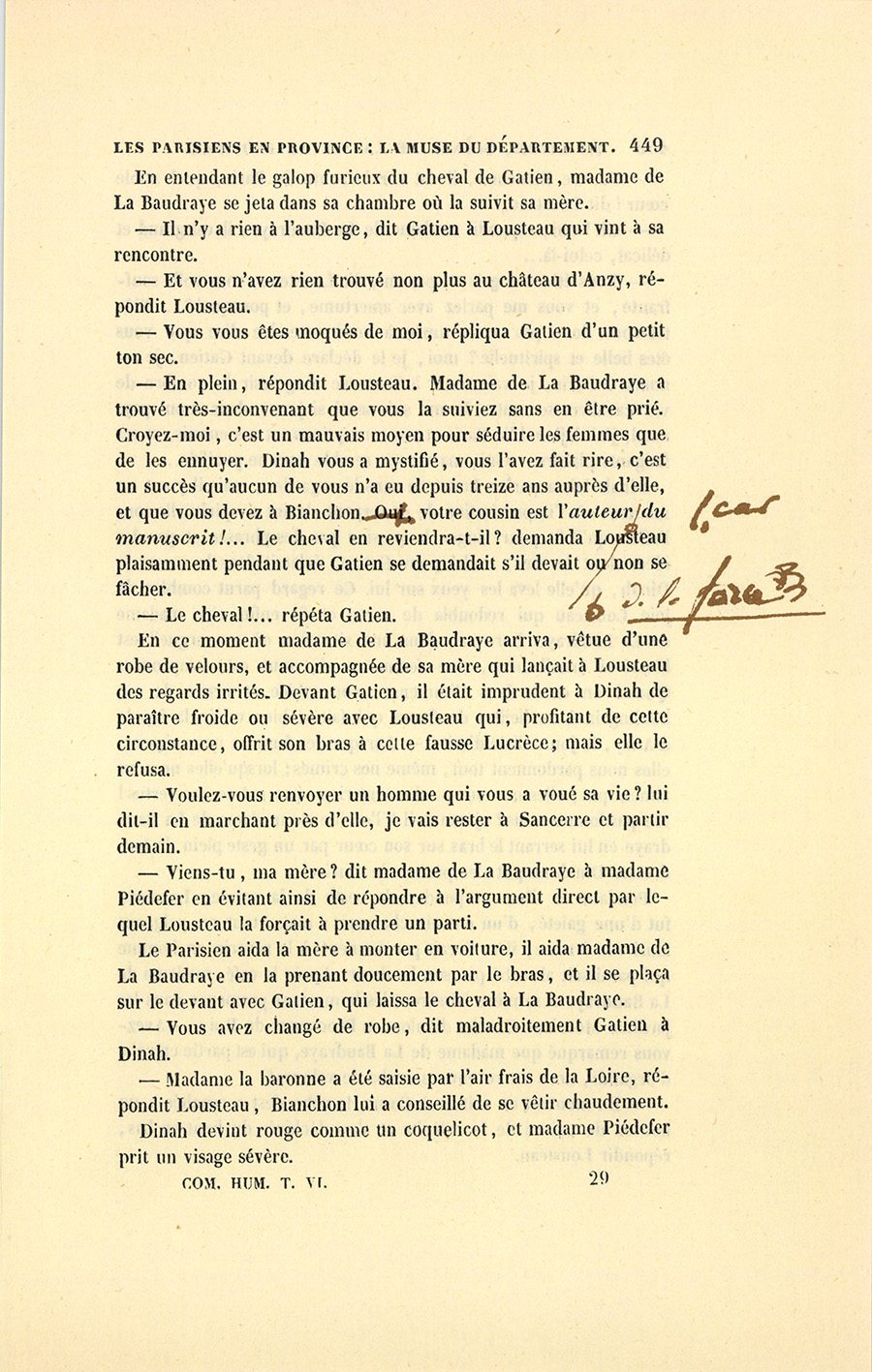 Il se jouait, en effet, dans le ménage de madame de La Baudraye une tragi-comédie en harmonie avec ses luttes relativement à la fortune, avec ses transformations successives, et dont, après l’abbé {p. 382} Duret, monsieur de Clagny seul eut connaissance, lorsque Dinah, par désœuvrement, par vanité peut être, lui livra le secret de sa gloire anonyme.