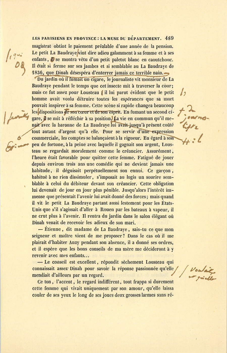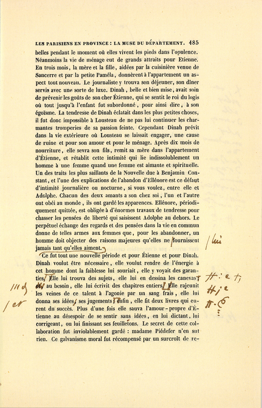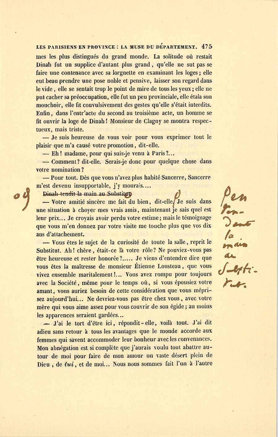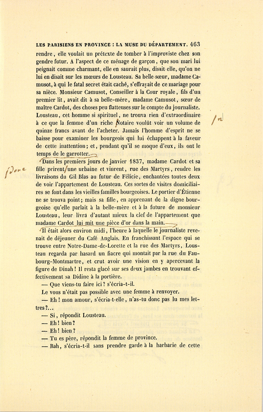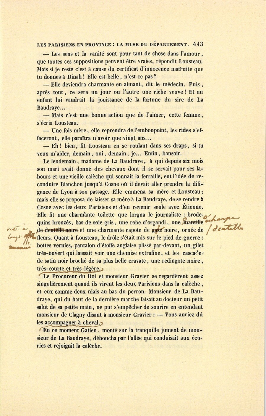 Il se jouait, en effet, dans le ménage de madame de La Baudraye une tragi-comédie en harmonie avec ses luttes relativement à la fortune, avec ses transformations successives, et dont, après l’abbé {p. 382} Duret, monsieur de Clagny seul eut connaissance, lorsque Dinah, par désœuvrement, par vanité peut être, lui livra le secret de sa gloire anonyme.
