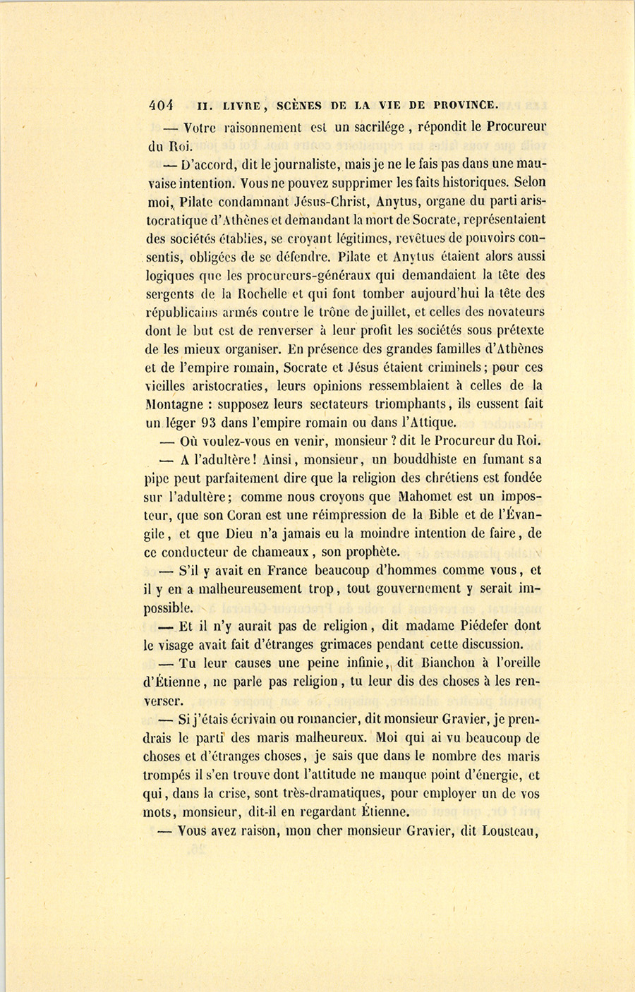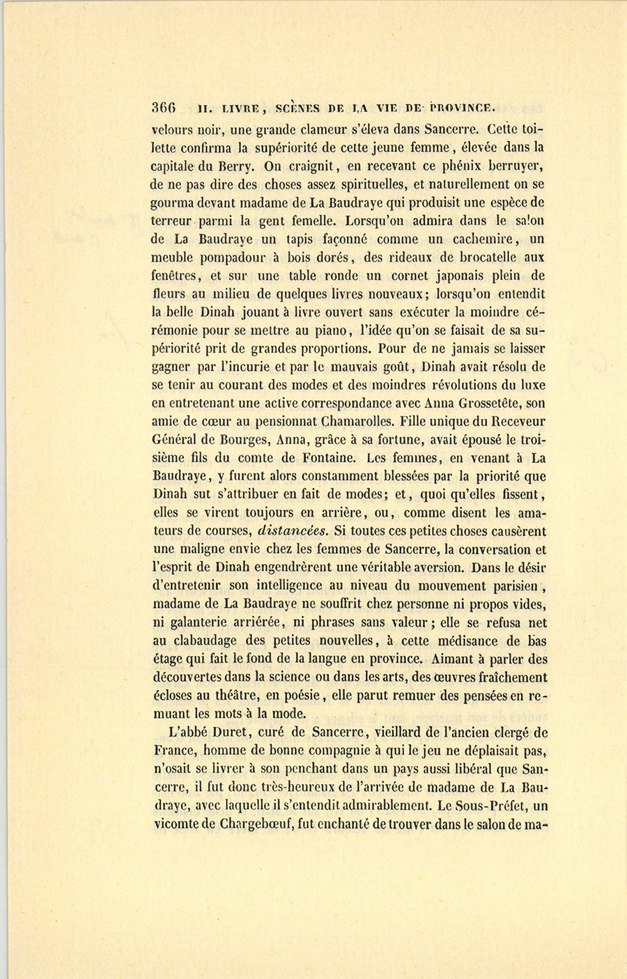 L’abbé Duret, curé de Sancerre, vieillard de l’ancien clergé de France, homme de bonne compagnie à qui le jeu ne déplaisait pas, n’osait se livrer à son penchant dans un pays aussi libéral que Sancerre, il fut donc très-heureux de l’arrivée de madame de La Baudraye, avec laquelle il s’entendit admirablement. Le Sous-Préfet, un vicomte de Chargebœuf, fut enchanté de trouver dans le salon de {p. 367} madame de La Baudraye une espèce d’oasis où l’on faisait trêve à la vie de province. Quant à monsieur de Clagny, le Procureur du Roi, son admiration pour la belle Dinah le cloua dans Sancerre. Ce passionné magistrat refusa tout avancement, et se mit à aimer pieusement cet ange de grâce et de beauté. C’était un grand homme sec, à figure patibulaire ornée de deux yeux terribles, à orbites charbonnées, surmontées de deux sourcils énormes, et dont l’éloquence, bien différente de son amour, ne manquait pas de mordant. Monsieur Gravier était un petit homme gros et gras qui, sous l’Empire, chantait admirablement la romance, et qui dut à ce talent le poste éminent de payeur-général d’armée. Mêlé à de grands intérêts en Espagne avec certains généraux en chef appartenant alors à l’Opposition, il sut mettre à profit ces liaisons parlementaires auprès du Ministre, qui, par égard à sa position perdue, lui promit la recette de Sancerre, et finit par la lui laisser acheter. L’esprit léger, le ton du temps de l’Empire s’était alourdi chez monsieur Gravier, il ne comprit pas ou ne voulut pas comprendre la différence énorme qui sépara les mœurs de la Restauration de celles de l’Empire ; mais il se croyait bien supérieur à monsieur de Clagny, sa tenue était de meilleur goût, il suivait les modes, il se montrait en gilet jaune, en pantalon gris, en petites redingotes serrées, il avait au cou des cravates de soieries à la mode, les mains ornées de bagues6 à diamants ; tandis que le Procureur du Roi ne sortait pas de l’habit, du pantalon et du gilet noirs, souvent râpés.
