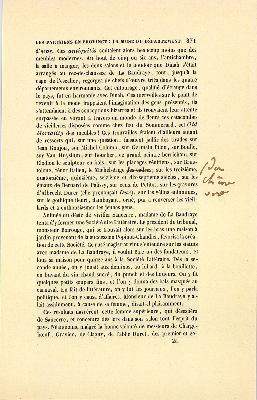 Animée du désir de vivifier Sancerre, madame de La Baudraye tenta d’y former une Société dite Littéraire. Le président du tribunal, monsieur Boirouge, qui se trouvait alors sur les bras une maison à jardin provenant de la succession Popinot-Chandier, favorisa la création de cette Société. Ce rusé magistrat vint s’entendre sur les statuts avec madame de La Baudraye, il voulut être un des fondateurs, et loua sa maison pour quinze ans à la Société Littéraire. Dès la seconde année, on y jouait aux dominos, au billard, à la bouillotte, en buvant du vin chaud sucré, du punch et des liqueurs. On y fit quelques petits soupers fins, et l’on y donna des bals masqués au carnaval. En fait de littérature, on y lut les journaux, l’on y parla politique, et l’on y causa d’affaires. Monsieur de La Baudraye y allait assidument, à cause de sa femme, disait-il plaisamment.