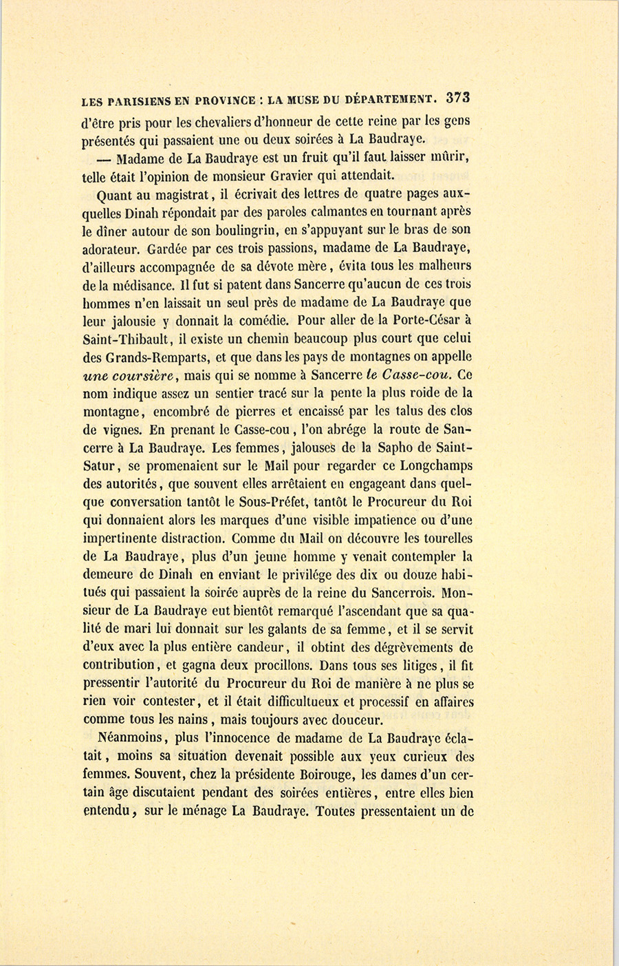 Quant au magistrat, il écrivait des lettres de quatre pages auxquelles Dinah répondait par des paroles calmantes en tournant après le dîner autour de son boulingrin, en s’appuyant sur le bras de son adorateur. Gardée par ces trois passions, madame de La Baudraye, d’ailleurs accompagnée de sa dévote mère, évita tous les malheurs de la médisance. Il fut si patent dans Sancerre qu’aucun de ces trois hommes n’en laissait un seul près de madame de La Baudraye que leur jalousie y donnait la comédie. Pour aller de la Porte-César à Saint-Thibault, il existe un chemin beaucoup plus court que celui des Grands-Remparts, et que dans les pays de montagnes on appelle une coursière, mais qui se nomme à Sancerre le Casse-cou. Ce nom indique assez un sentier tracé sur la pente la plus roide de la montagne, encombré de pierres et encaissé par les talus des clos de vignes. En prenant le Casse-cou, l’on abrège la route de Sancerre à La Baudraye. Les femmes, jalouses de la Sapho de Saint-Satur, se promenaient sur le Mail pour regarder ce Longchamps des autorités, que souvent elles arrêtaient en engageant dans quelque conversation tantôt le Sous-Préfet, tantôt le Procureur du Roi qui donnaient alors les marques d’une visible impatience ou d’une impertinente distraction. Comme du Mail on découvre les tourelles de La Baudraye, plus d’un jeune homme y venait contempler la demeure de Dinah en enviant le privilége des dix ou douze habitués qui passaient la soirée auprès de la reine du Sancerrois. Monsieur de La Baudraye eut bientôt remarqué l’ascendant que sa qualité de mari lui donnait sur les galants de sa femme, et il se servit d’eux avec la plus entière candeur, il obtint des dégrèvements de contribution, et gagna deux procillons. Dans tous ses litiges, il fit pressentir l’autorité du Procureur du Roi de manière à ne plus se rien voir contester, et il était difficultueux et processif en affaires comme tous les nains, mais toujours avec douceur.
