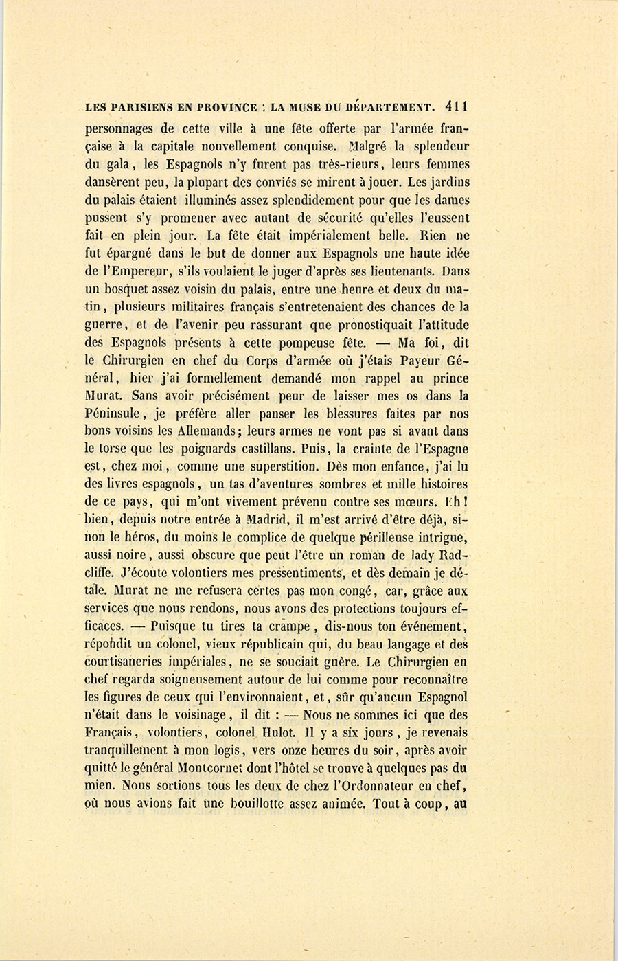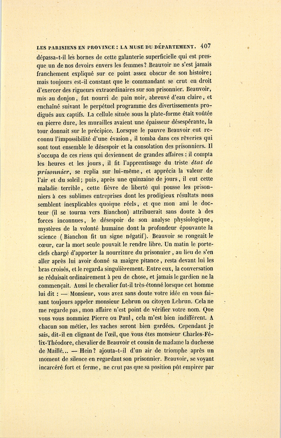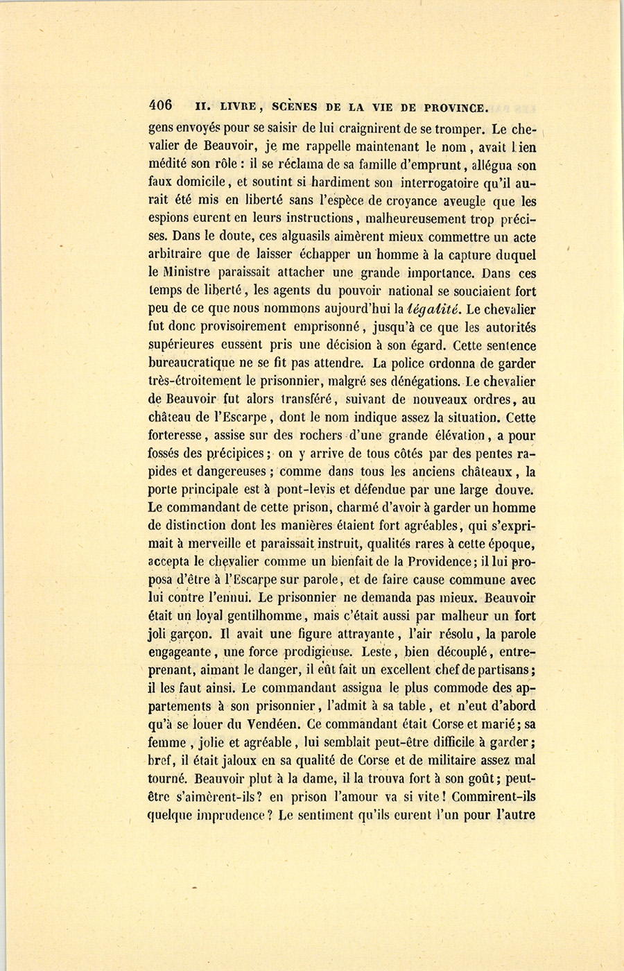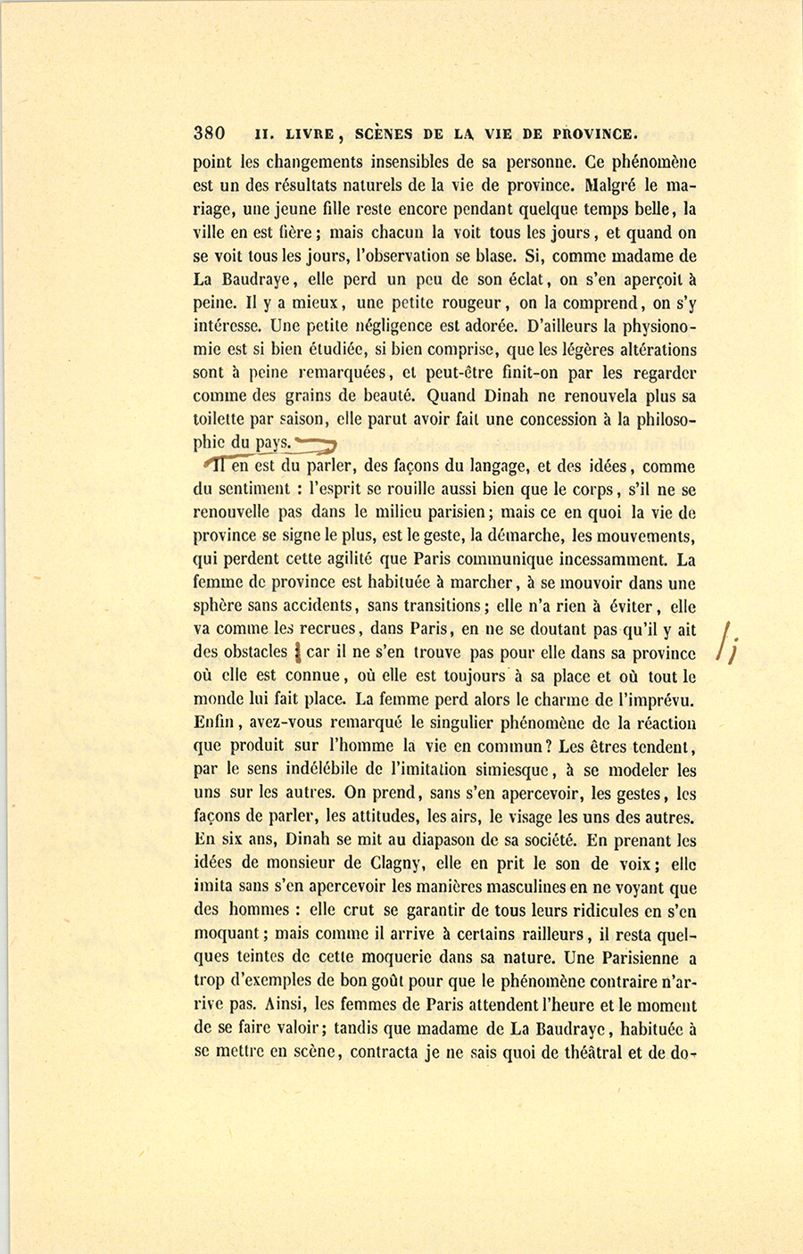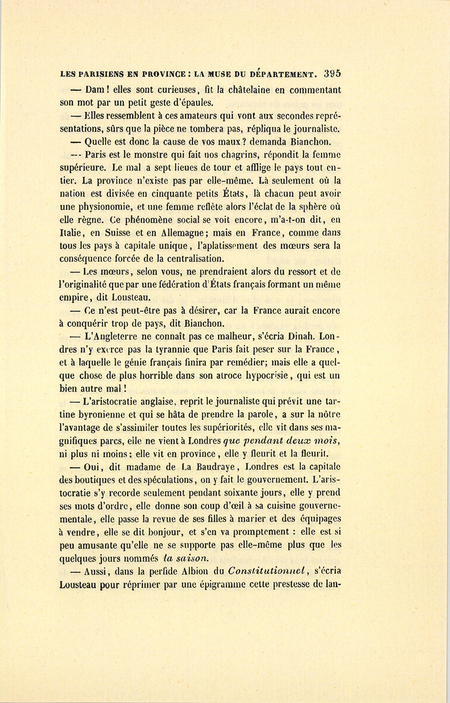 – Paris est le monstre qui fait nos chagrins, répondit la femme supérieure. Le mal a sept lieues de tour et afflige le pays tout entier. La province n’existe pas par elle-même. Là seulement où la nation est divisée en cinquante petits États, là chacun peut avoir une physionomie, et une femme reflète alors l’éclat de la sphère où elle règne. Ce phénomène social se voit encore, m’a-t-on dit, en Italie, en Suisse et en Allemagne ; mais en France, comme dans tous les pays à capitale unique, l’aplatissement des mœurs sera la conséquence forcée de la centralisation.
