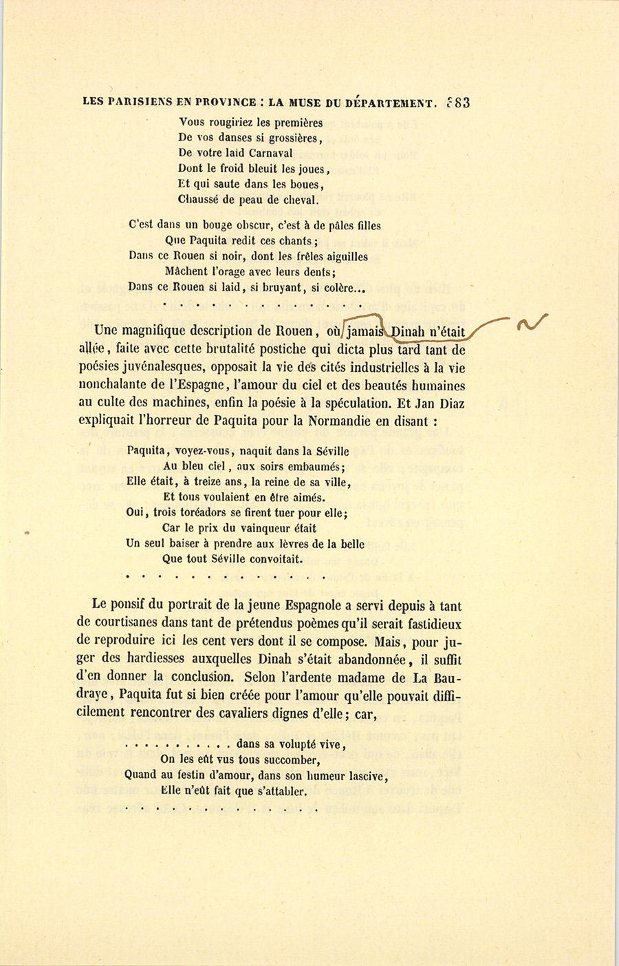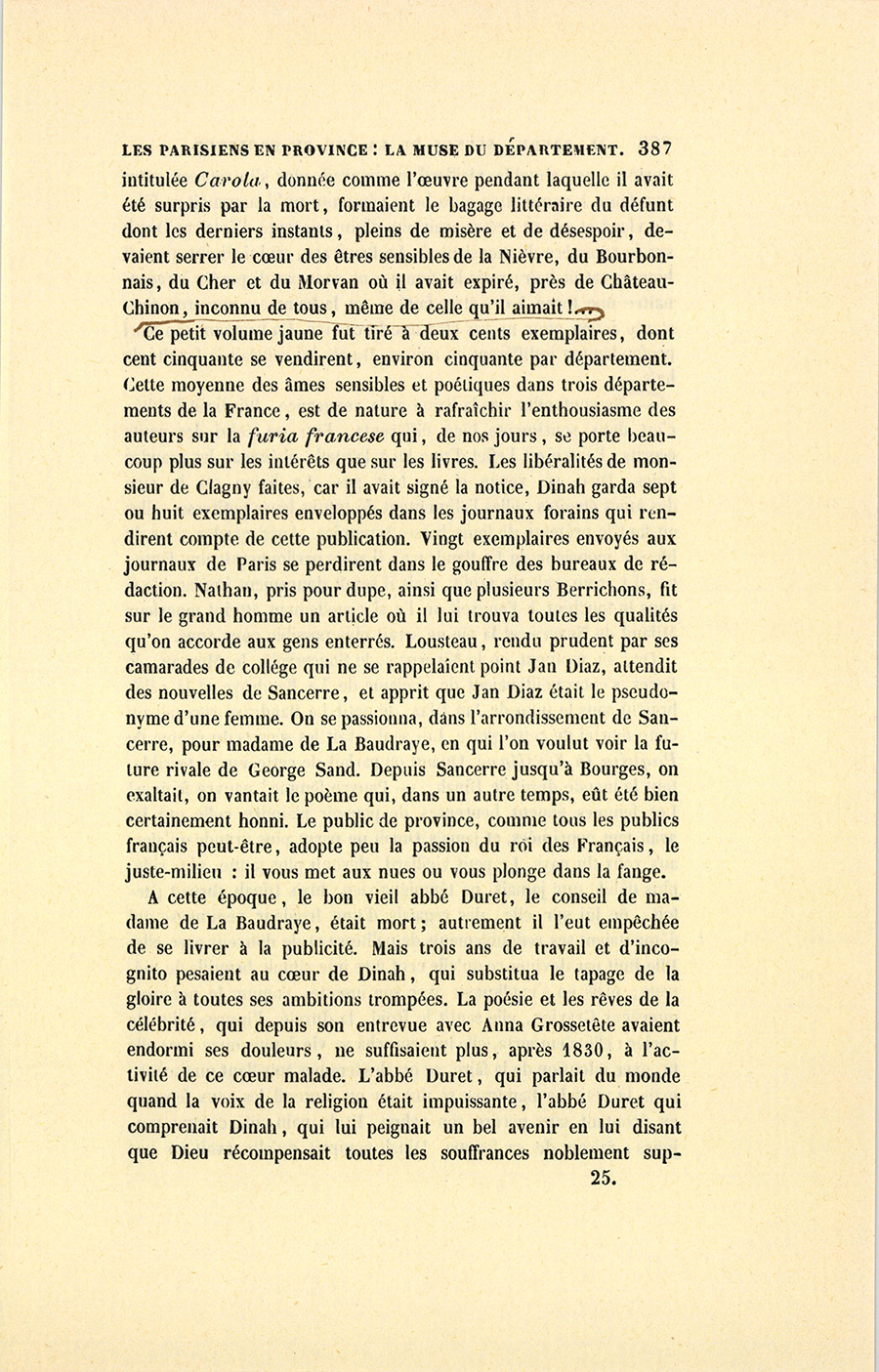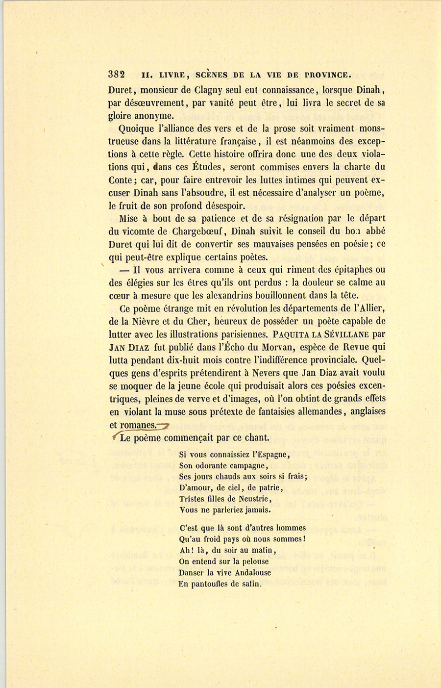 Quand, après la révolution de 1830, la gloire de Georges Sand rayonna sur le Berry, beaucoup de villes envièrent à La Châtre le privilége d’avoir vu naître une rivale à madame de Staël, à Camille Maupin, et furent assez disposées à honorer les moindres talents féminins. Aussi vit-on alors beaucoup de Dixièmes Muses en France, jeunes filles ou jeunes femmes détournées d’une vie paisible par un semblant de gloire ! D’étranges doctrines se publiaient alors sur le rôle que les femmes devaient jouer dans la Société. Sans que le bon sens qui fait le fond de l’esprit en France en fût perverti, l’on passait aux femmes d’exprimer des idées, de professer des sentiments qu’elles n’eussent pas avoués quelques années auparavant. Monsieur de Clagny profita de cet instant de licence pour réunir, en un petit volume in-18 qui fut imprimé par Desroziers, à Moulins, les œuvres de Jan Diaz. Il composa sur ce jeune écrivain, ravi si prématurément aux Lettres, une notice spirituelle pour ceux qui savaient le mot de l’énigme ; mais qui n’avait pas alors en littérature le mérite de la nouveauté. Ces plaisanteries, excellentes quand l’incognito se garde, deviennent un peu froides quand, plus tard, l’auteur se montre. Mais sous ce rapport, la notice sur Jan Diaz, fils d’un prisonnier espagnol et né vers 1807, à Bourges, a des chances pour tromper un jour les faiseurs de Biographies Universelles. Rien n’y manque, ni les noms des professeurs du collége de Bourges, ni ceux des condisciples du poète mort, tels que Lousteau, Bianchon, et autres célèbres berruyers qui sont censés l’avoir connu rêveur, mélancolique, annonçant de précoces dispositions pour la poésie. Une élégie intitulée : Tristesse faite au collége, les deux poèmes de Paquita la Sévillane et du Chêne de la messe, trois sonnets, une description de la cathédrale de Bourges et de l’hôtel de Jacques-Cœur, enfin une nouvelle {p. 387} intitulée Carola, donnée comme l’œuvre pendant laquelle il avait été surpris par la mort, formaient le bagage littéraire du défunt dont les derniers instants, pleins de misère et de désespoir, devaient serrer le cœur des êtres sensibles de la Nièvre, du Bourbonnais, du Cher et du Morvan où il avait expiré, près de Château-Chinon, inconnu de tous, même de celle qu’il aimait !… Ce petit volume jaune fut tiré à deux cents exemplaires, dont cent cinquante se vendirent, environ cinquante par département. Cette moyenne des âmes sensibles et poétiques dans trois départements de la France, est de nature à rafraîchir l’enthousiasme des auteurs sur la furia francese qui, de nos jours, se porte beaucoup plus sur les intérêts que sur les livres. Les libéralités de monsieur de Clagny faites, car il avait signé la notice, Dinah garda sept ou huit exemplaires enveloppés dans les journaux forains qui rendirent compte de cette publication. Vingt exemplaires envoyés aux journaux de Paris se perdirent dans le gouffre des bureaux de rédaction. Nathan, pris pour dupe, ainsi que plusieurs Berrichons, fit sur le grand homme un article où il lui trouva toutes les qualités qu’on accorde aux gens enterrés. Lousteau, rendu prudent par ses camarades de collége qui ne se rappelaient point Jan Diaz, attendit des nouvelles de Sancerre, et apprit que Jan Diaz était le pseudonyme d’une femme. On se passionna, dans l’arrondissement de Sancerre, pour madame de La Baudraye, en qui l’on voulut voir la future rivale de George Sand. Depuis Sancerre jusqu’à Bourges, on exaltait, on vantait le poème qui, dans un autre temps, eût été bien certainement honni. Le public de province, comme tous les publics français peut-être, adopte peu la passion du roi des Français, le juste-milieu : il vous met aux nues ou vous plonge dans la fange.
