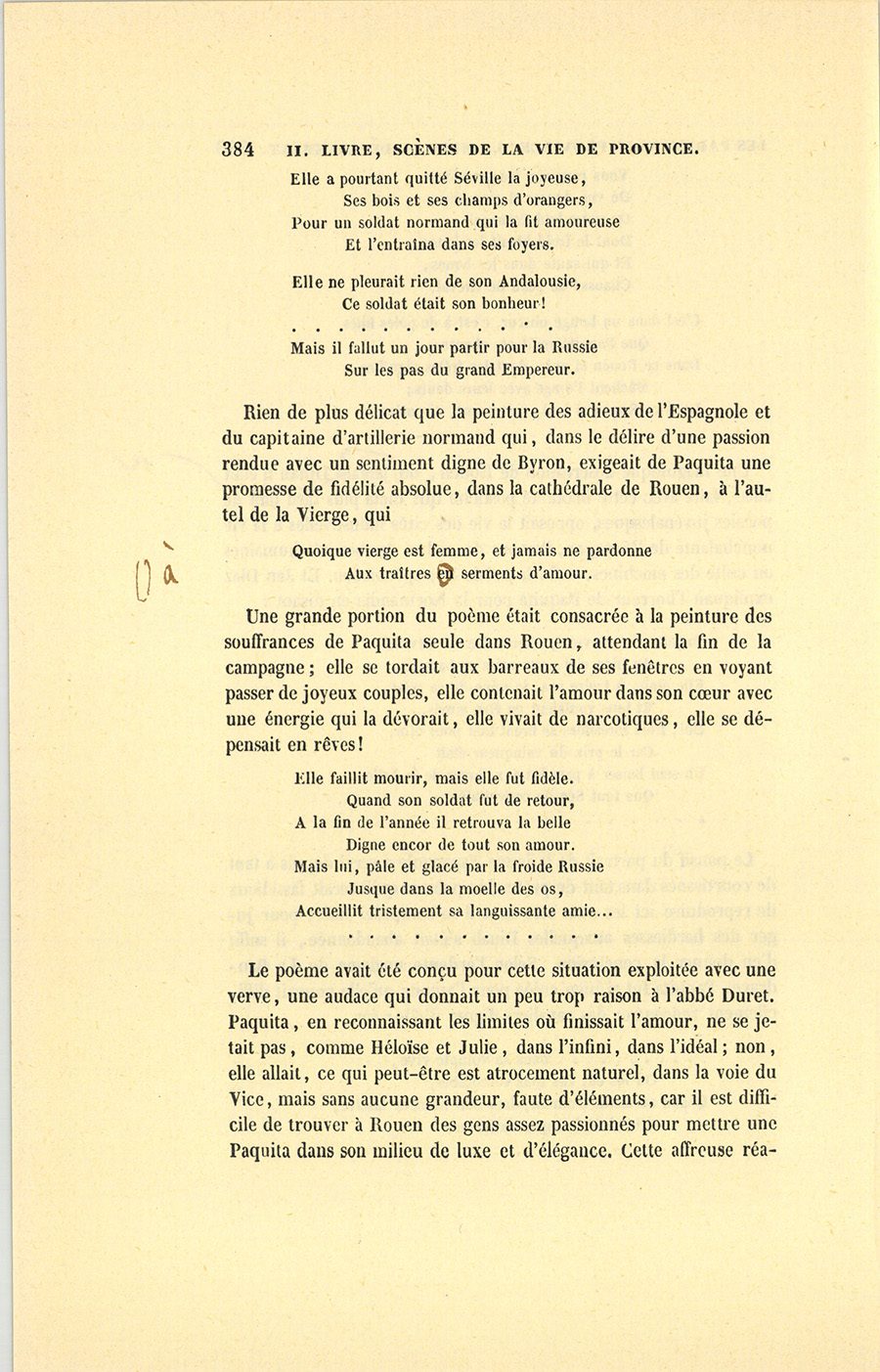 Le poème avait été conçu pour cette situation exploitée avec une verve, une audace qui donnait un peu trop raison à l’abbé Duret. Paquita, en reconnaissant les limites où finissait l’amour, ne se jetait pas, comme Héloïse et Julie, dans l’infini, dans l’idéal ; non, elle allait, ce qui peut-être est atrocement naturel, dans la voie du Vice, mais sans aucune grandeur, faute d’éléments, car il est difficile de trouver à Rouen des gens assez passionnés pour mettre une Paquita dans son milieu de luxe et d’élégance. Cette affreuse {p. 385} réalité, relevée par une sombre poésie, avait dicté quelques-unes de ces pages dont abuse la Poésie moderne, et un peu trop semblables à ce que les peintres appellent des écorchés. Par un retour empreint de philosophie, le poète, après avoir dépeint l’infâme maison où l’Andalouse achevait ses jours, revenait au chant du début :