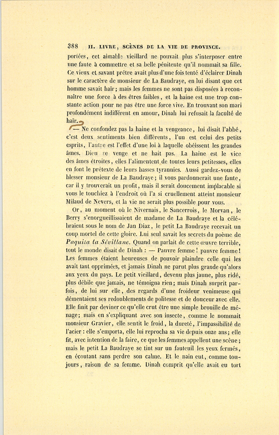 À cette époque, le bon vieil abbé Duret, le conseil de madame de La Baudraye, était mort ; autrement il l’eût11 empêchée de se livrer à la publicité. Mais trois ans de travail et d’incognito pesaient au cœur de Dinah, qui substitua le tapage de la gloire à toutes ses ambitions trompées. La poésie et les rêves de la célébrité, qui depuis son entrevue avec Anna Grossetête avaient endormi ses douleurs, ne suffisaient plus, après 1830, à l’activité de ce cœur malade. L’abbé Duret, qui parlait du monde quand la voix de la religion était impuissante, l’abbé Duret qui comprenait Dinah, qui lui peignait un bel avenir en lui disant que Dieu récompensait toutes les souffrances noblement {p. 388} supportées, cet aimable vieillard ne pouvait plus s’interposer entre une faute à commettre et sa belle pénitente qu’il nommait sa fille. Ce vieux et savant prêtre avait plus d’une fois tenté d’éclairer Dinah sur le caractère de monsieur de La Baudraye, en lui disant que cet homme savait haïr ; mais les femmes ne sont pas disposées à reconnaître une force à des êtres faibles, et la haine est une trop constante action pour ne pas être une force vive. En trouvant son mari profondément indifférent en amour, Dinah lui refusait la faculté de haïr. – Ne confondez pas la haine et la vengeance, lui disait l’abbé, c’est deux sentiments bien différents, l’un est celui des petits esprits, l’autre est l’effet d’une loi à laquelle obéissent les grandes âmes. Dieu se venge et ne hait pas. La haine est le vice des âmes étroites, elles l’alimentent de toutes leurs petitesses, elles en font le prétexte de leurs basses tyrannies. Aussi gardez-vous de blesser monsieur de La Baudraye ; il vous pardonnerait une faute, car il y trouverait un profit, mais il serait doucement implacable si vous le touchiez à l’endroit où l’a si cruellement atteint monsieur Milaud de Nevers, et la vie ne serait plus possible pour vous.