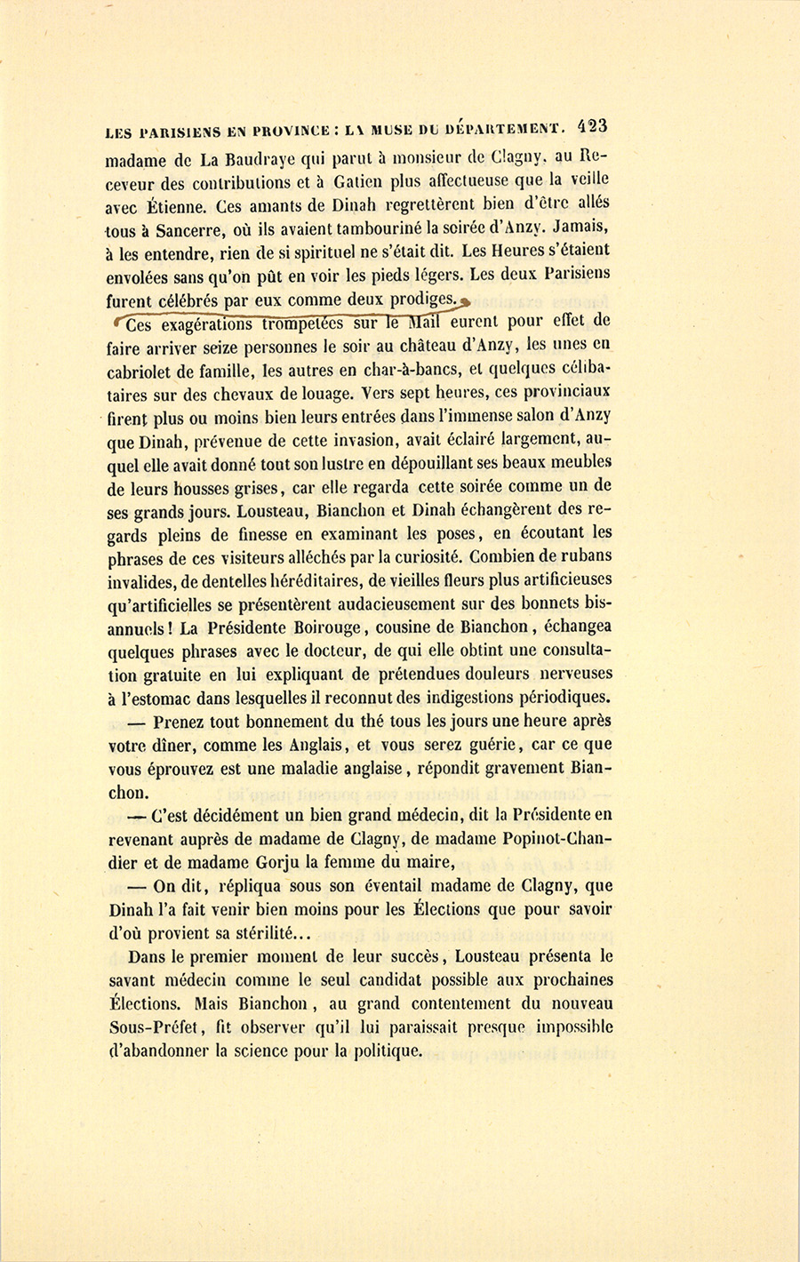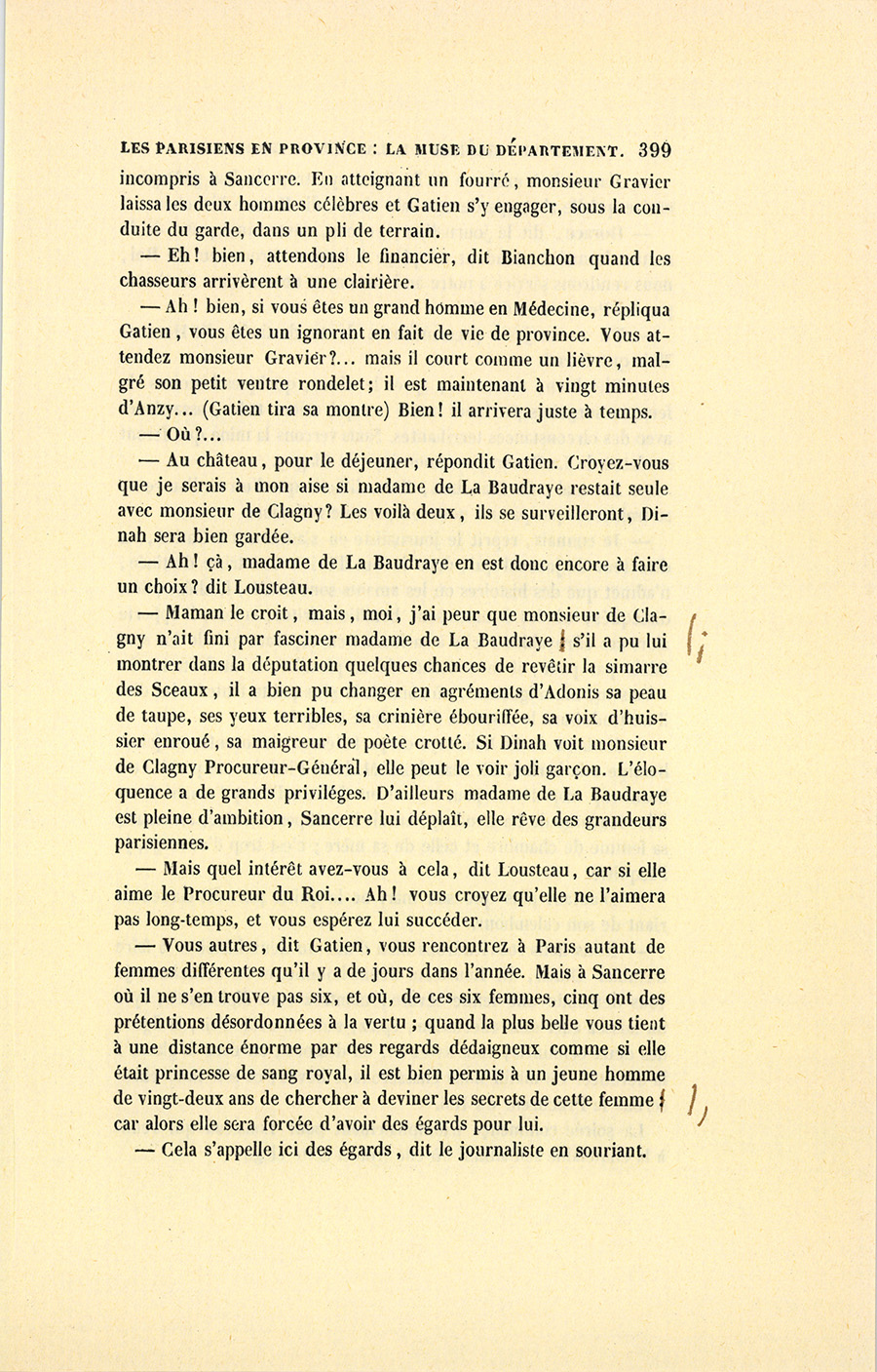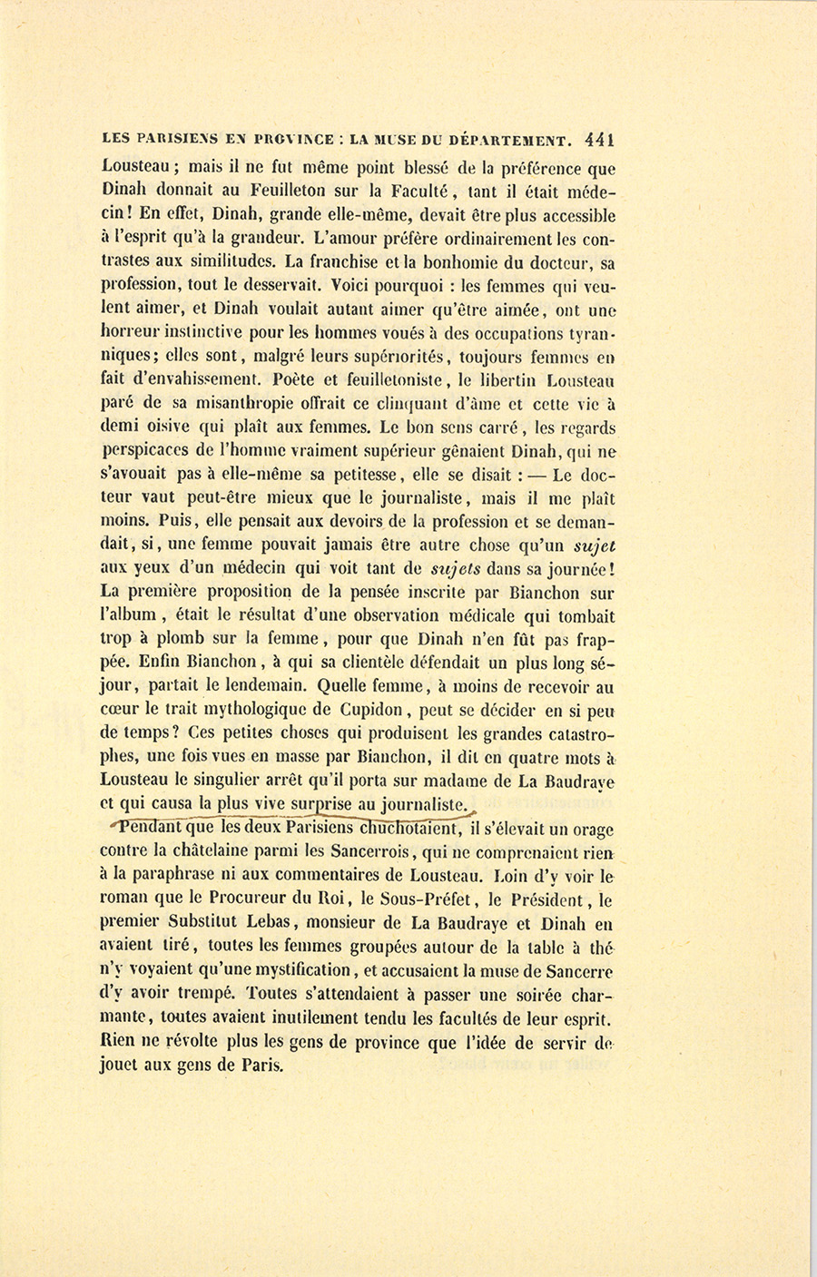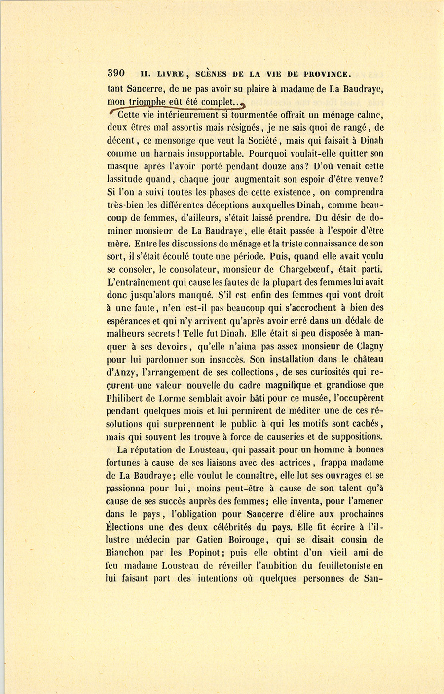 La réputation de Lousteau, qui passait pour un homme à bonnes fortunes à cause de ses liaisons avec des actrices, frappa madame de La Baudraye ; elle voulut le connaître, elle lut ses ouvrages et se passionna pour lui, moins peut-être à cause de son talent qu’à cause de ses succès auprès des femmes ; elle inventa, pour l’amener dans le pays, l’obligation pour Sancerre d’élire aux prochaines Élections une des deux célébrités du pays. Elle fit écrire à l’illustre médecin par Gatien Boirouge, qui se disait cousin de Bianchon par les Popinot ; puis elle obtint d’un vieil ami de feu madame Lousteau de réveiller l’ambition du feuilletoniste en lui faisant part des intentions où quelques personnes de {p. 391} Sancerre se trouvaient de choisir leur député parmi les gens célèbres de Paris. Fatiguée de son médiocre entourage, madame de La Baudraye allait enfin voir des hommes vraiment supérieurs, elle pourrait ennoblir sa faute de tout l’éclat de la gloire. Ni Lousteau ni Bianchon ne répondirent ; peut-être attendaient-ils les vacances. Bianchon, qui, l’année précédente, avait obtenu sa chaire après un brillant concours, ne pouvait quitter son enseignement.