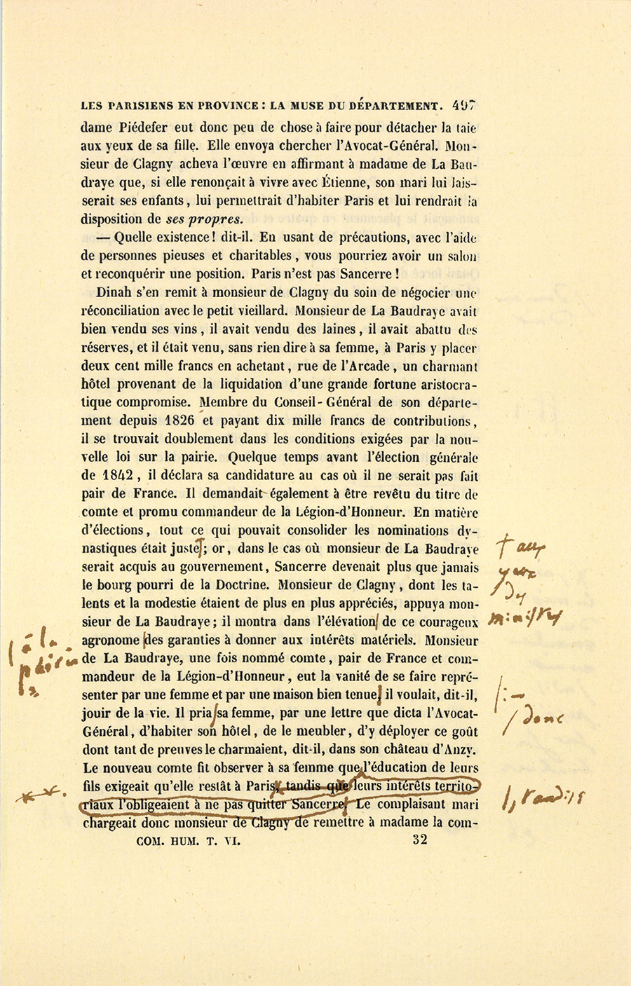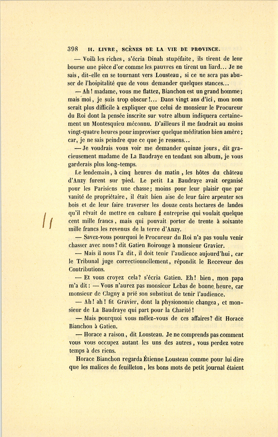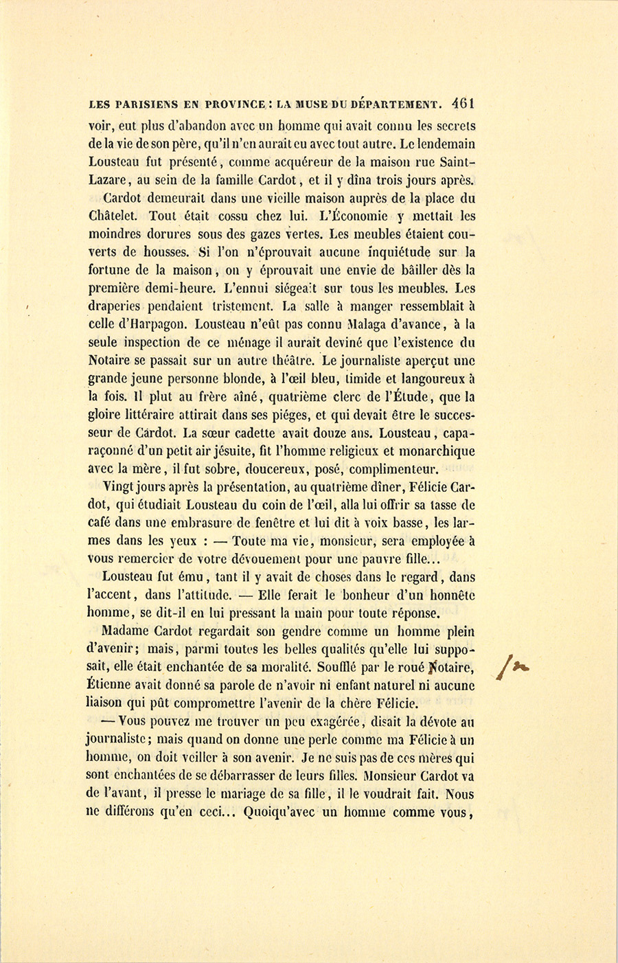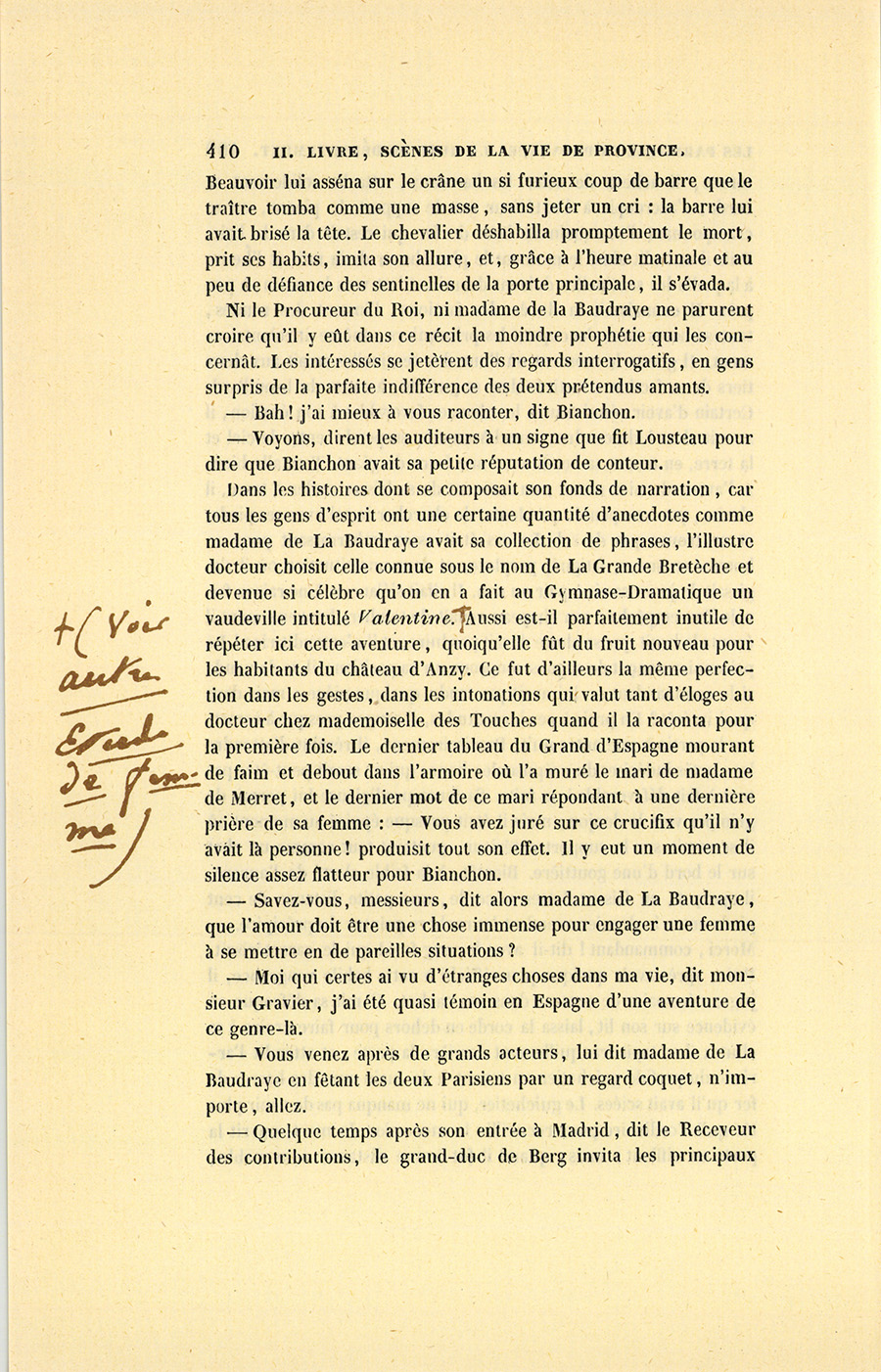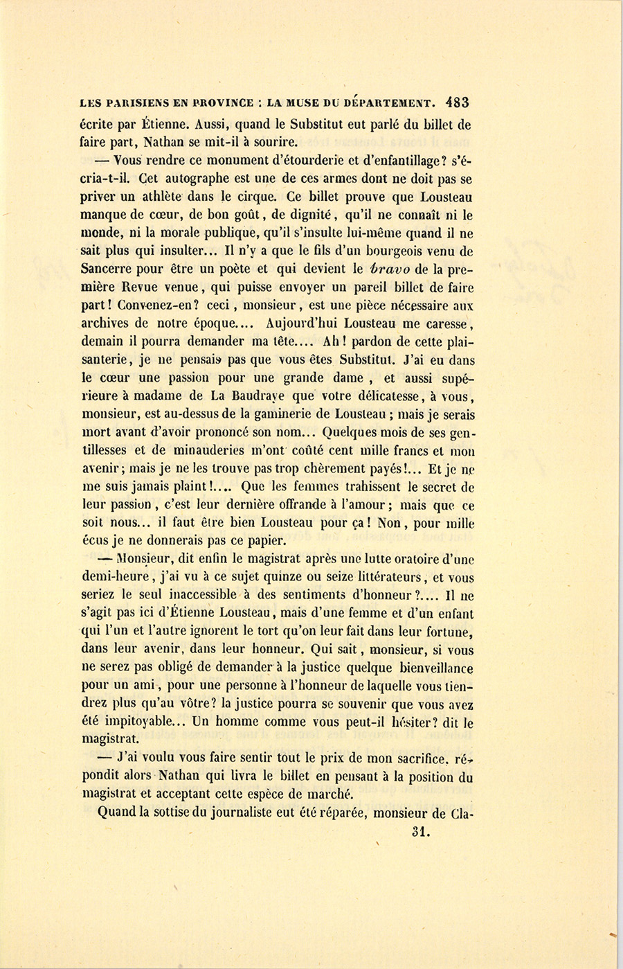 La réputation de Lousteau, qui passait pour un homme à bonnes fortunes à cause de ses liaisons avec des actrices, frappa madame de La Baudraye ; elle voulut le connaître, elle lut ses ouvrages et se passionna pour lui, moins peut-être à cause de son talent qu’à cause de ses succès auprès des femmes ; elle inventa, pour l’amener dans le pays, l’obligation pour Sancerre d’élire aux prochaines Élections une des deux célébrités du pays. Elle fit écrire à l’illustre médecin par Gatien Boirouge, qui se disait cousin de Bianchon par les Popinot ; puis elle obtint d’un vieil ami de feu madame Lousteau de réveiller l’ambition du feuilletoniste en lui faisant part des intentions où quelques personnes de {p. 391} Sancerre se trouvaient de choisir leur député parmi les gens célèbres de Paris. Fatiguée de son médiocre entourage, madame de La Baudraye allait enfin voir des hommes vraiment supérieurs, elle pourrait ennoblir sa faute de tout l’éclat de la gloire. Ni Lousteau ni Bianchon ne répondirent ; peut-être attendaient-ils les vacances. Bianchon, qui, l’année précédente, avait obtenu sa chaire après un brillant concours, ne pouvait quitter son enseignement.