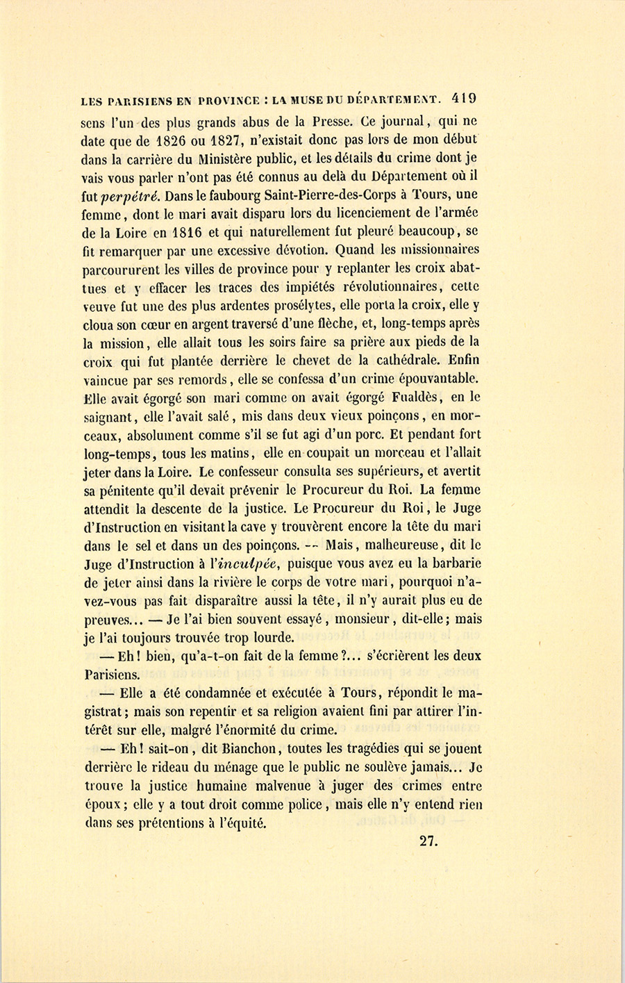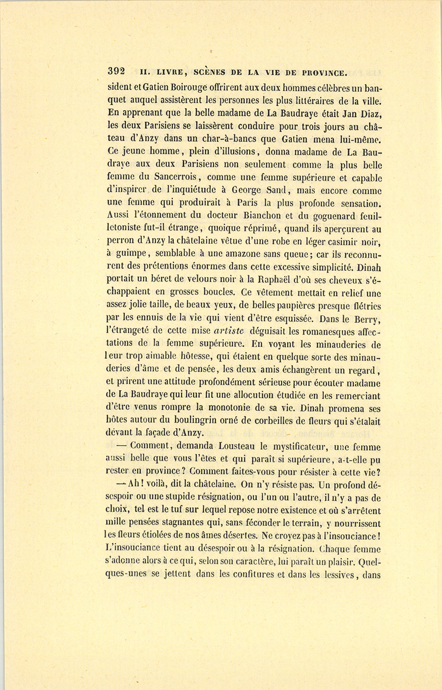 – Ah ! voilà, dit la châtelaine. On n’y résiste pas. Un profond désespoir ou une stupide résignation, ou l’un ou l’autre, il n’y a pas de choix, tel est le tuf sur lequel repose notre existence et où s’arrêtent mille pensées stagnantes qui, sans féconder le terrain, y nourrissent les fleurs étiolées de nos âmes désertes. Ne croyez pas à l’insouciance ! L’insouciance tient au désespoir ou à la résignation. Chaque femme s’adonne alors à ce qui, selon son caractère, lui paraît un plaisir. Quelques-unes se jettent dans les confitures et dans les lessives, dans {p. 393} l’économie domestique, dans les plaisirs ruraux de la vendange ou de la moisson, dans la conservation des fruits, dans la broderie des fichus, dans les soins de la maternité, dans les intrigues de petite ville. D’autres tracassent un piano inamovible qui sonne comme un chaudron au bout de la septième année, et qui finit ses jours, asthmatique, au château d’Anzy. Quelques dévotes s’entretiennent des différents crus de la parole de Dieu : l’on compare l’abbé Fritaud à l’abbé Guinard. On joue aux cartes le soir, on danse pendant douze années avec les mêmes personnes, dans les mêmes salons, aux mêmes époques. Cette belle vie est entremêlée de promenades solennelles sur le Mail, de visites d’étiquette entre femmes qui vous demandent où vous achetez vos étoffes. La conversation est bornée au sud de l’intelligence par les observations sur les intrigues cachées au fond de l’eau dormante de la vie de province, au nord par les mariages sur le tapis, à l’ouest par les jalousies, à l’est par les petits mots piquants. Aussi le voyez-vous ? dit-elle en se posant, une femme a des rides à vingt-neuf ans, dix ans avant le temps fixé par les ordonnances du docteur Bianchon, elle se couperose aussi très-promptement, et jaunit comme un coing quand elle doit jaunir, nous en connaissons qui verdissent. Quand nous en arrivons là, nous voulons justifier notre état normal. Nous attaquons alors de nos dents acérées comme des dents de mulot, les terribles passions de Paris. Nous avons ici des puritaines à contre-cœur qui déchirent les dentelles de la coquetterie et rongent la poésie de vos beautés parisiennes, qui entament le bonheur d’autrui en vantant leurs noix et leur lard rances, en exaltant leur trou de souris économe, les couleurs grises et les parfums monastiques de notre belle vie sancerroise.