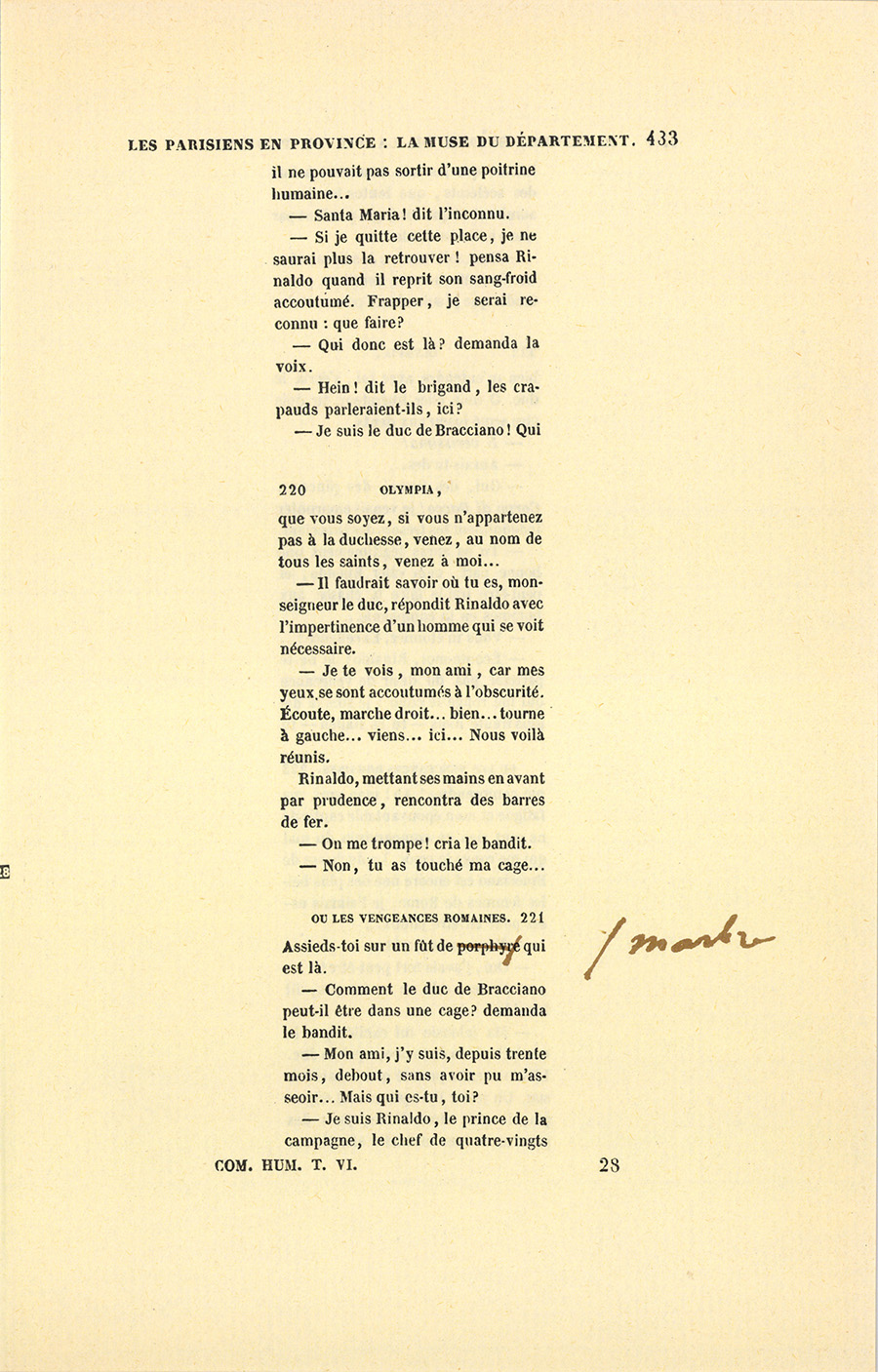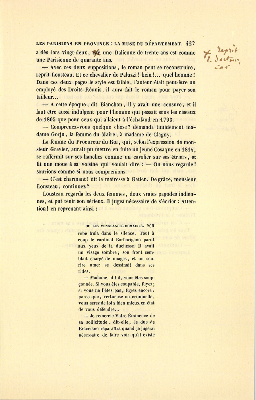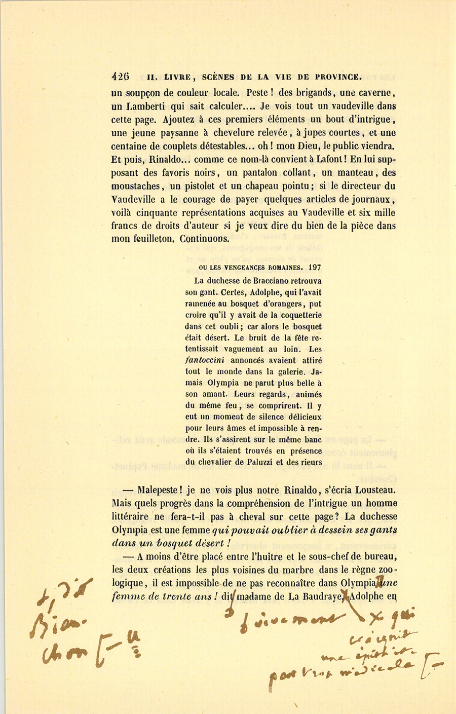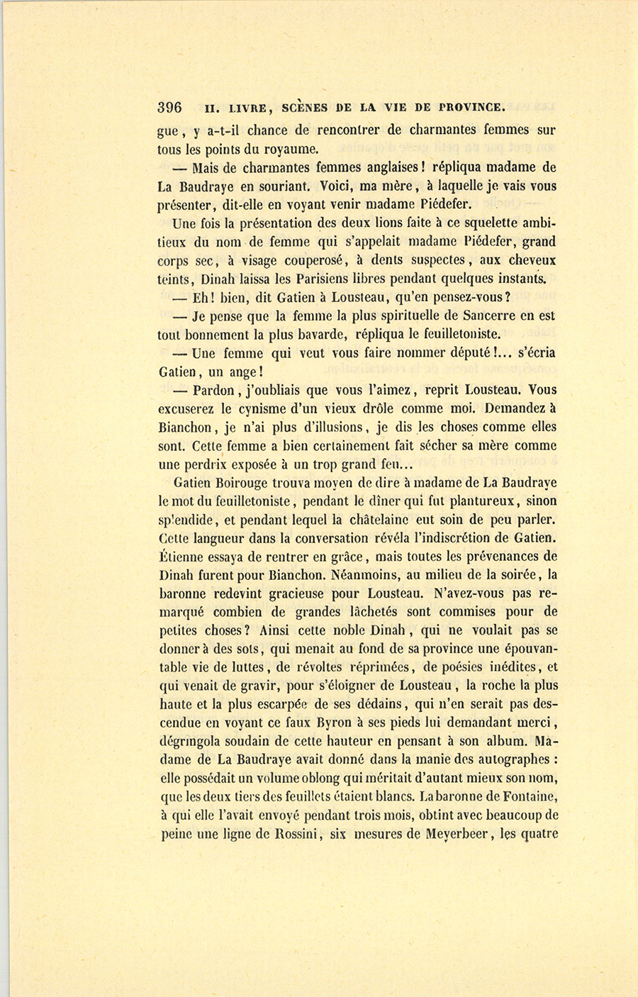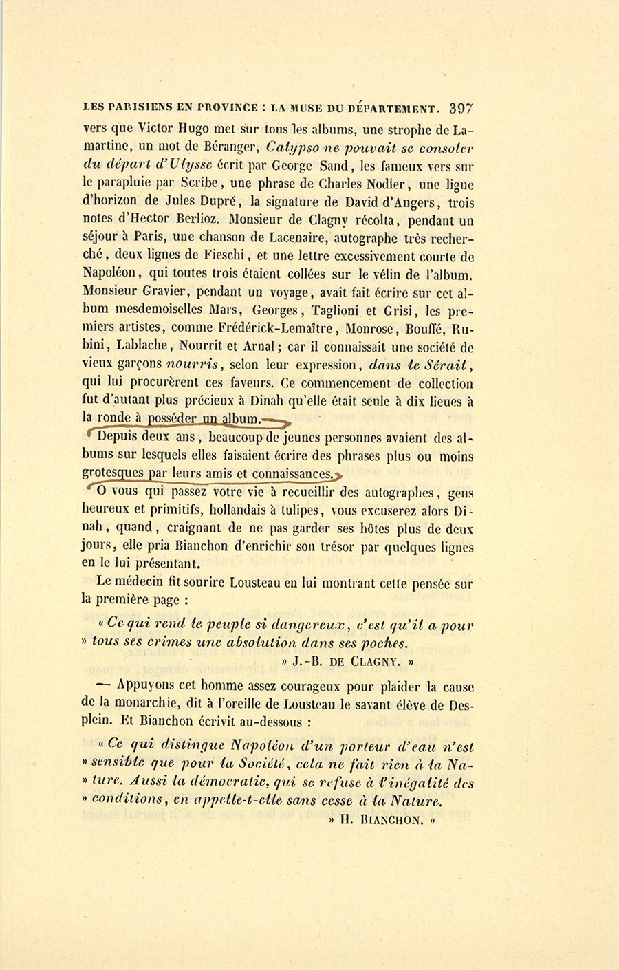 Gatien Boirouge trouva moyen de dire à madame de La Baudraye le mot du feuilletoniste, pendant le dîner qui fut plantureux, sinon splendide, et pendant lequel la châtelaine eut soin de peu parler. Cette langueur dans la conversation révéla l’indiscrétion de Gatien. Étienne essaya de rentrer en grâce, mais toutes les prévenances de Dinah furent pour Bianchon. Néanmoins, au milieu de la soirée, la baronne redevint gracieuse pour Lousteau. N’avez-vous pas remarqué combien de grandes lâchetés sont commises pour de petites choses ? Ainsi cette noble Dinah, qui ne voulait pas se donner à des sots, qui menait au fond de sa province une épouvantable vie de luttes, de révoltes réprimées, de poésies inédites, et qui venait de gravir, pour s’éloigner de Lousteau, la roche la plus haute et la plus escarpée de ses dédains, qui n’en serait pas descendue en voyant ce faux Byron à ses pieds lui demandant merci, dégringola soudain de cette hauteur en pensant à son album. Madame de La Baudraye avait donné dans la manie des autographes : elle possédait un volume oblong qui méritait d’autant mieux son nom, que les deux tiers des feuillets étaient blancs. La baronne de Fontaine, à qui elle l’avait envoyé pendant trois mois, obtint avec beaucoup de peine une ligne de Rossini, six mesures de Meyerbeer, les quatre {p. 397} vers que Victor Hugo met sur tous les albums, une strophe de Lamartine, un mot de Béranger, Calypso ne pouvait se consoler du départ d’Ulysse écrit par George Sand, les fameux vers sur le parapluie par Scribe, une phrase de Charles Nodier, une ligne d’horizon de Jules Dupré, la signature de David d’Angers, trois notes d’Hector Berlioz. Monsieur de Clagny récolta, pendant un séjour à Paris, une chanson de Lacenaire, autographe très recherché, deux lignes de Fieschi, et une lettre excessivement courte de Napoléon, qui toutes trois étaient collées sur le vélin de l’album. Monsieur Gravier, pendant un voyage, avait fait écrire sur cet album mesdemoiselles Mars, Georges, Taglioni et Grisi, les premiers artistes, comme Frédérick-Lemaître, Monrose, Bouffé, Rubini, Lablache, Nourrit et Arnal ; car il connaissait une société de vieux garçons nourris, selon leur expression, dans le Sérail, qui lui procurèrent ces faveurs. Ce commencement de collection fut d’autant plus précieux à Dinah qu’elle était seule à dix lieues à la ronde à posséder un album. Depuis deux ans, beaucoup de jeunes personnes avaient des albums sur lesquels elles faisaient écrire des phrases plus ou moins grotesques par leurs amis et connaissances. Ô vous qui passez votre vie à recueillir des autographes, gens heureux et primitifs, hollandais à tulipes, vous excuserez alors Dinah, quand, craignant de ne pas garder ses hôtes plus de deux jours, elle pria Bianchon d’enrichir son trésor par quelques lignes en le lui présentant.