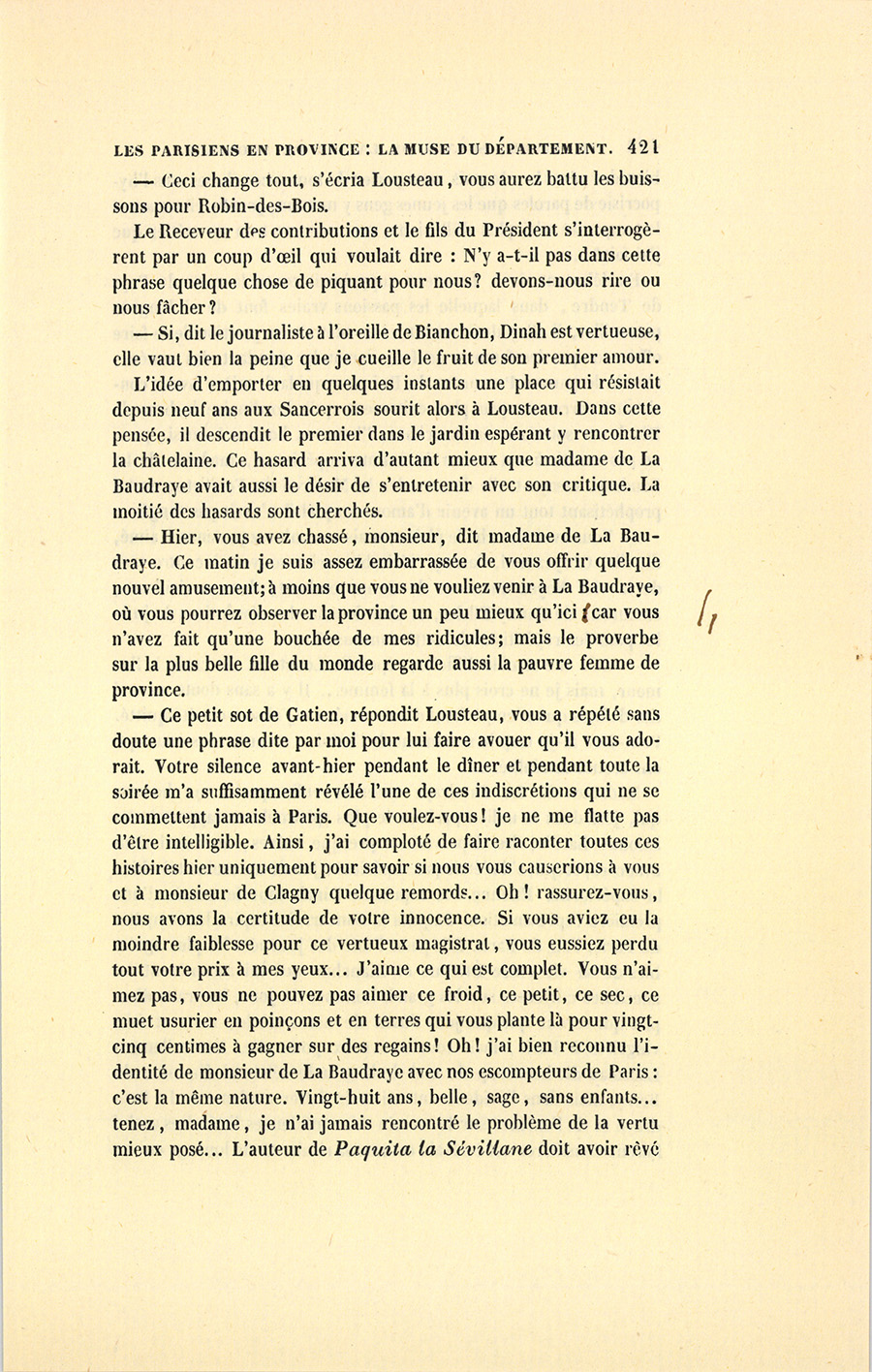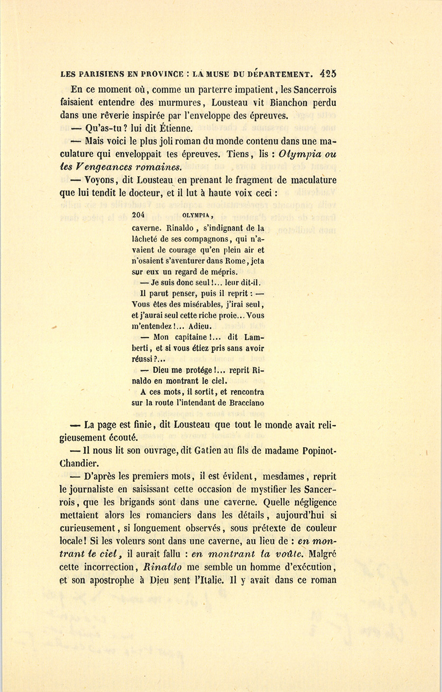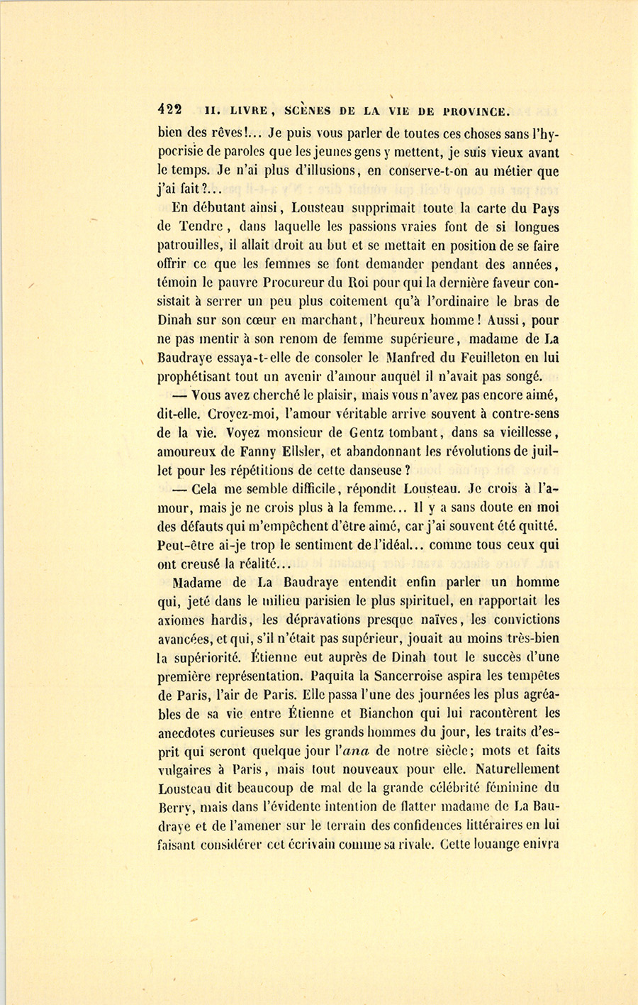 – Comment, demanda Lousteau le mystificateur, une femme aussi belle que vous l’êtes et qui paraît si supérieure, a-t-elle pu rester en province ? Comment faites-vous pour résister à cette vie ?