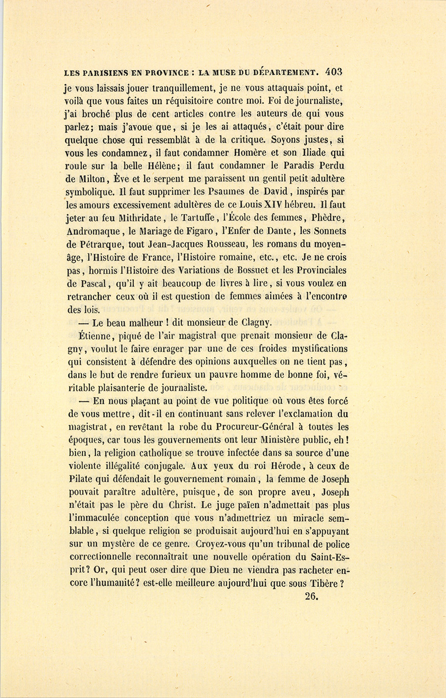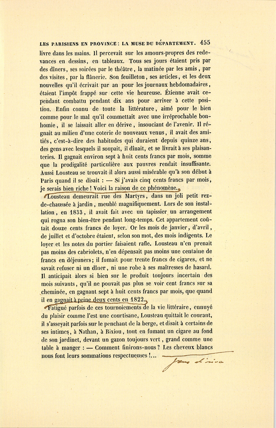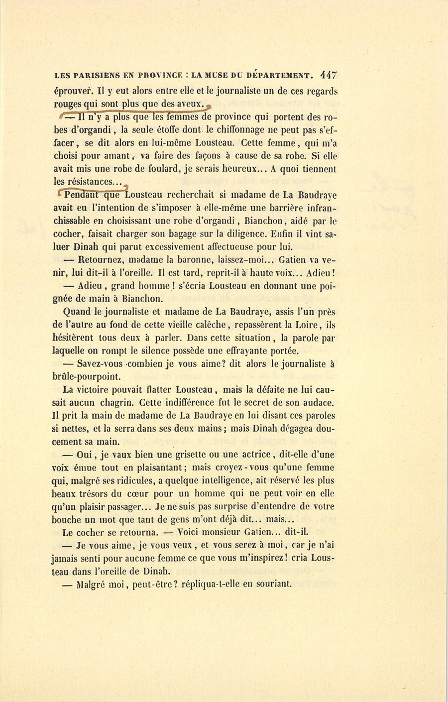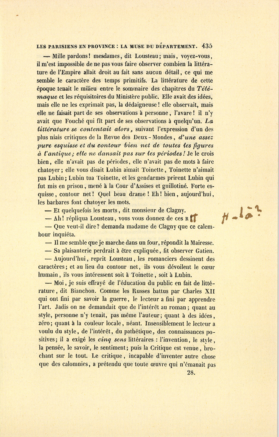 – Comment, demanda Lousteau le mystificateur, une femme aussi belle que vous l’êtes et qui paraît si supérieure, a-t-elle pu rester en province ? Comment faites-vous pour résister à cette vie ?