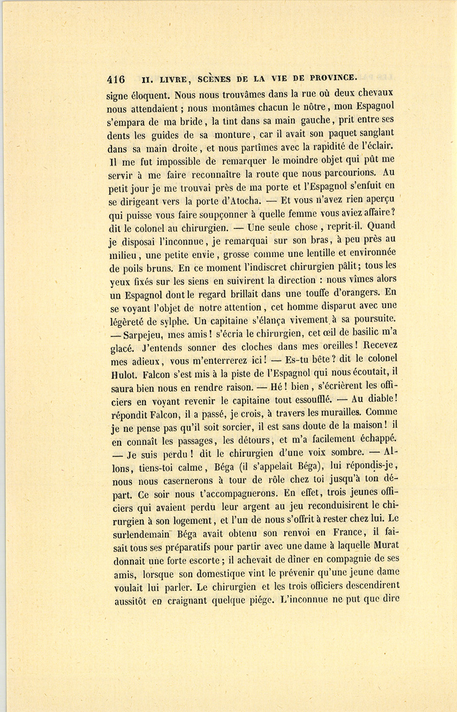 – Oh ! mon Dieu, reprit Dinah, une femme vous a parlé trois fois pendant un hiver, elle vous a serré dans son cœur à son insu ; vient une partie de campagne, une promenade, tout est dit, ou, si vous voulez, tout est fait. Cette conduite, bizarre pour ceux qui n’observent pas, a quelque chose de très-naturel. Au lieu de calomnier la femme de province en la croyant dépravée, un poète, comme vous, ou un philosophe, un observateur comme le docteur Bianchon sauraient deviner les merveilleuses poésies inédites, enfin toutes les pages de ce beau roman dont le dénoûment profite à quelque heureux sous-lieutenant, à quelque grand homme de province.