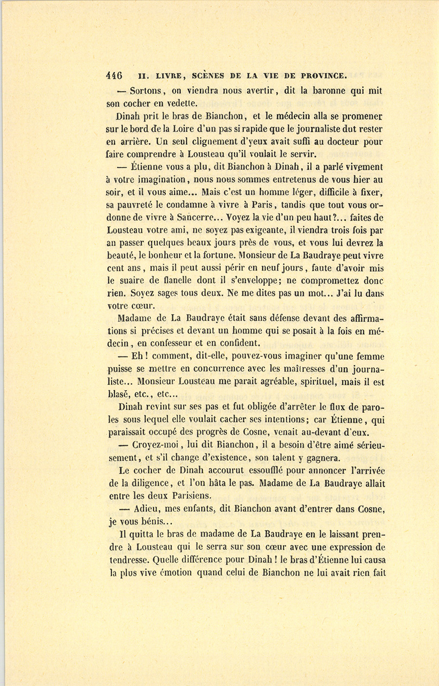 Dix jours après cette conférence, l’hôtel de La Baudraye était fermé. La comtesse et ses enfants, sa mère, enfin toute sa maison, qu’elle avait augmentée d’un précepteur, était partie pour le Sancerrois où Dinah voulait passer la belle saison. Elle fut charmante, dit-on, pour le comte. Ainsi, la muse de Sancerre revenait tout bonnement à la Famille et au Mariage ; mais, selon quelques médisants, elle était forcée d’y revenir, car les désirs du petit pair de France seraient sans doute accomplis, il attendait une fille !…