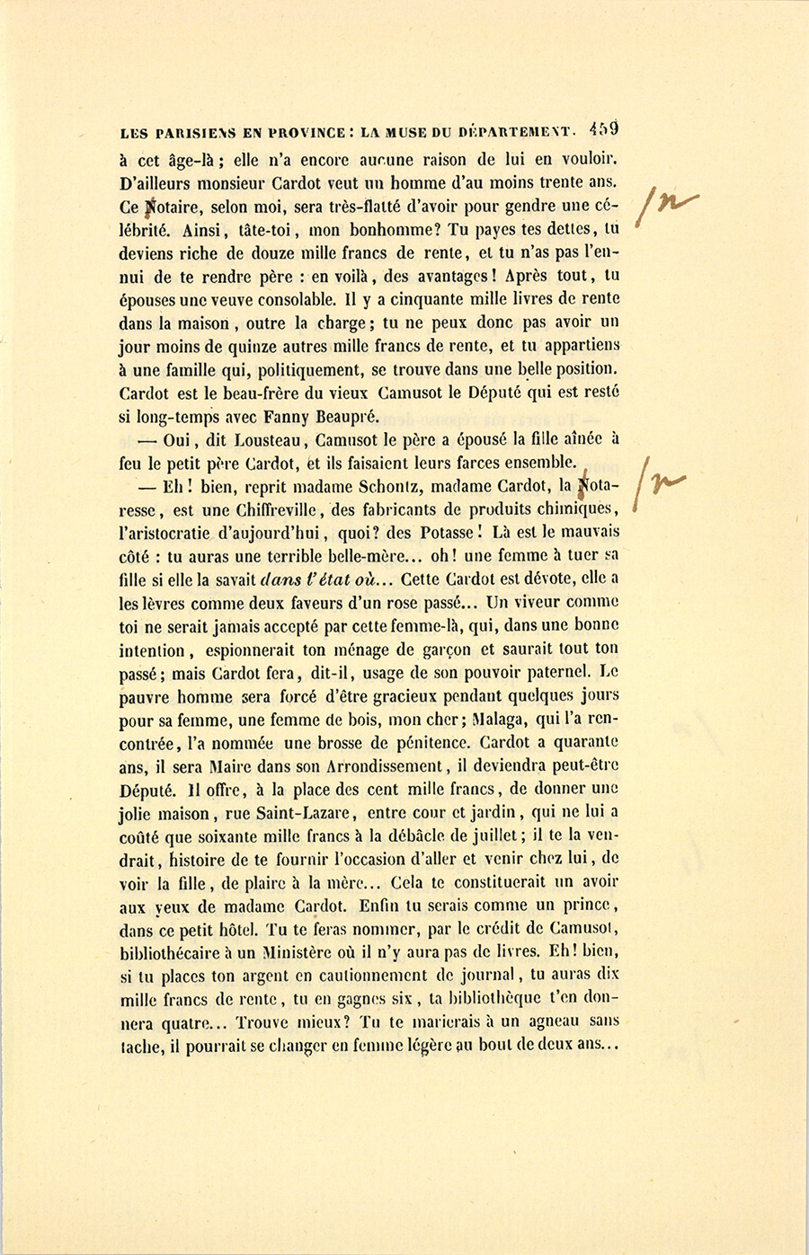 {p. 394} Madame de La Baudraye eut la rouerie, assez innocente d’ailleurs, de signaler à ces deux Parisiens entre lesquels elle voulait choisir un vainqueur, le piége où il se prendrait, en pensant qu’au moment où il ne le verrait plus, elle serait la plus forte.