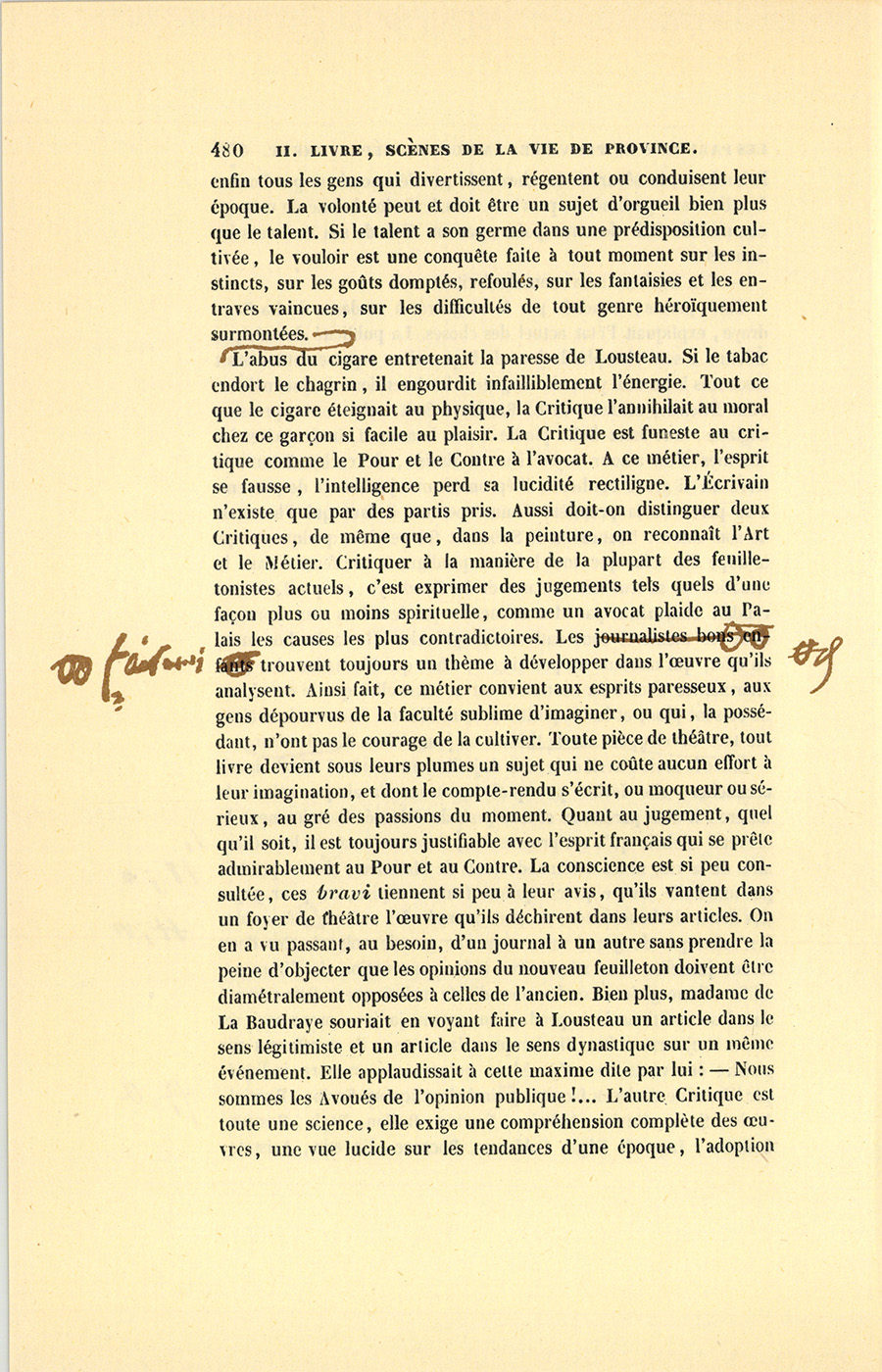 En 1836, Lousteau, fatigué par seize années de luttes à Paris, usé tout autant par le plaisir que par la misère, par les travaux et les mécomptes, paraissait avoir quarante-huit ans, quoiqu’il n’en eût que trente-sept. Déjà chauve, il avait pris un air byronien en harmonie avec ses ruines anticipées, avec les ravins tracés sur sa figure par l’abus du vin de Champagne. Il mettait les stigmates de la débauche sur le compte de la vie littéraire en accusant la Presse d’être meurtrière, il faisait entendre qu’elle dévorait de grands talents afin de donner du prix à sa lassitude. Il crut nécessaire d’outrer dans sa patrie et son faux dédain de la vie et sa misanthropie postiche. Néanmoins, parfois ses yeux jetaient encore des flammes comme ces volcans qu’on croit éteints ; et il essaya de remplacer par l’élégance de la mise tout ce qui pouvait lui manquer de jeunesse aux yeux d’une femme.