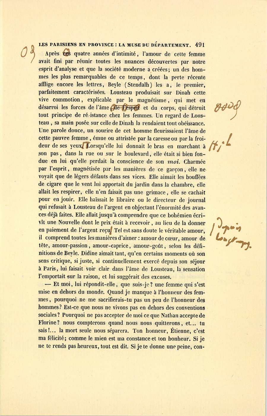 {p. 491} Après quatre années d’intimité, l’amour de cette femme avait fini par réunir toutes les nuances découvertes par notre esprit d’analyse et que la société moderne a créées ; un des hommes les plus remarquables de ce temps, dont la perte récente afflige encore les lettres, Beyle (Stendalh) les a, le premier, parfaitement caractérisées. Lousteau produisait sur Dinah cette vive commotion, explicable par le magnétisme, qui met en désarroi les forces de l’âme et du corps, qui détruit tout principe de résistance chez les femmes. Un regard de Lousteau, sa main posée sur celle de Dinah la rendaient tout obéissance. Une parole douce, un sourire de cet homme fleurissaient l’âme de cette pauvre femme, émue ou attristée par la caresse ou par la froideur de ses yeux ; lorsqu’elle lui donnait le bras en marchant à son pas, dans la rue ou sur le boulevard, elle était si bien fondue en lui qu’elle perdait la conscience de son moi. Charmée par l’esprit, magnétisée par les manières de ce garçon, elle ne voyait que de légers défauts dans ses vices. Elle aimait les bouffées de cigare que le vent lui apportait du jardin dans la chambre, elle allait les respirer, elle n’en faisait pas une grimace, elle se cachait pour en jouir. Elle haïssait le libraire ou le directeur de journal qui refusait à Lousteau de l’argent en objectant l’énormité des avances déjà faites. Elle allait jusqu’à comprendre que ce bohémien écrivît une Nouvelle dont le prix était à recevoir, au lieu de la donner en paiement de l’argent reçu depuis longtemps. Tel est sans doute le véritable amour, il comprend toutes les manières d’aimer : amour de cœur, amour de tête, amour-passion, amour-caprice, amour-goût, selon les définitions de Beyle. Didine aimait tant, qu’en certains moments où son sens critique, si juste, si continuellement exercé depuis son séjour à Paris, lui faisait voir clair dans l’âme de Lousteau, la sensation l’emportait sur la raison, et lui suggérait des excuses.