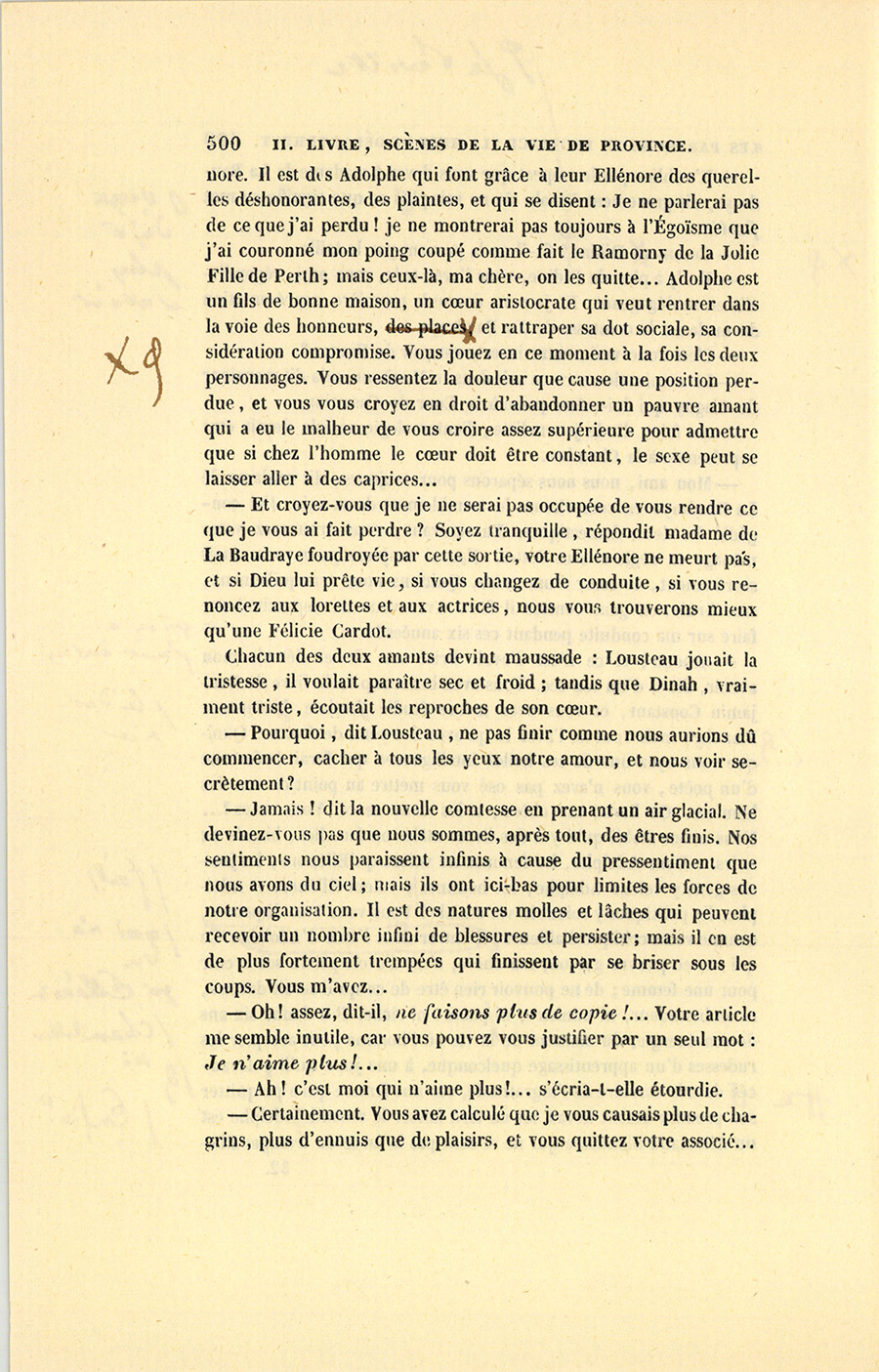 Ce ton, l’accent, le regard indifférent, tout frappa si durement cette femme qui vivait uniquement par son amour, qu’elle laissa couler de ses yeux le long de ses joues deux grosses larmes sans {p. 490} répondre, et Lousteau ne s’en aperçut qu’au moment où elle prit son mouchoir pour essuyer ces deux perles de douleur.