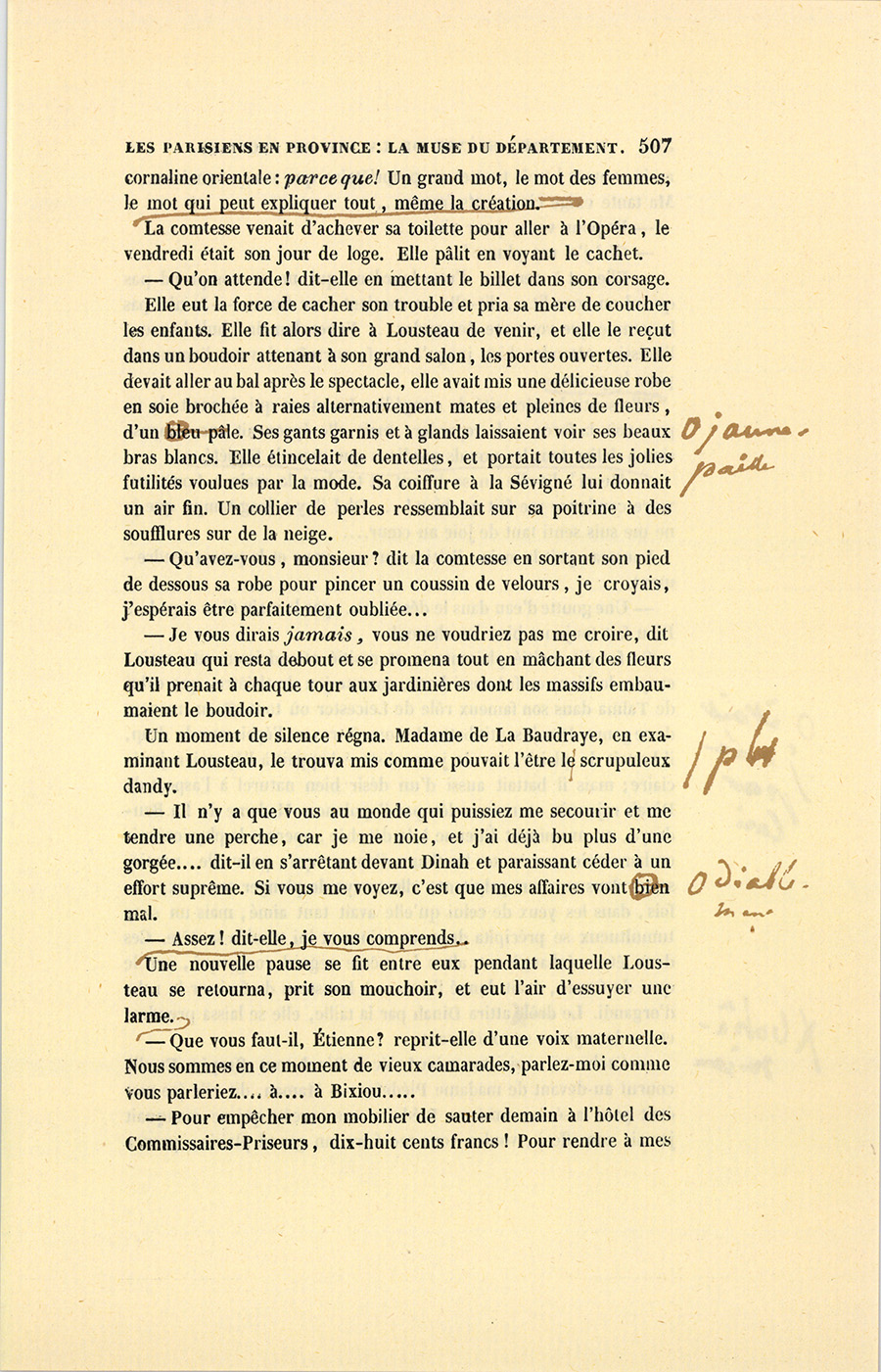 Elle eut la force de cacher son trouble et pria sa mère de coucher les enfants. Elle fit alors dire à Lousteau de venir, et elle le reçut dans un boudoir attenant à son grand salon, les portes ouvertes. Elle devait aller au bal après le spectacle, elle avait mis une délicieuse robe en soie brochée à raies alternativement mates et pleines de fleurs, d’un jaune-paille. Ses gants garnis et à glands laissaient voir ses beaux bras blancs. Elle étincelait de dentelles, et portait toutes les jolies futilités voulues par la mode. Sa coiffure à la Sévigné lui donnait un air fin. Un collier de perles ressemblait sur sa poitrine à des soufflures sur de la neige.
