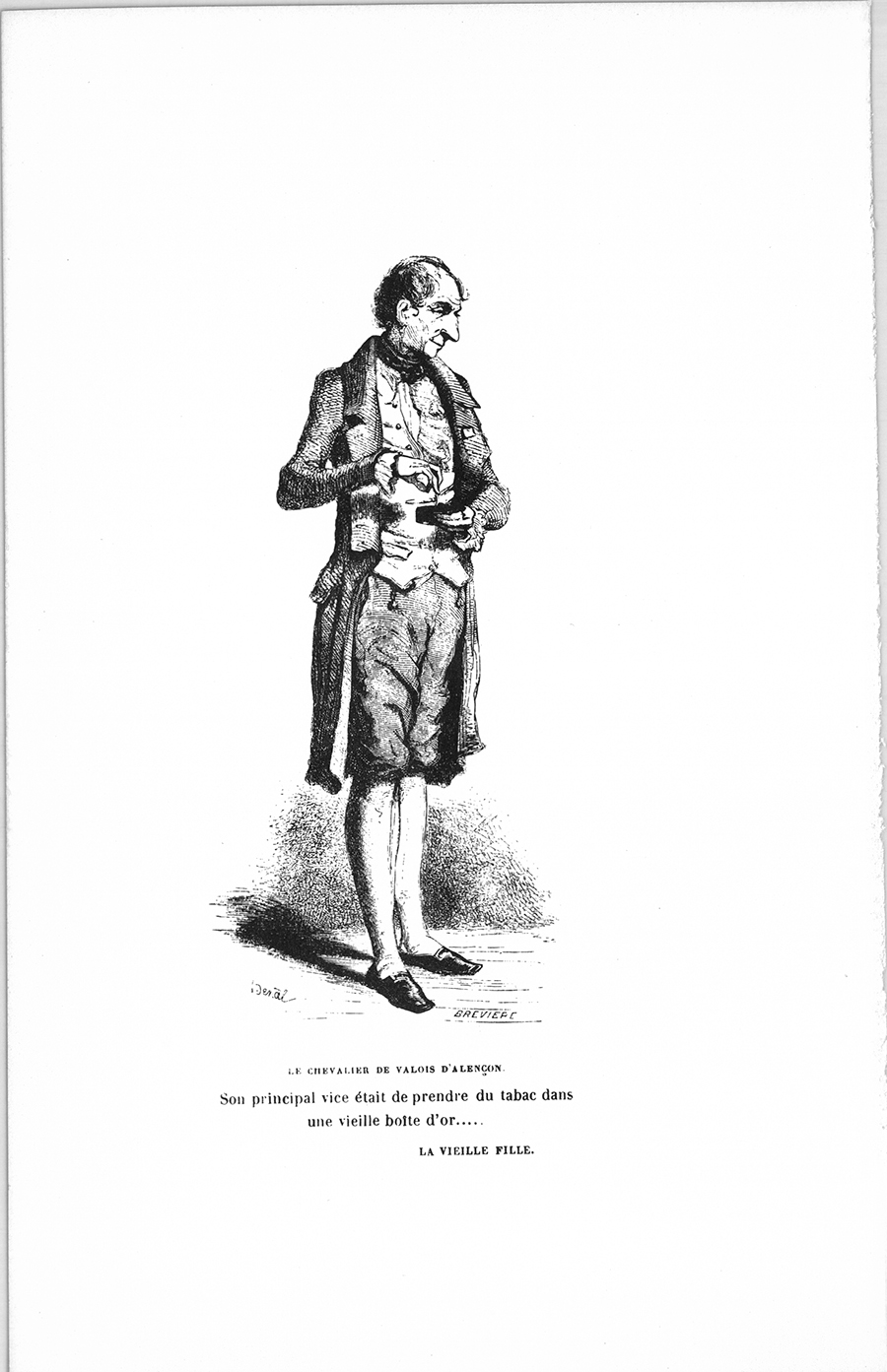 {p. 2} Chacun de ces chevaliers, si les renseignements sont exacts, fut, comme celui d’Alençon, un vieux gentilhomme, long, sec et sans fortune. Celui de Bourges avait émigré, celui de Touraine s’était caché, celui d’Alençon avait guerroyé dans la Vendée et quelque peu chouanné. La majeure partie de la jeunesse de ce dernier s’était passée à Paris, où la Révolution le surprit à trente ans au milieu de ses conquêtes. Accepté par la haute aristocratie de la province pour un vrai Valois, le chevalier de Valois d’Alençon avait, comme ses homonymes, d’excellentes manières et paraissait homme de haute compagnie. Quant à ses mœurs publiques, il avait l’habitude de ne jamais dîner chez lui ; il jouait tous les soirs, et s’était fait prendre pour un homme très-spirituel. Son principal défaut consistait à raconter une foule d’anecdotes sur le règne de Louis XV et sur les commencements de la Révolution ; et les personnes qui les entendaient la première fois les trouvaient assez bien narrées. S’il avait la vertu de ne pas répéter ses bons mots personnels et de ne jamais parler de ses amours, ses grâces et ses sourires commettaient de délicieuses indiscrétions. Ce bonhomme usait du privilége qu’ont les vieux gentilshommes voltairiens de ne point aller à la messe ; mais chacun avait une excessive indulgence pour son irréligion, en faveur de son dévouement à la cause royale. Son principal vice était de prendre du tabac dans une vieille boîte d’or ornée du portrait d’une princesse Goritza, charmante Hongroise, célèbre par sa beauté sous la fin du règne de Louis XV, [ill.] à laquelle le jeune chevalier avait été long-temps attaché, dont il ne parlait jamais sans émotion, et pour laquelle il s’était battu. Ce chevalier, alors âgé d’environ cinquante-huit ans, n’en avouait que cinquante, et pouvait se permettre cette innocente tromperie ; car, parmi les avantages dévolus aux gens secs et blonds, il conservait cette taille encore juvénile qui sauve aux hommes aussi bien qu’aux femmes les apparences de la vieillesse. Oui, sachez-le, toute la vie, ou toute l’élégance qui est l’expression de la vie, réside dans la taille. Mais comme il s’agit des vertus du chevalier, il faut dire qu’il était doué d’un nez prodigieux. Ce nez partageait vigoureusement sa figure pâle en deux sections qui semblaient ne pas se connaître, et dont une seule rougissait pendant le travail de la digestion. Ce fait est digne de remarque par un temps où la physiologie s’occupe tant du cœur humain. Cette incandescence se plaçait à gauche. Quoique les jambes hautes et fines, le corps grêle et {p. 3} le teint blafard du chevalier n’annonçassent pas une forte santé, néanmoins il mangeait comme un ogre, et prétendait avoir une maladie désignée en province sous le nom de foie chaud, sans doute pour faire excuser son excessif appétit. La circonstance de sa rougeur appuyait ses prétentions ; mais dans un pays où les repas se développent sur des lignes de trente ou quarante plats et durent quatre heures, l’estomac du chevalier semblait être un bienfait accordé par la Providence à cette bonne ville. Selon quelques médecins, cette chaleur placée à gauche dénote un cœur prodigue. La vie galante du chevalier confirmait ces assertions scientifiques, dont la responsabilité ne pèse pas, fort heureusement, sur l’historien. Malgré ces symptômes, monsieur de Valois avait une organisation nerveuse, conséquemment vivace. Si son foie ardait, pour employer une vieille expression, son cœur ne brûlait pas moins. Si son visage offrait quelques rides, si ses cheveux étaient argentés, un observateur instruit y aurait vu les stigmates de la passion et les sillons du plaisir, car aux tempes la patte d’oie caractéristique, et au front les marches du palais montraient des rides élégantes, bien prisées à la cour de Cythère. En lui tout révélait les mœurs de l’homme à femmes (ladie’s man). Le coquet chevalier était si minutieux dans ses ablutions que ses joues faisaient plaisir à voir, elles semblaient brossées avec une eau merveilleuse. La partie du crâne que ses cheveux se refusaient à couvrir brillait comme de l’ivoire. Ses sourcils comme ses cheveux jouaient la jeunesse par la régularité que leur imprimait le peigne. Sa peau déjà si blanche semblait encore extrablanchie par quelque secret. Sans porter d’odeur, le chevalier exhalait comme un parfum de jeunesse qui rafraîchissait son aire. Ses mains de gentilhomme, soignées comme celles d’une petite maîtresse, attiraient le regard sur des ongles roses et bien coupés. Enfin, sans son nez magistral et superlatif, il eût été poupin. Il faut se résoudre à gâter ce portrait par l’aveu d’une petitesse. Le chevalier mettait du coton dans ses oreilles et y gardait encore deux petites boucles représentant des têtes de nègre en diamants, admirablement faites d’ailleurs ; mais il y tenait assez pour justifier ce singulier appendice en disant que depuis le percement de ses oreilles ses migraines l’avaient quitté. Nous ne donnons pas le chevalier pour un homme accompli ; mais ne faut-il point pardonner aux vieux célibataires, dont le cœur envoie tant de sang à la figure, d’adorables ridicules, fondés peut-être sur de sublimes secrets ? {p. 4} D’ailleurs, le chevalier de Valois rachetait ses têtes de nègre par tant d’autres grâces que la société devait se trouver suffisamment indemnisée. Il prenait vraiment beaucoup de peine pour cacher ses années et pour plaire à ses connaissances. Il faut signaler en première ligne le soin extrême qu’il apportait à son linge, la seule distinction que puissent avoir aujourd’hui dans le costume les gens comme il faut ; celui du chevalier était toujours d’une finesse et d’une blancheur aristocratiques. Quant à son habit, quoiqu’il fût d’une propreté remarquable, il 