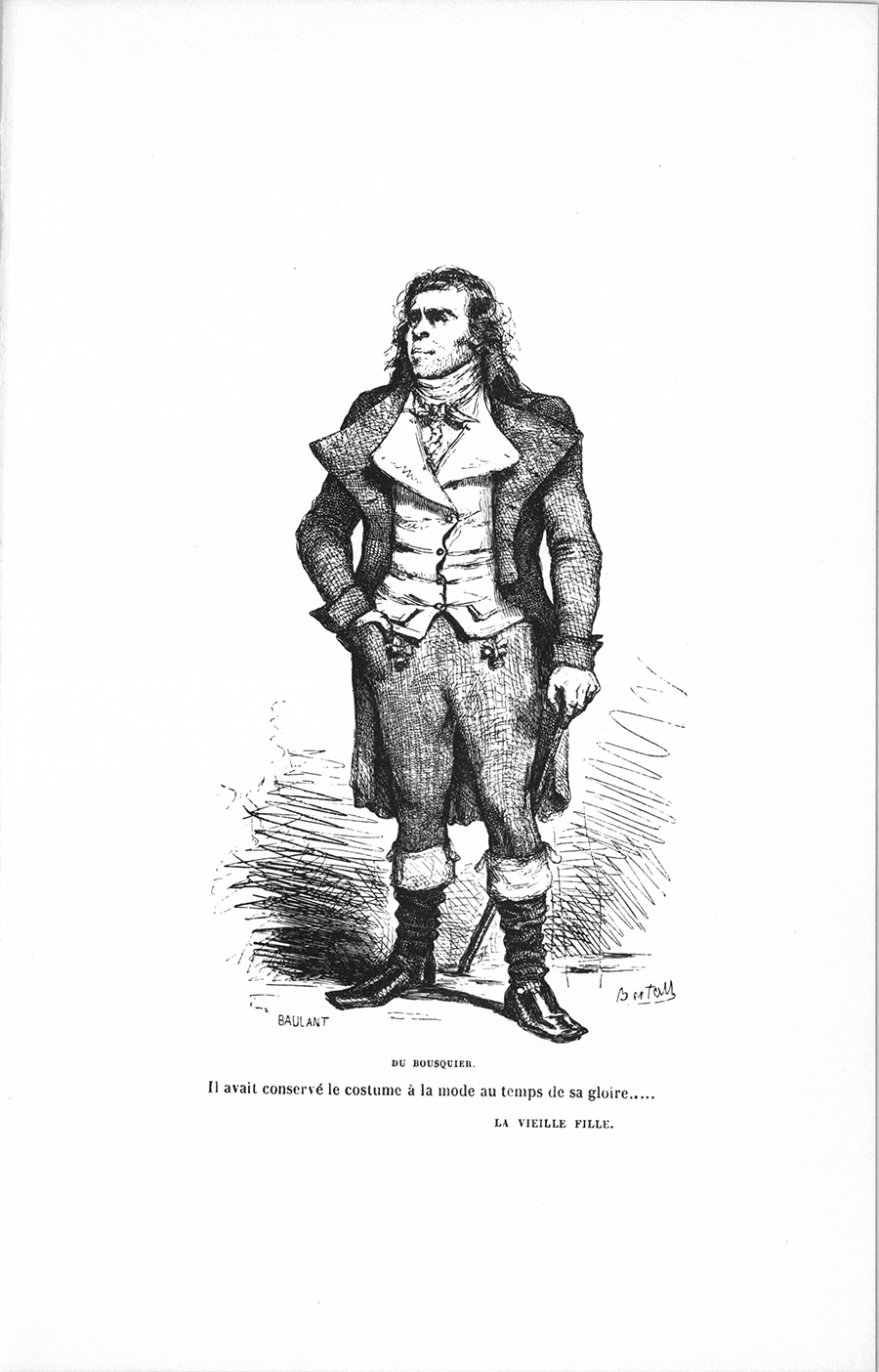 Du Bousquier avait conservé le costume à la mode au temps de sa gloire : les bottes à revers, les bas de soie blancs, la culotte courte en drap côtelé de couleur cannelle, le gilet à la Roberspierre et l’habit bleu. [ill.] Malgré les titres que la haine du premier Consul lui donnait auprès des sommités royalistes de la province, monsieur du Bousquier ne fut point reçu dans les sept ou huit familles qui composaient le faubourg Saint-Germain d’Alençon, et où allait le chevalier de Valois. Il avait tenté tout d’abord d’épouser mademoiselle Armande de Gordes, fille noble sans fortune, mais de qui du Bousquier comptait tirer un grand parti pour ses projets ultérieurs, car il rêvait une brillante revanche. Il essuya un refus. Il se consola par les dédommagements que lui offrirent une dizaine de familles riches qui avaient autrefois fabriqué le point d’Alençon, qui possédaient des herbages ou des bœufs, qui faisaient en gros le commerce des toiles, et où le hasard pouvait lui livrer un bon parti. Le vieux garçon avait en effet concentré ses espérances dans la perspective d’un heureux mariage, que ses diverses capacités semblaient d’ailleurs lui promettre ; car il ne manquait pas d’une certaine habileté financière que beaucoup de personnes mettaient à profit. Semblable au joueur ruiné qui dirige les néophytes, il indiquait les spéculations, il en déduisait bien les moyens, les chances et la conduite. Il passait pour être un bon administrateur, il fut souvent question de le nommer maire d’Alençon ; mais le souvenir de ses tripotages dans les gouvernements républicains lui nuisirent, il ne fut jamais reçu à la Préfecture. Tous les gouvernements qui se succédèrent, même celui des Cent-Jours, se refusèrent à le nommer maire d’Alençon, place qu’il ambitionnait, et qui, s’il l’avait obtenue, aurait fait conclure son mariage avec une vieille fille sur laquelle il avait fini par porter ses vues. Son aversion du gouvernement impérial l’avait d’abord jeté dans le parti royaliste où il resta malgré les injures qu’il y recevait ; mais quand, à la première rentrée des Bourbons, l’exclusion fut maintenue à la Préfecture contre lui, ce dernier refus lui inspira contre les Bourbons une haine aussi profonde que secrète, car il demeura patemment fidèle à ses opinions. Il devint le chef du parti libéral d’Alençon, le directeur invisible des élections, et fit un mal prodigieux à la Restauration {p. 19} par l’habileté de ses manœuvres sourdes et par la perfidie de ses menées. Du Bousquier, comme tous ceux qui ne peuvent plus vivre que par la tête, portait dans ses sentiments haineux la tranquillité d’un ruisseau faible en apparence, mais intarissable ; sa haine était comme celle du nègre, si paisible, si patiente, qu’elle trompait l’ennemi. Sa vengeance, couvée pendant quinze années, ne fut rassasiée par aucune victoire, pas même par le triomphe des journées de juillet 1830.