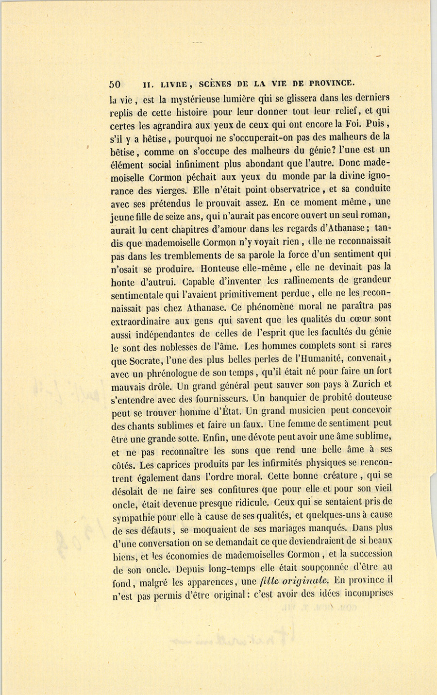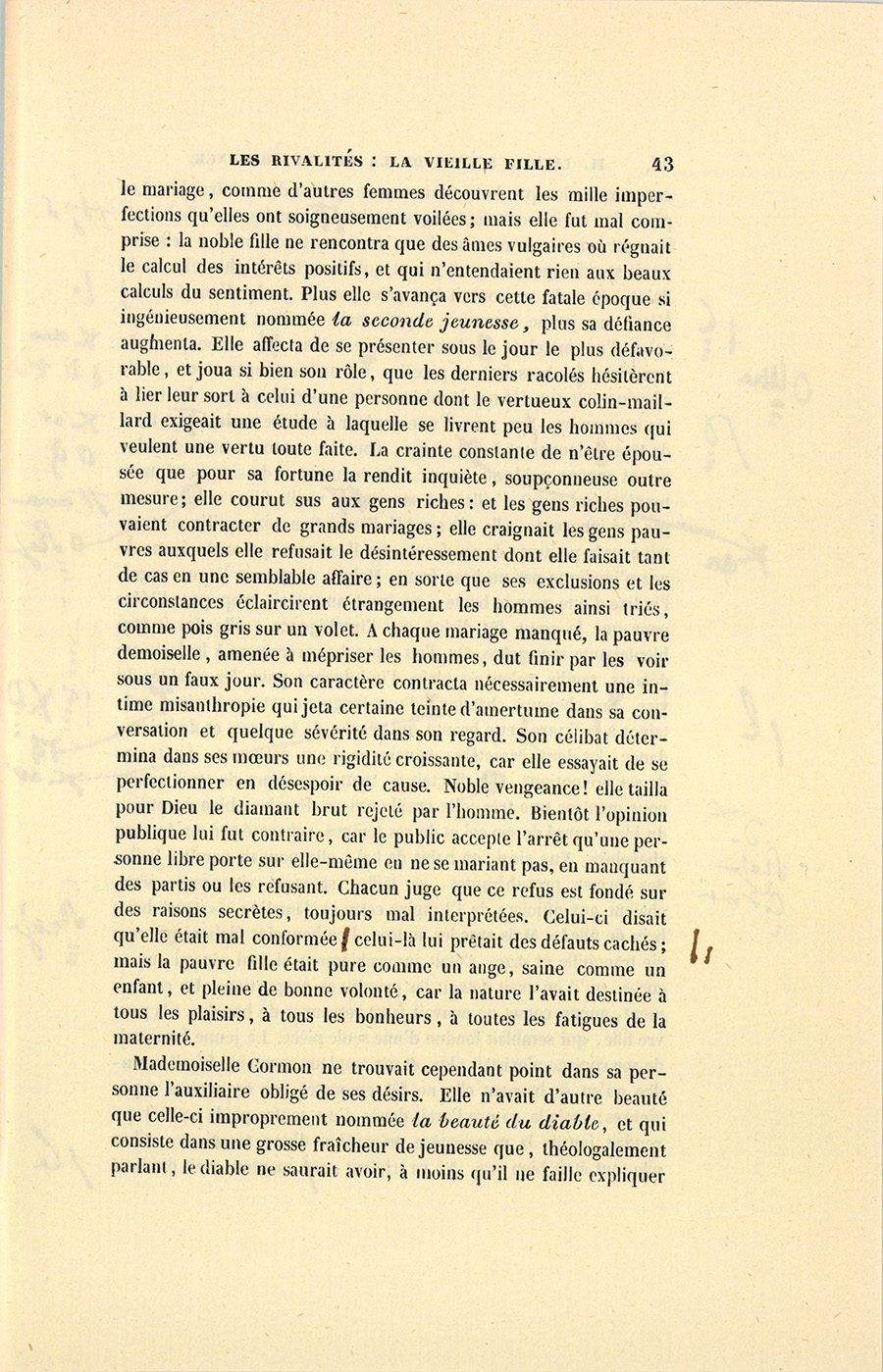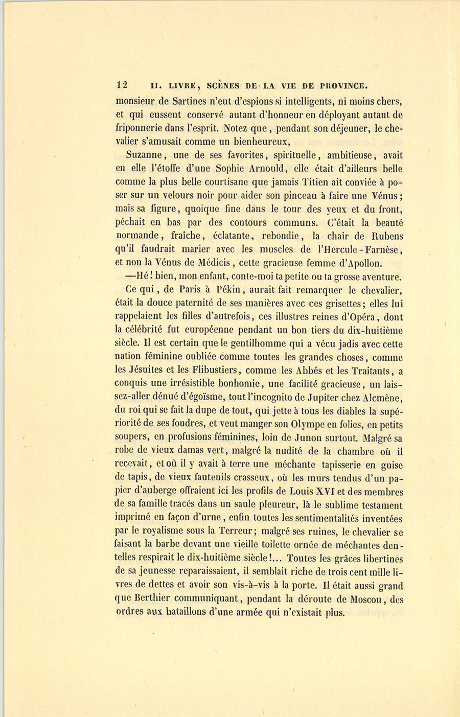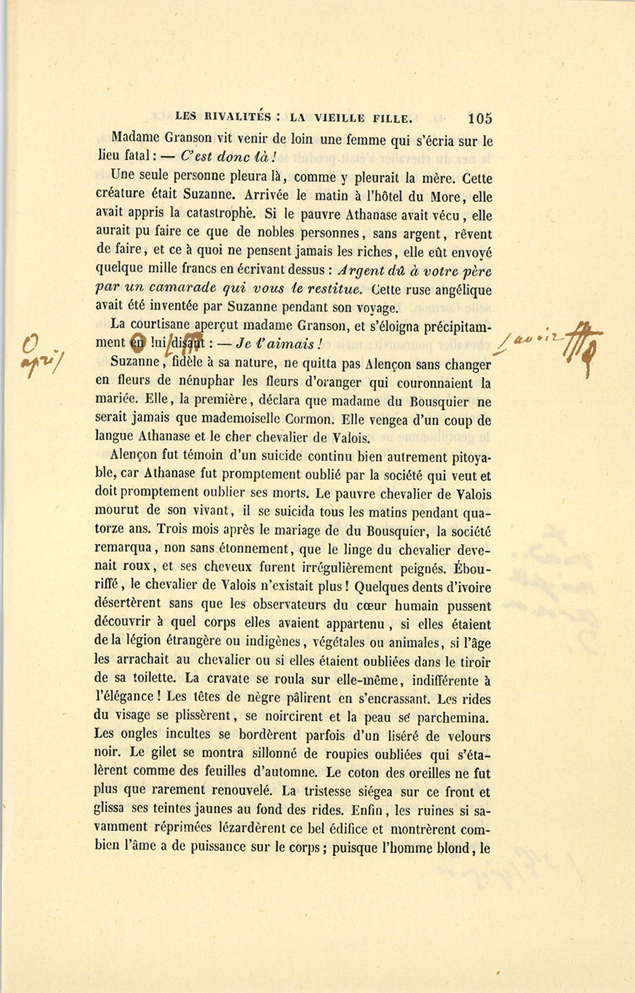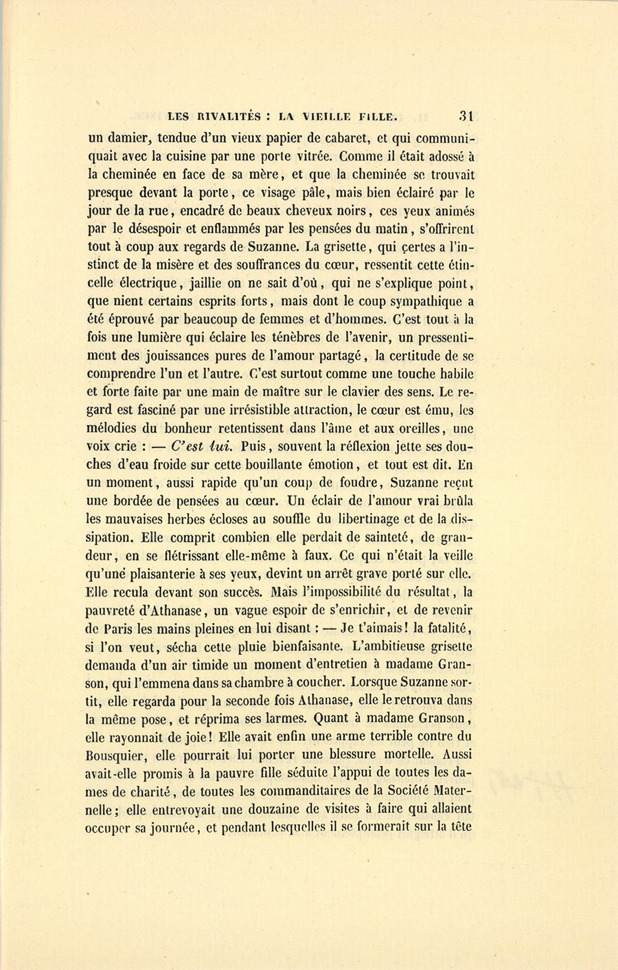 {p. 33} Maintenant il est nécessaire d’entrer chez cette vieille fille vers laquelle tant d’intérêts convergeaient, et chez qui les acteurs de cette scène devaient se rencontrer tous le soir même, à l’exception de Suzanne. Cette grande et belle personne assez hardie pour brûler ses vaisseaux, comme Alexandre, au début de la vie, et pour commencer la lutte par une faute mensongère, disparut du théâtre après y avoir introduit un violent élément d’intérêt. Ses vœux furent d’ailleurs comblés. Elle quitta sa ville natale quelques jours après, munie d’argent et de belles nippes, parmi lesquelles se trouvait une superbe robe de reps vert et un délicieux chapeau vert doublé de rose que lui donna monsieur de Valois, présent qu’elle préférait à tout, même à l’argent des dames de la Société Maternelle. Si le chevalier fût venu à Paris au moment où elle y brillait, elle eût certes tout quitté pour lui. Semblable à la chaste Suzanne de la Bible, que les vieillards avaient à peine entrevue, elle s’établissait heureuse et pleine d’espoir à Paris, pendant que tout Alençon déplorait ses malheurs pour lesquels les dames des deux Sociétés de Charité et de Maternité manifestèrent une vive sympathie. Si Suzanne peut offrir une image de ces belles normandes qu’un savant médecin a comprises pour un tiers dans la consommation que fait en ce genre le monstrueux Paris, elle resta dans les régions les plus élevées et les plus décentes de la galanterie. Par une époque où, comme le disait monsieur de Valois, la Femme n’existait plus, elle fut seulement madame du Valnoble ; autrefois elle eût été la rivale des Rhodope, des Impéria, des Ninon. Un des écrivains les plus distingués de la Restauration l’a prise sous sa protection ; peut-être l’épousera-t-il ? il est journaliste, et partant au-dessus de l’opinion, puisqu’il en fabrique une nouvelle tous les six ans.